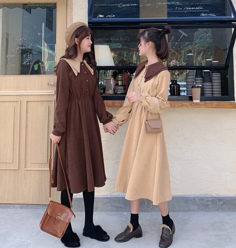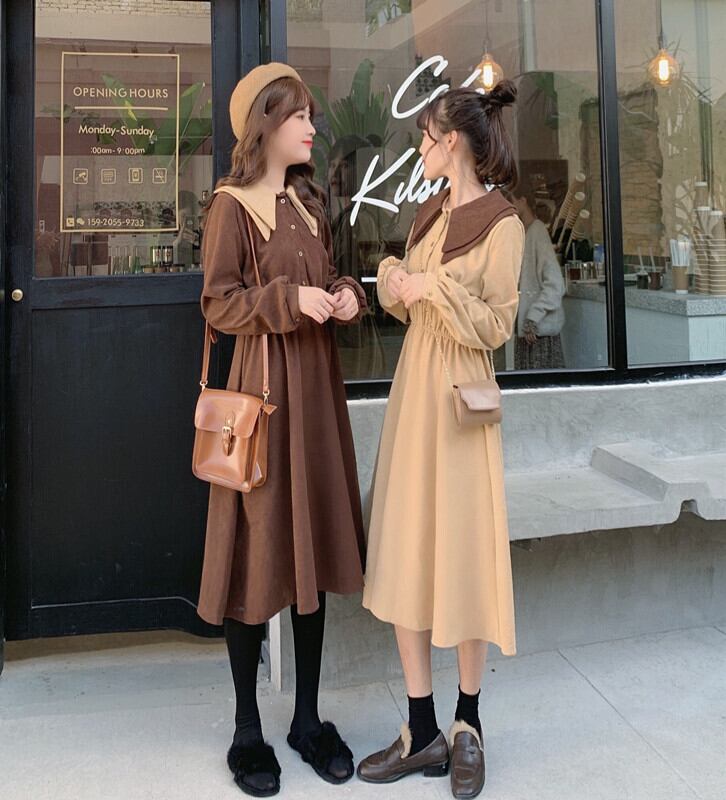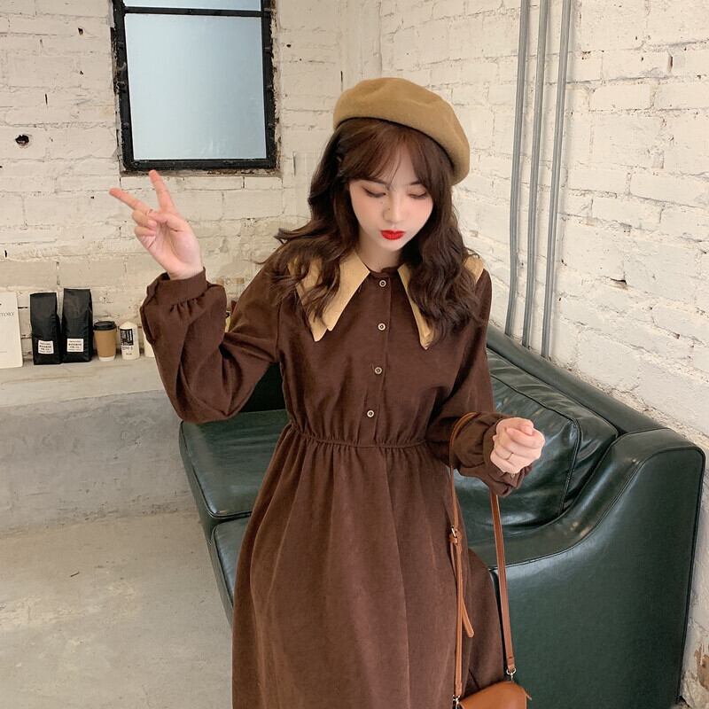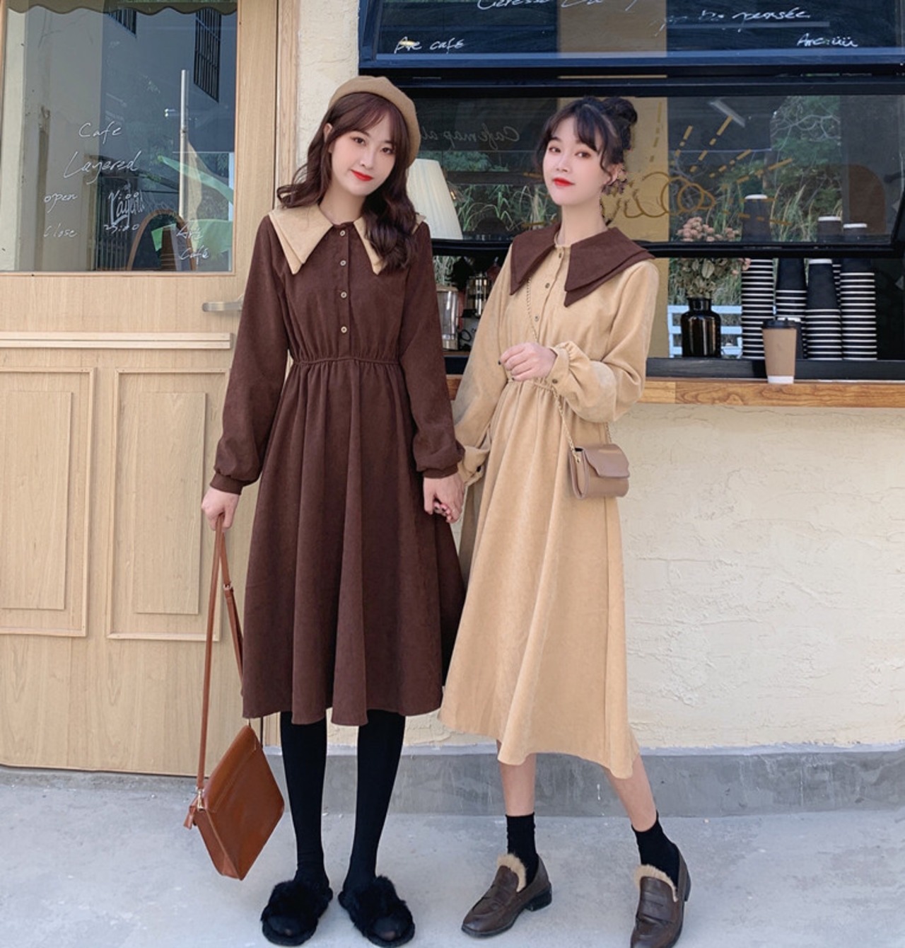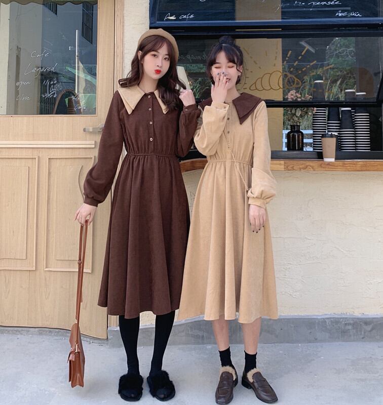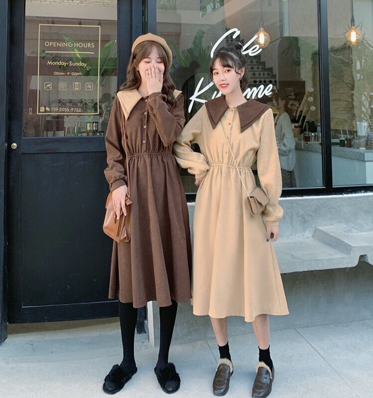 全2色 シャツワンピース ドレス ビックカラー 長袖 ブラウン ベージュ 秋 冬 大人かわいい 学生 通学 カジュアル デート 女子会 韓国 オルチャン レトロ フェミニン