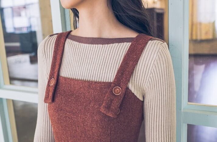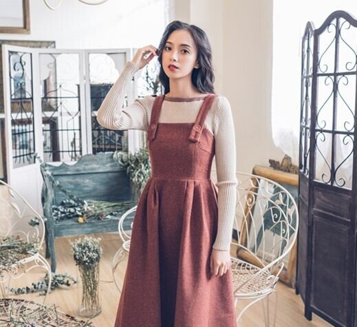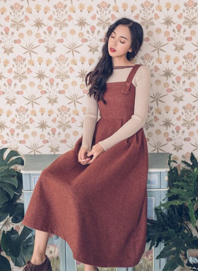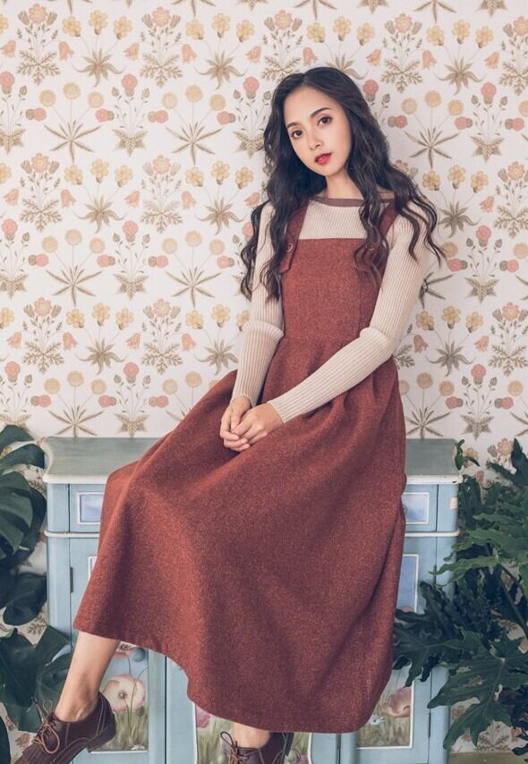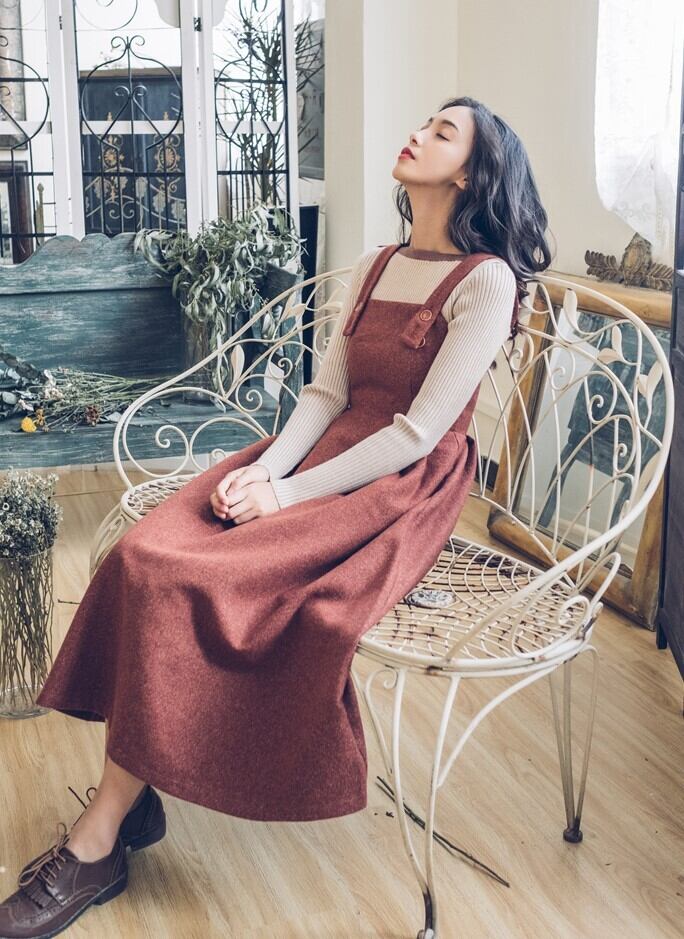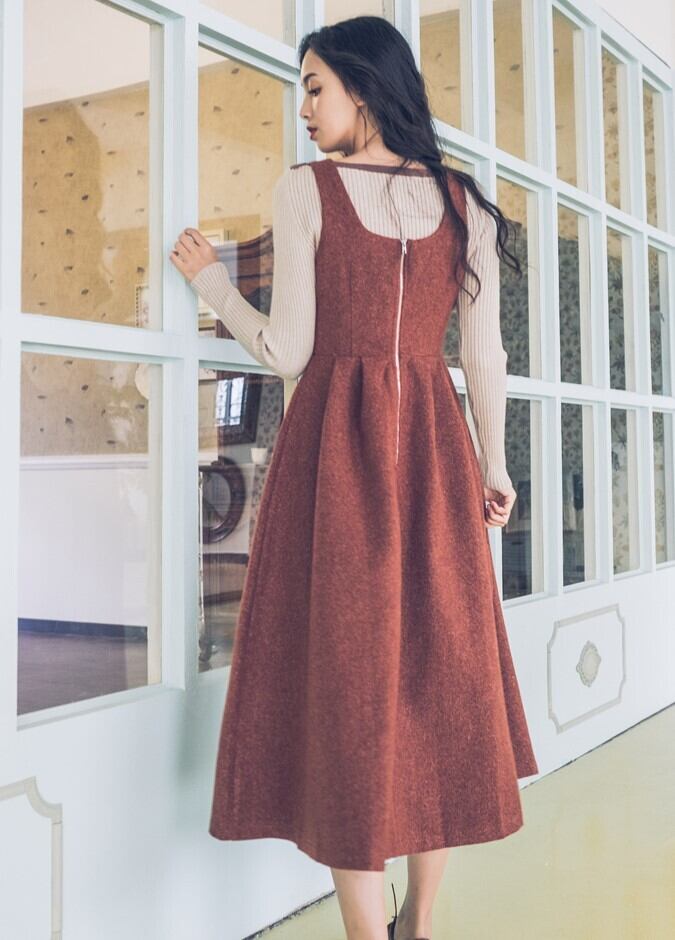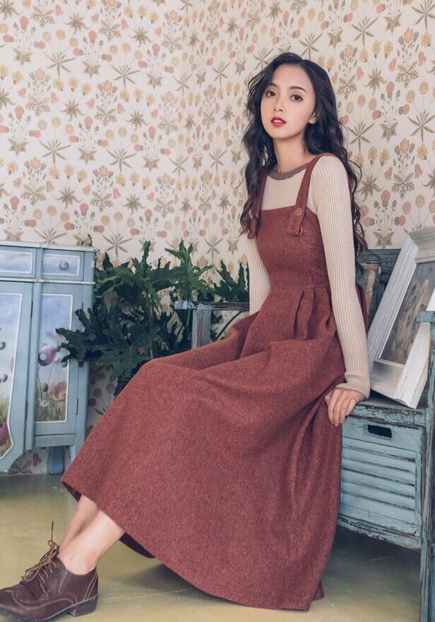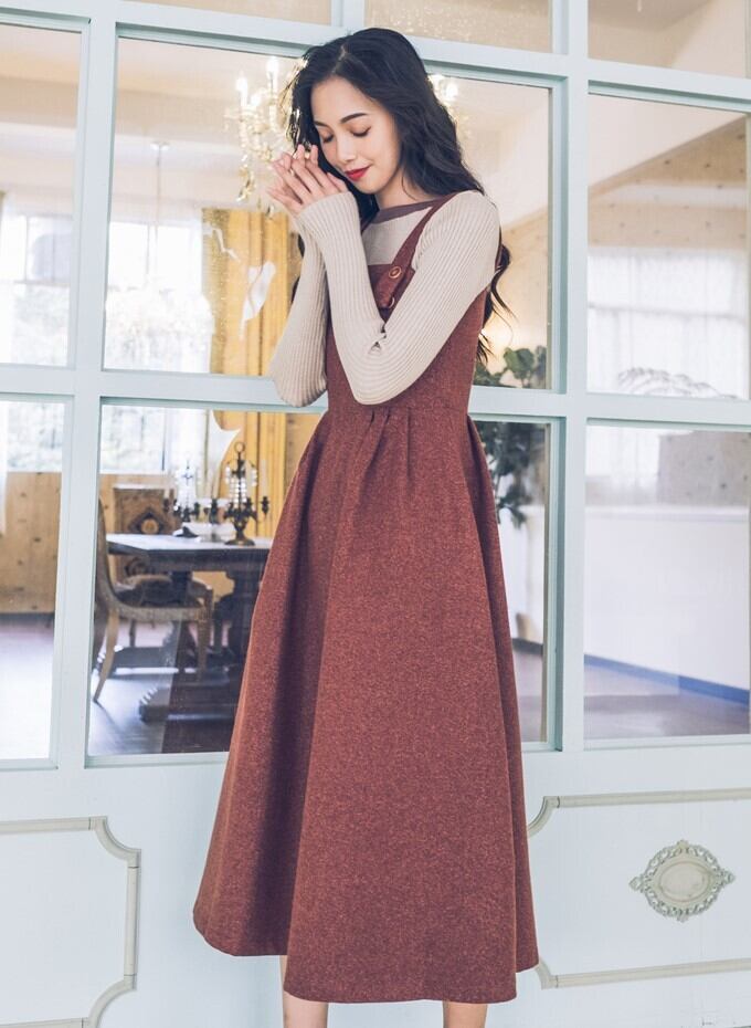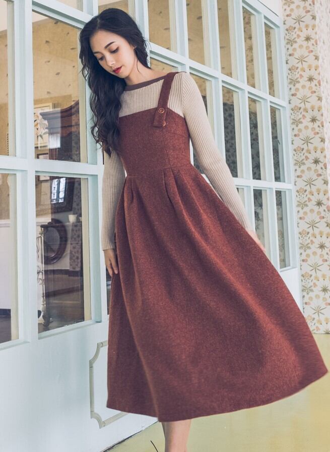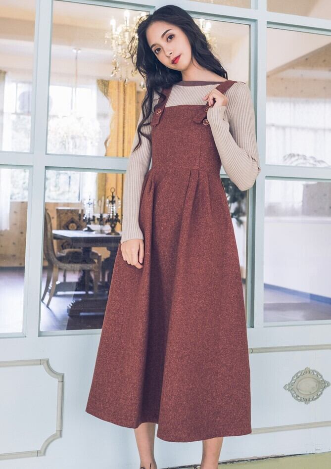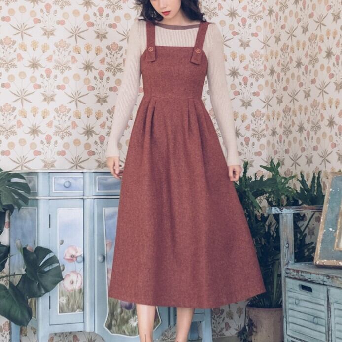 ジャンパースカート ストラップドレス バックファスナー レッド ロング丈 秋 冬 レトロ フェミニン 大人カジュアル 休日コーデ デート 韓国 オルチャン