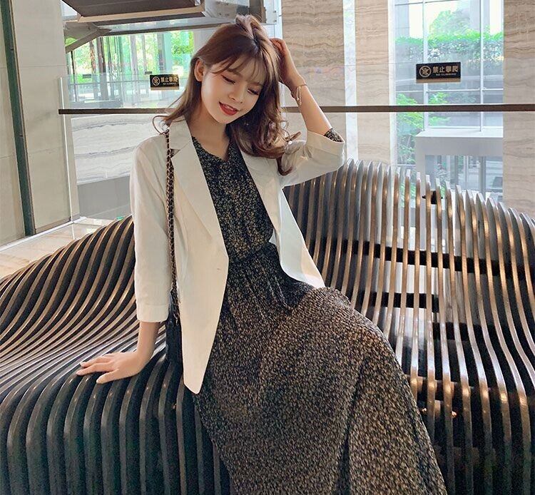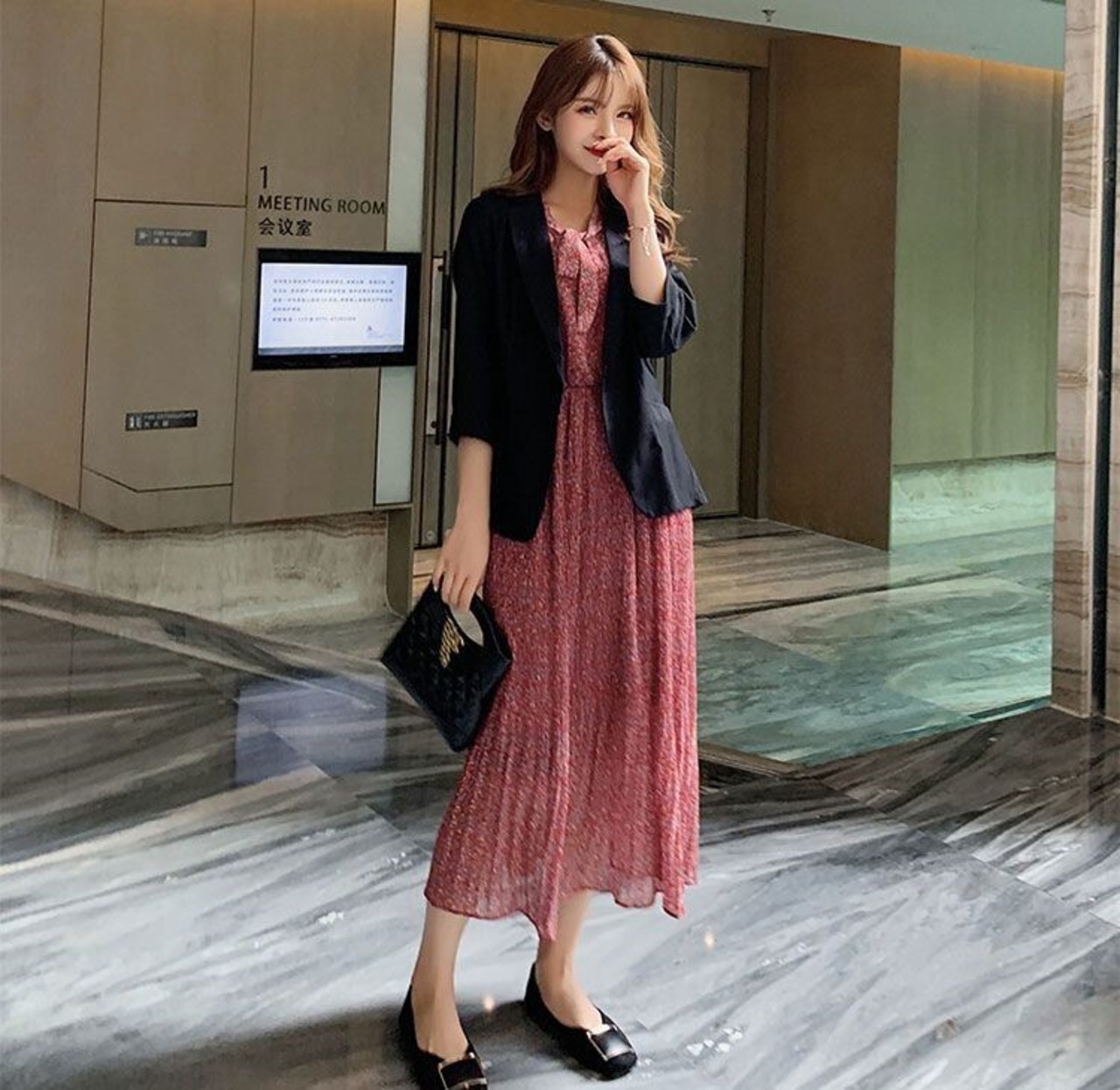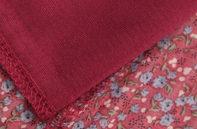 花柄ワンピースはハイネックでひざ丈タイプ。