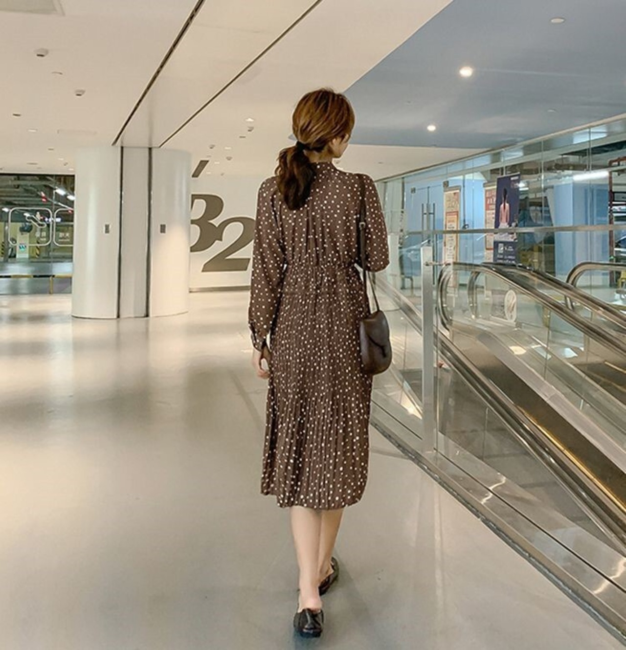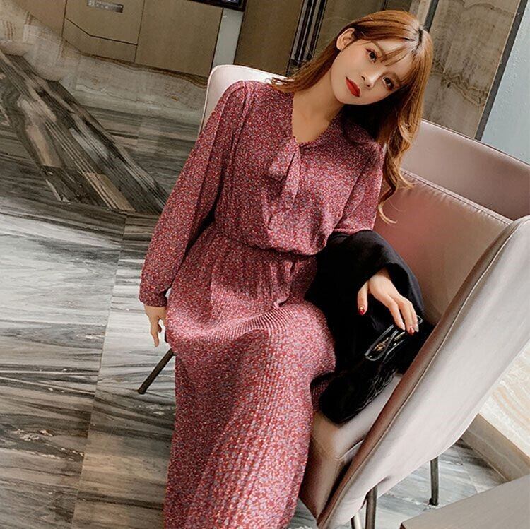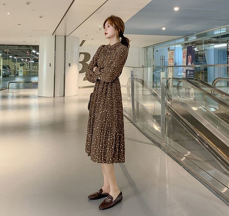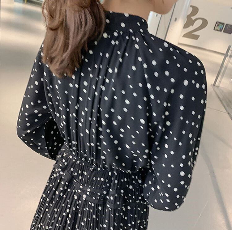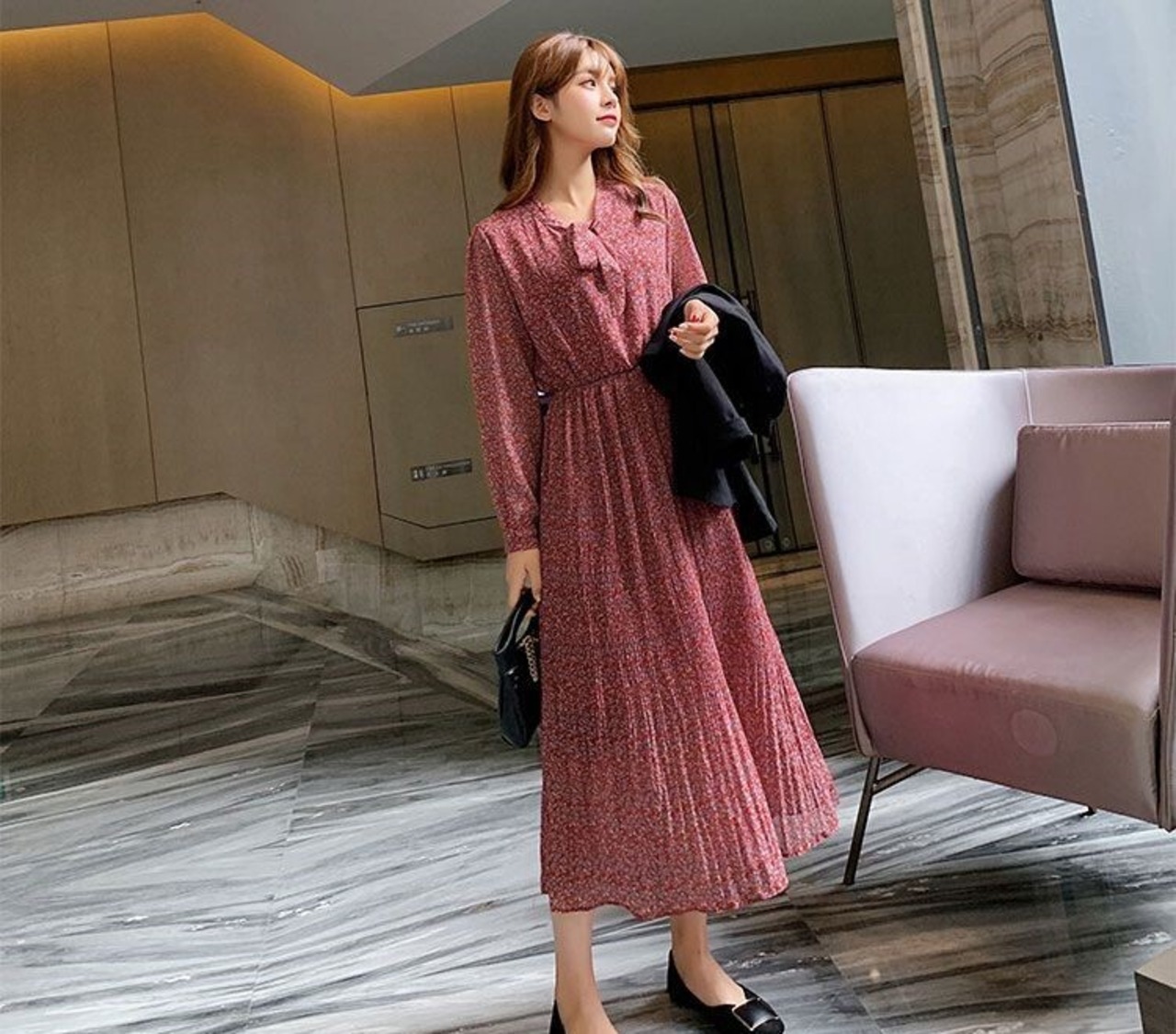 全4色 選べるワンピース 選べる丈 シフォンドレス ボウタイ ハイネック 長袖 ドレス プリーツ 水玉 花柄 秋 冬 エレガント 上品 ピンク ブラック ブラウン 韓国 オルチャン