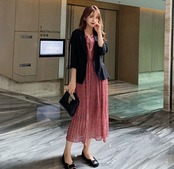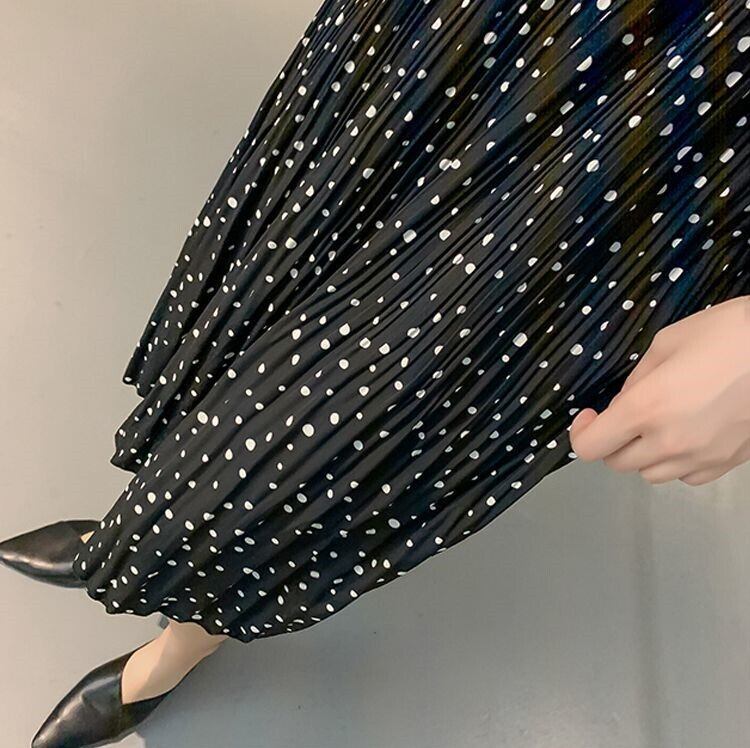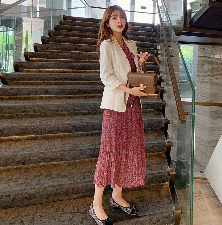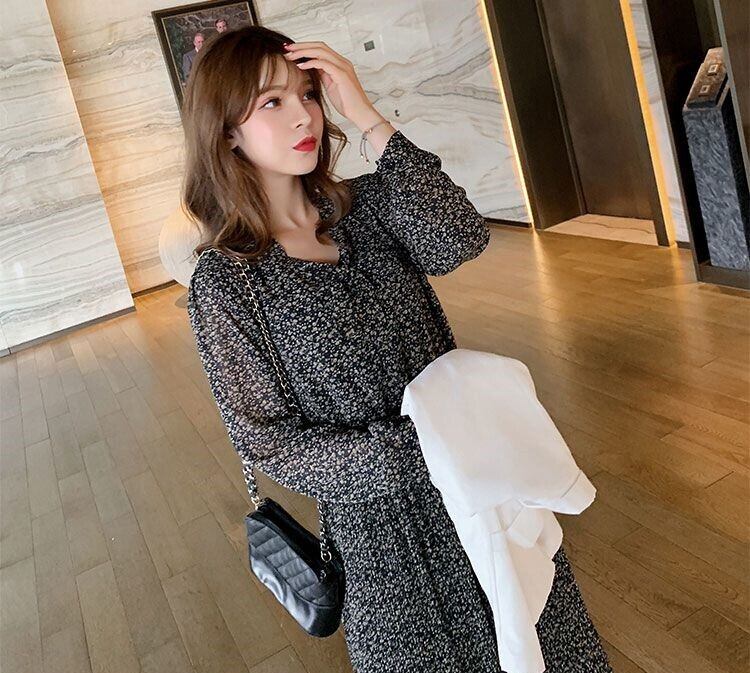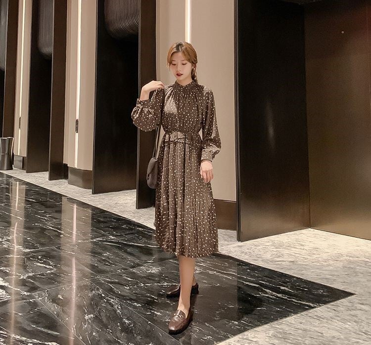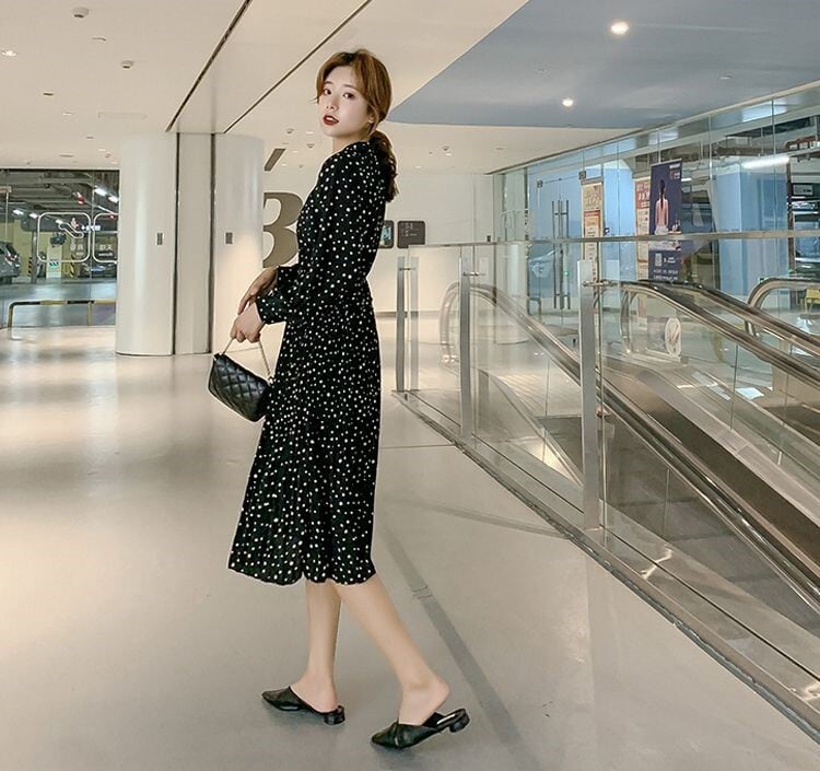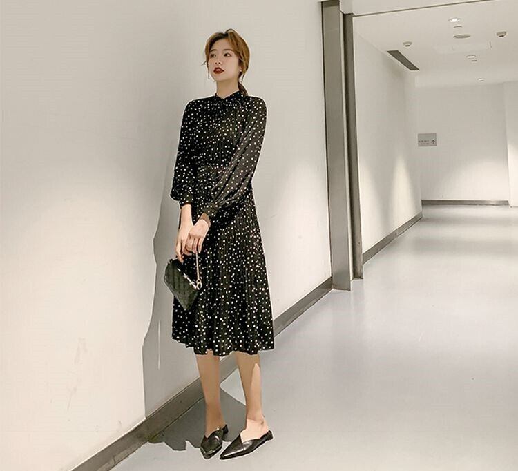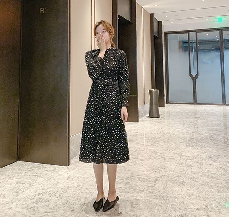 全4色 選べるワンピース 選べる丈 シフォンドレス ボウタイ ハイネック 長袖 ドレス プリーツ 水玉 花柄 秋 冬 エレガント 上品 ピンク ブラック ブラウン 韓国 オルチャン