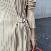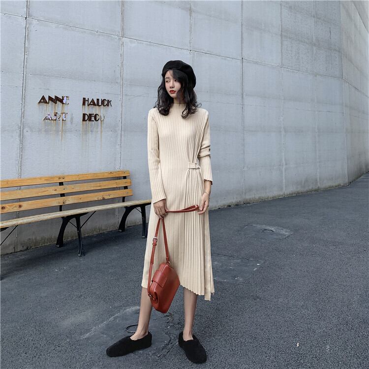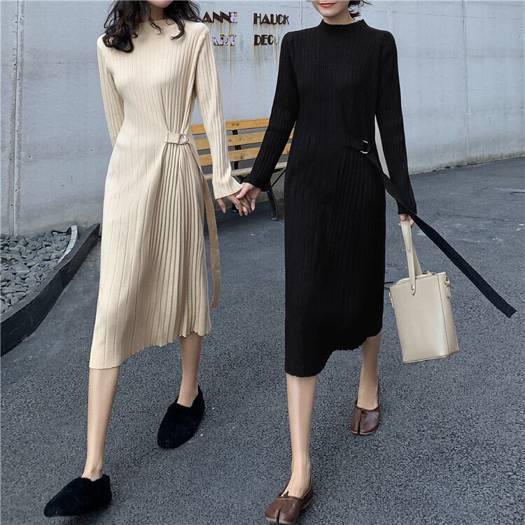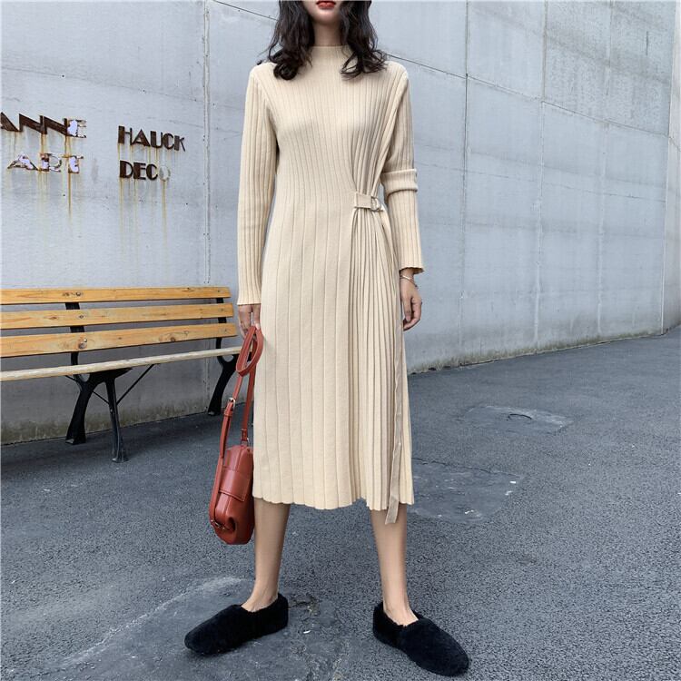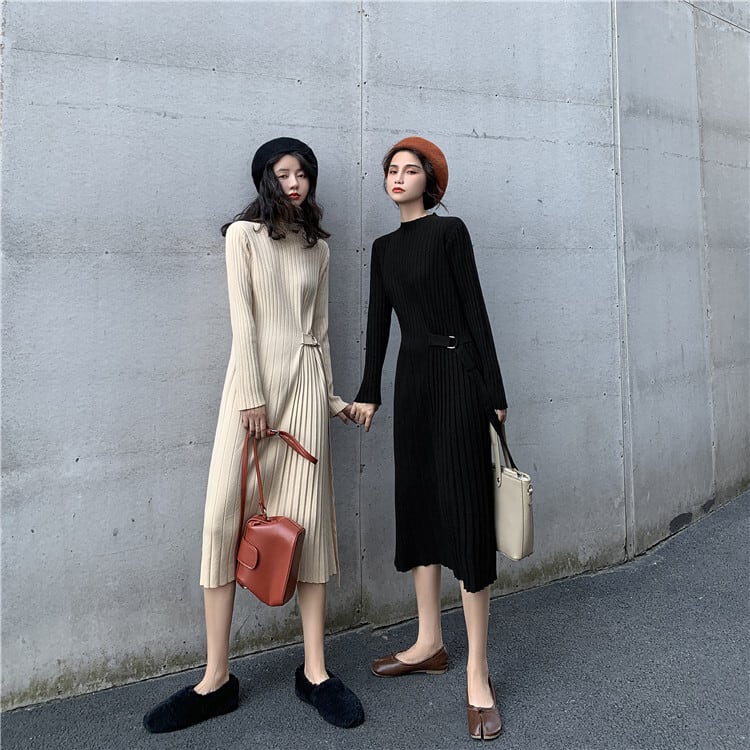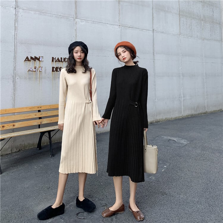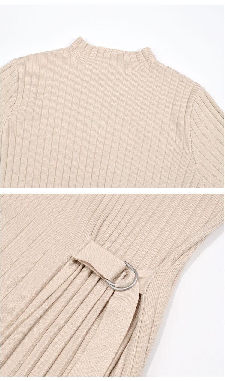 全2色 ニットワンピース プリーツドレス サイドプリーツ ハイネック 長袖 リブニット 秋 冬 アプリコット ブラック 大人カジュアル エレガント 上品 韓国 オルチャン