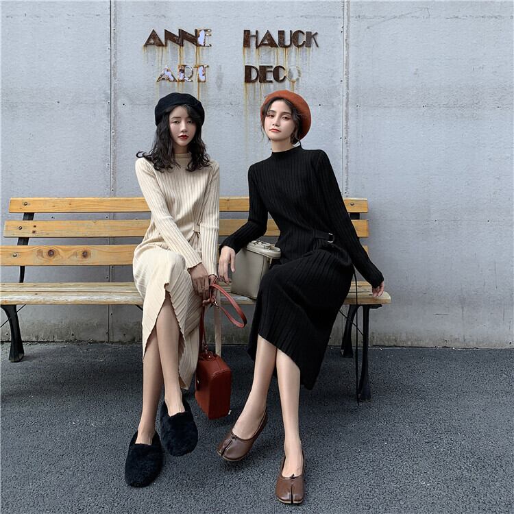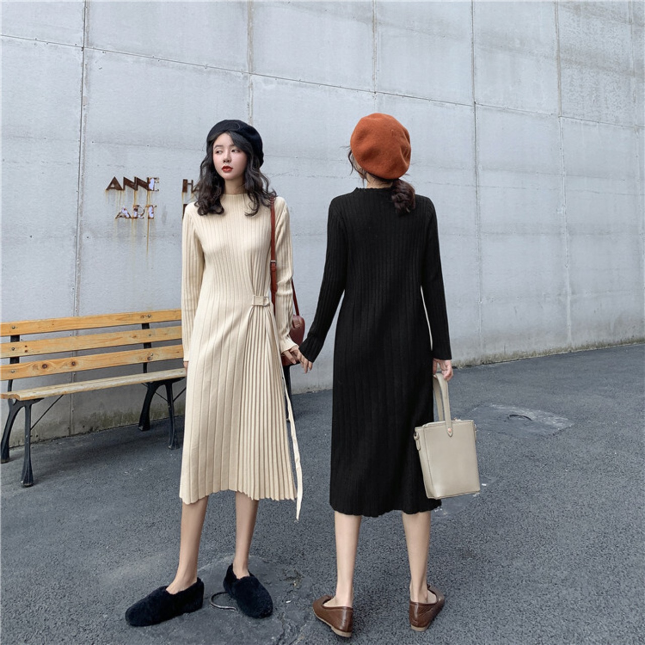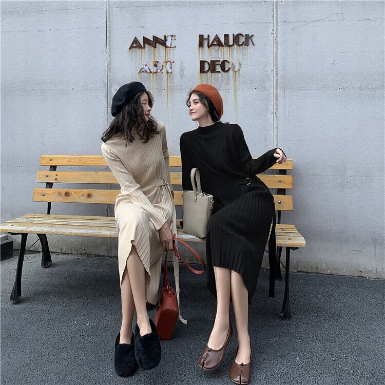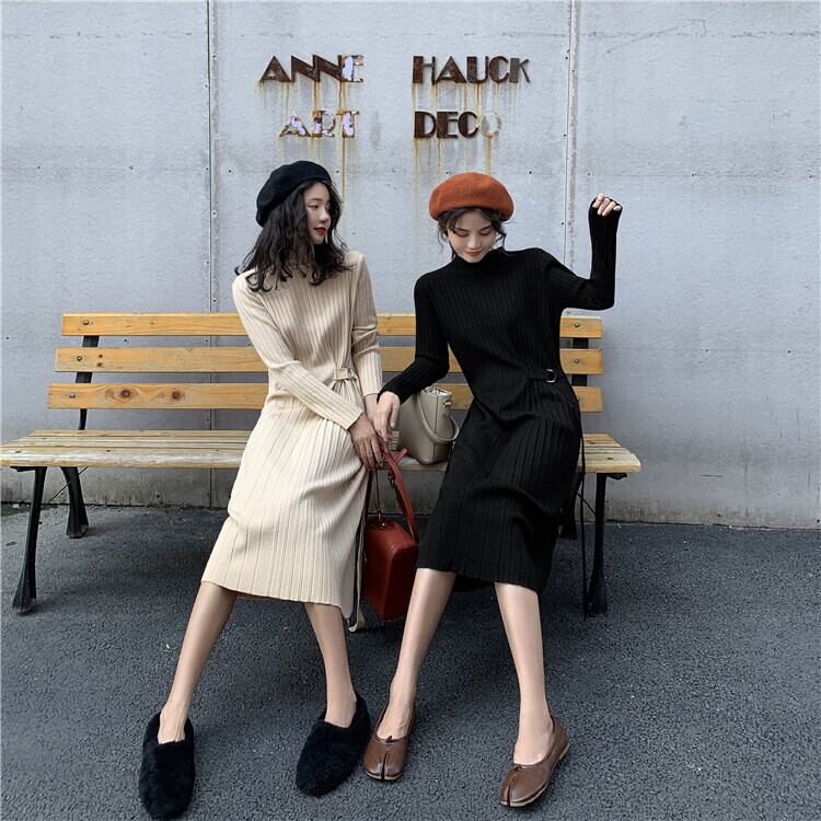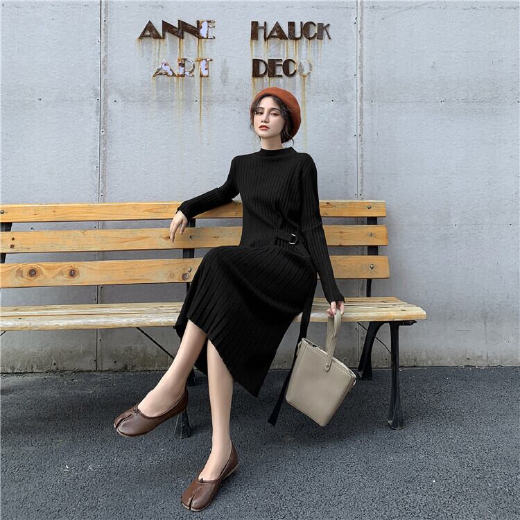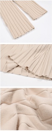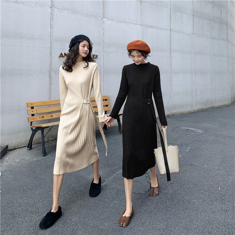 全2色 ニットワンピース プリーツドレス サイドプリーツ ハイネック 長袖 リブニット 秋 冬 アプリコット ブラック 大人カジュアル エレガント 上品 韓国 オルチャン