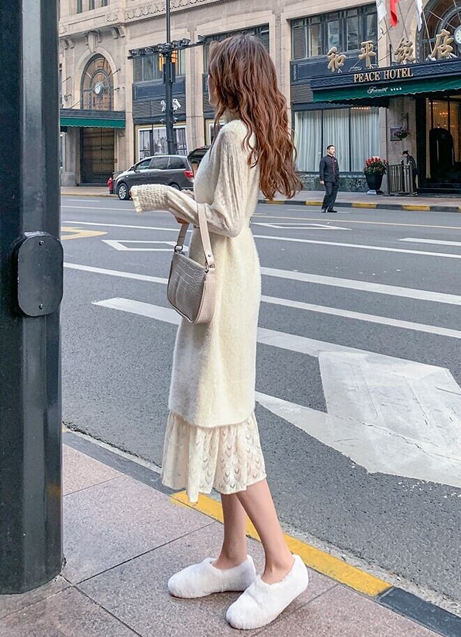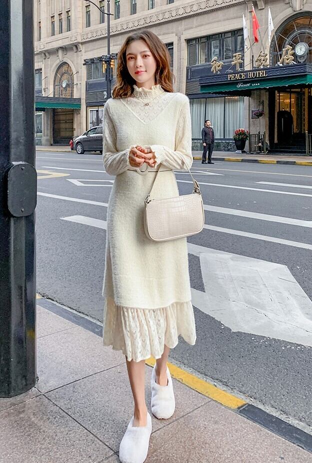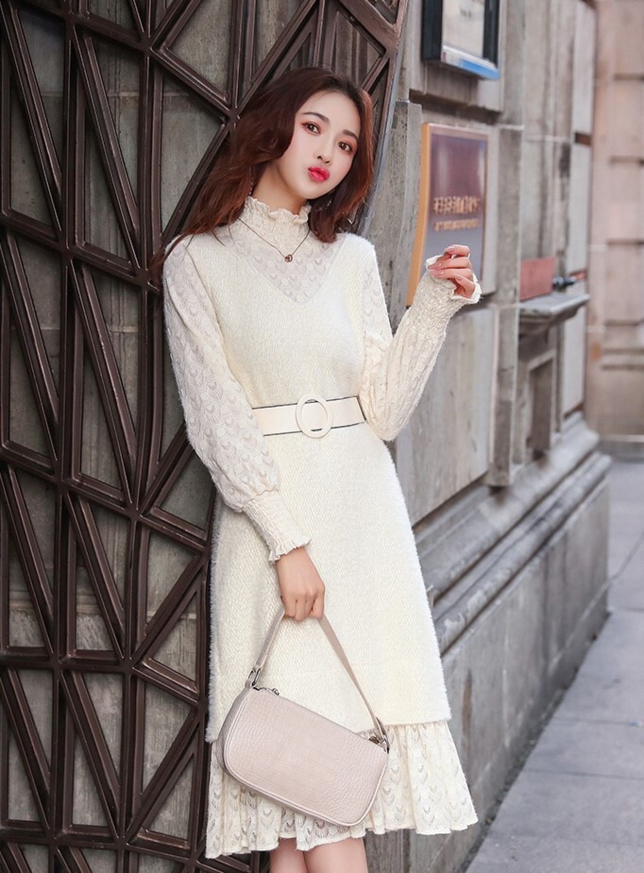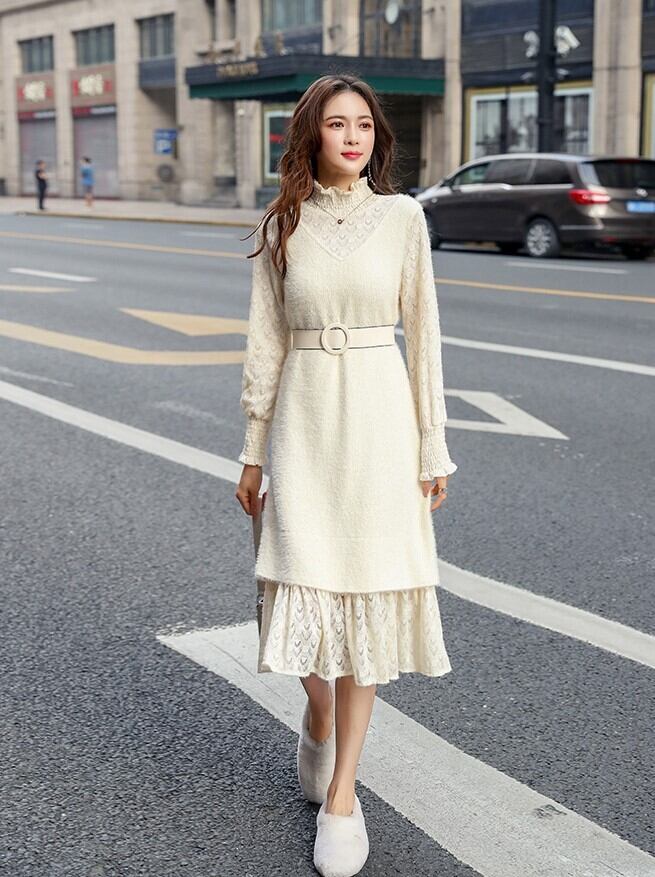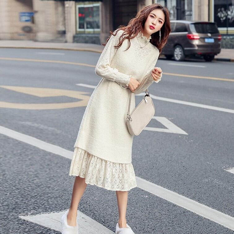 全3色 ドッキングワンピース ニットドレス レース フリル オフホワイト ピンク ベージュ 秋 冬 長袖 ハイネック ひざ丈 韓国 オルチャン フェミニン 上品 エレガント