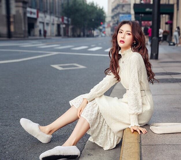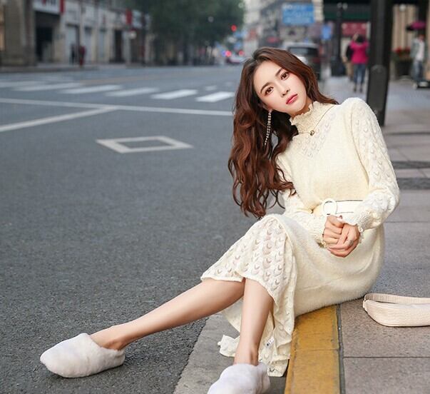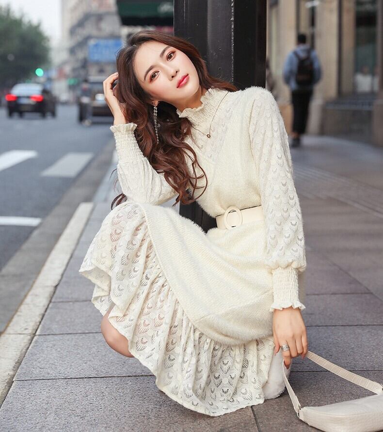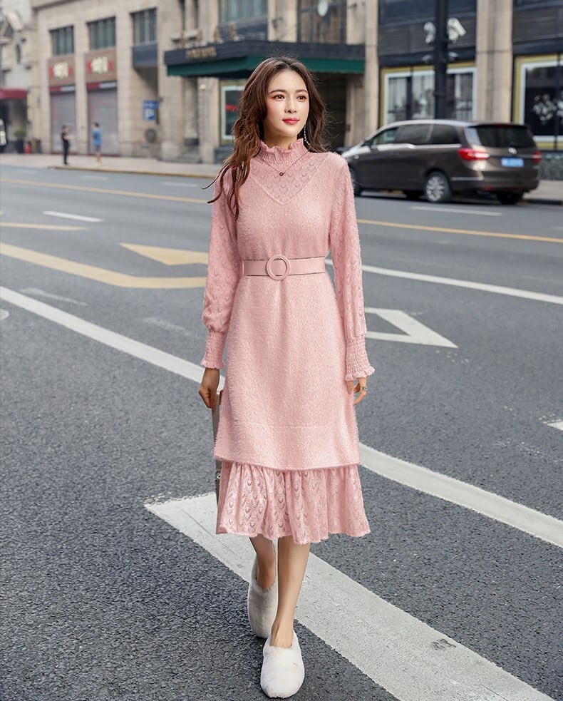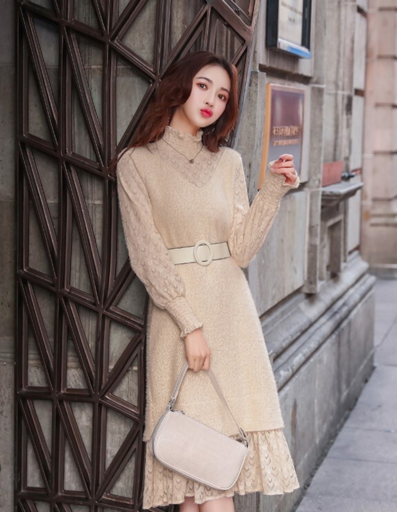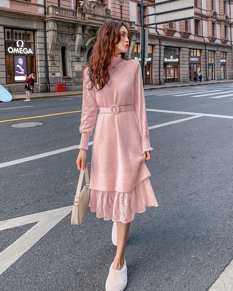 全3色 ドッキングワンピース ニットドレス レース フリル オフホワイト ピンク ベージュ 秋 冬 長袖 ハイネック ひざ丈 韓国 オルチャン フェミニン 上品 エレガント