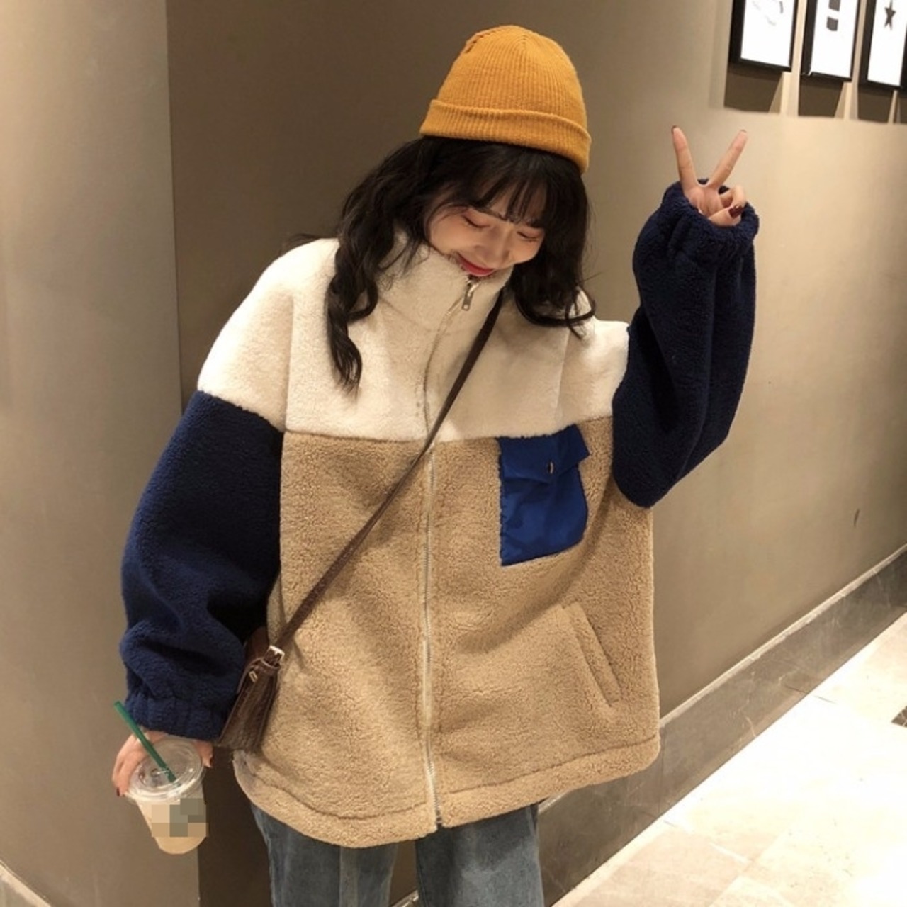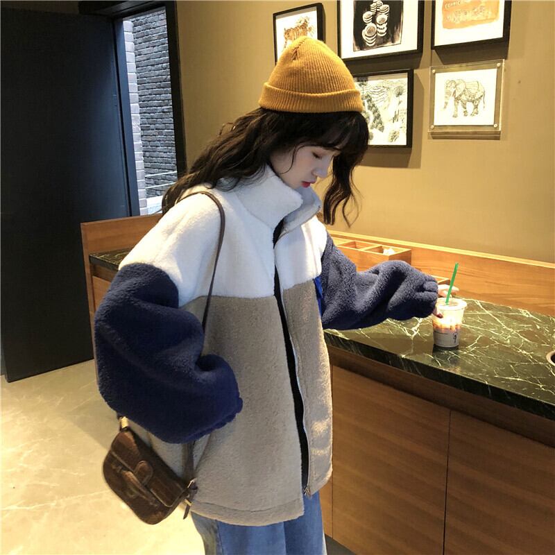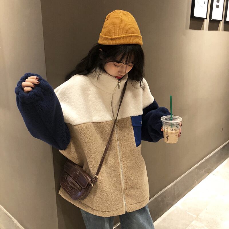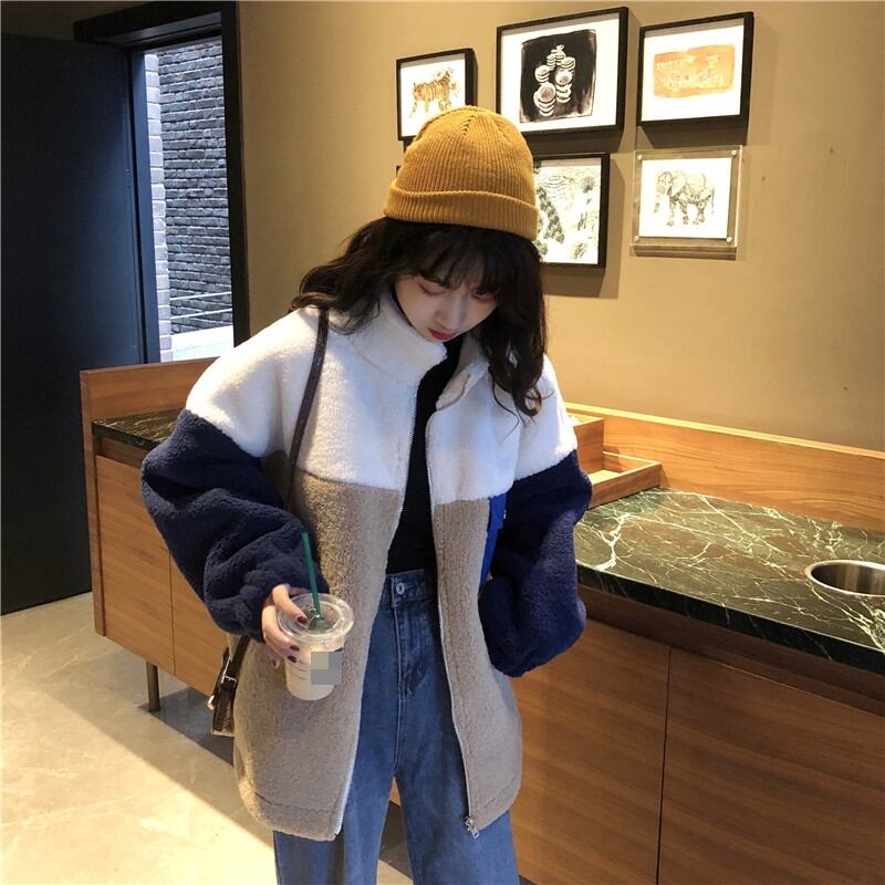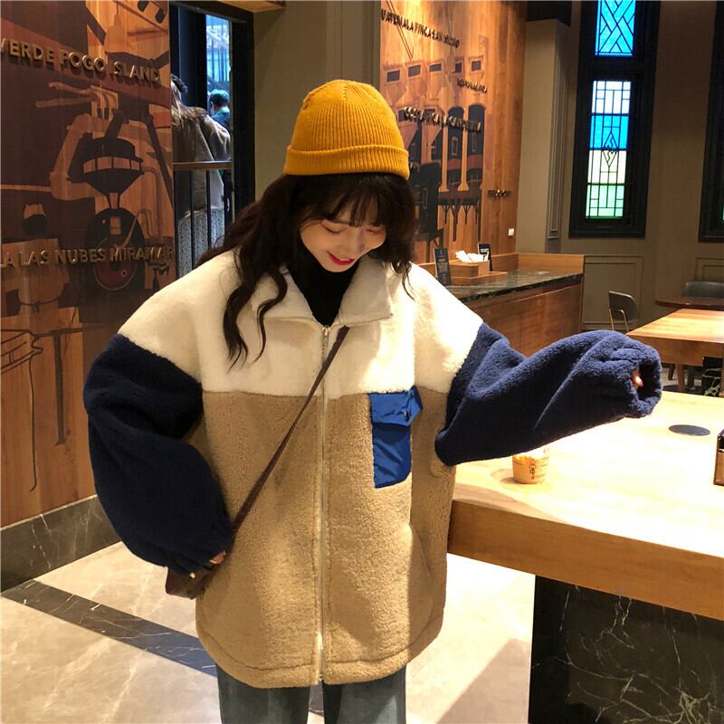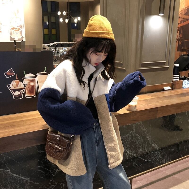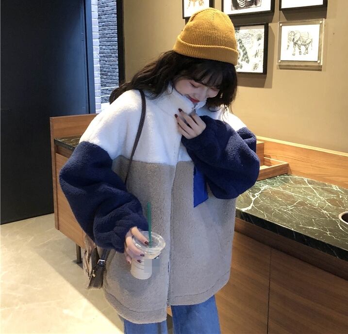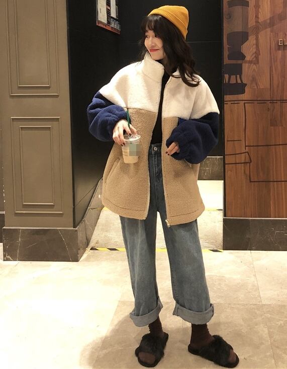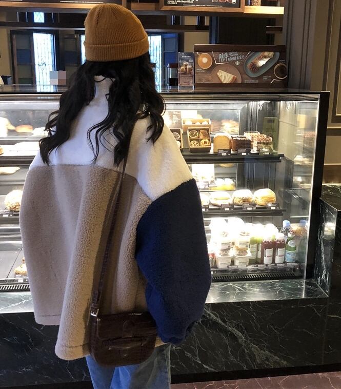 ボアジャケット ジャケット アウター もこもこ 暖かい カジュアル 配色 デイリー ゆったり オーバーサイズ ロングスリーブ 通学 ラフ 秋 冬