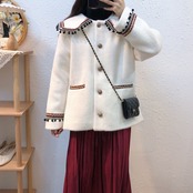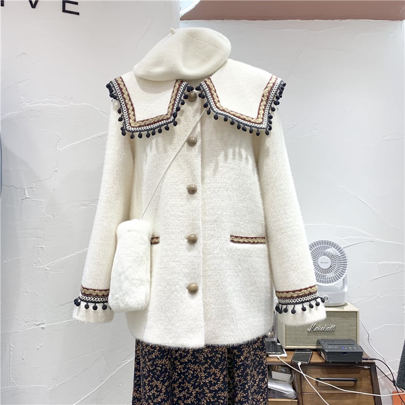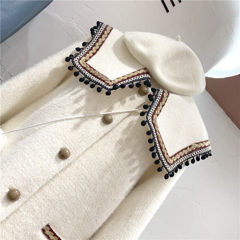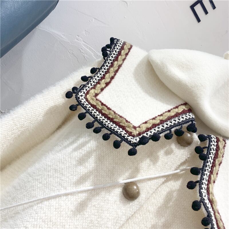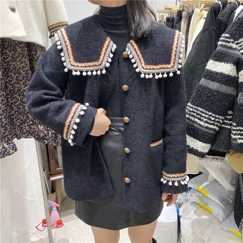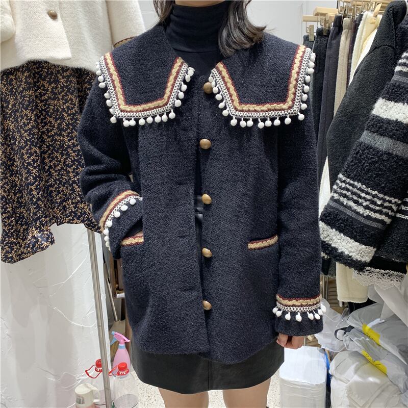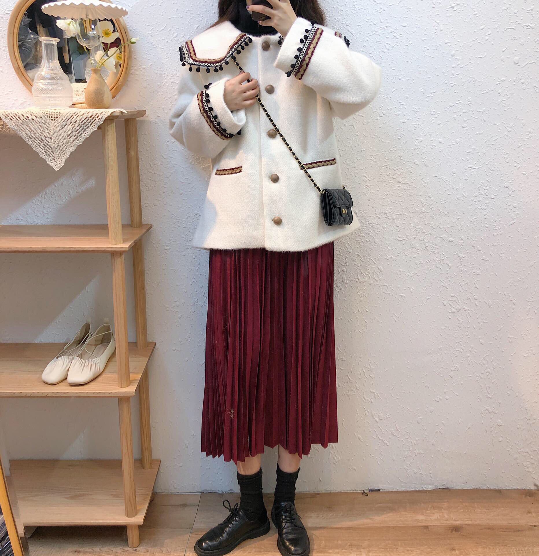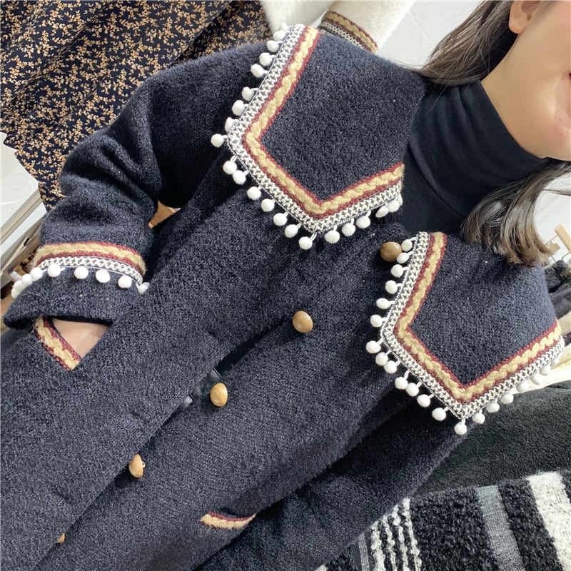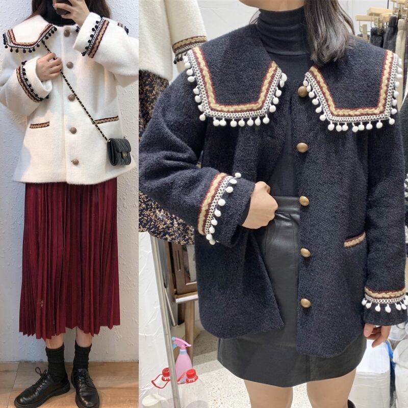 全2色 ウールコート 大きめ襟 ボタン 腰丈 ミディアム丈 ファーコート メルトンコート ステッチ ポンポン 秋冬 お出かけ デート 女子会 きれいめ カジュアル エレガント 上品 大人可愛い ガーリー 無地