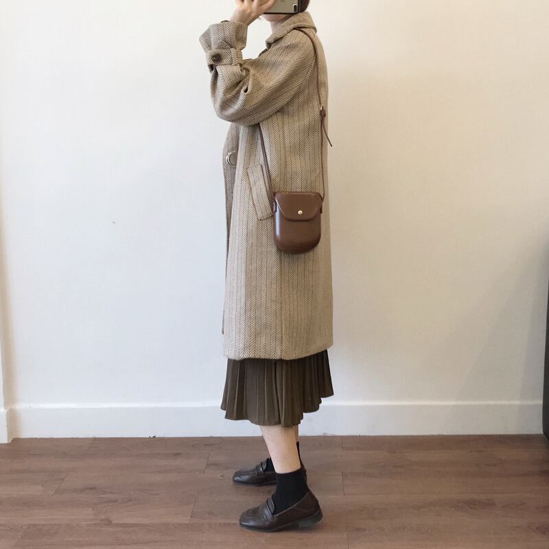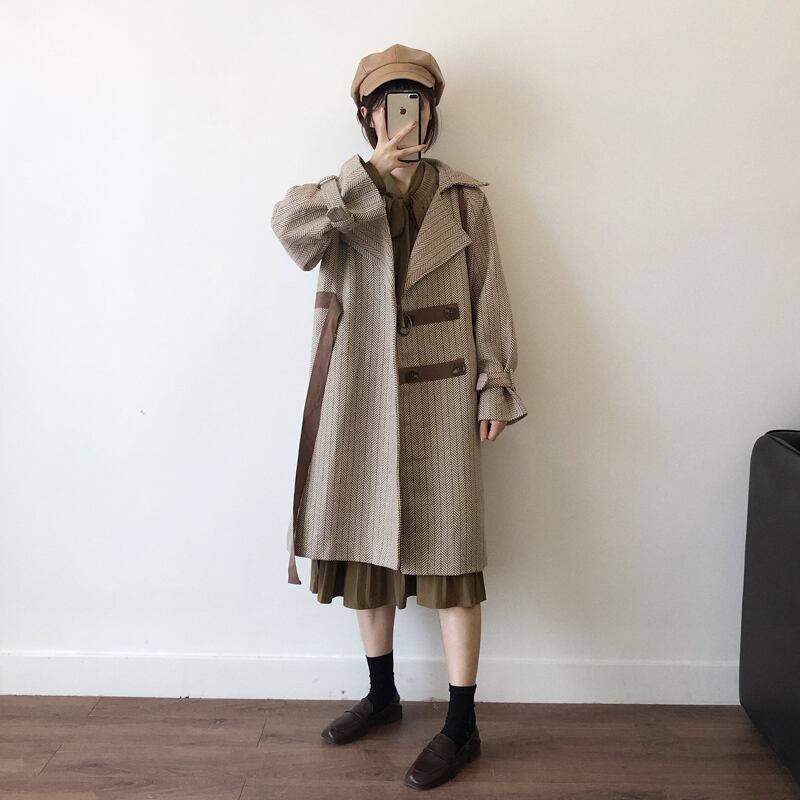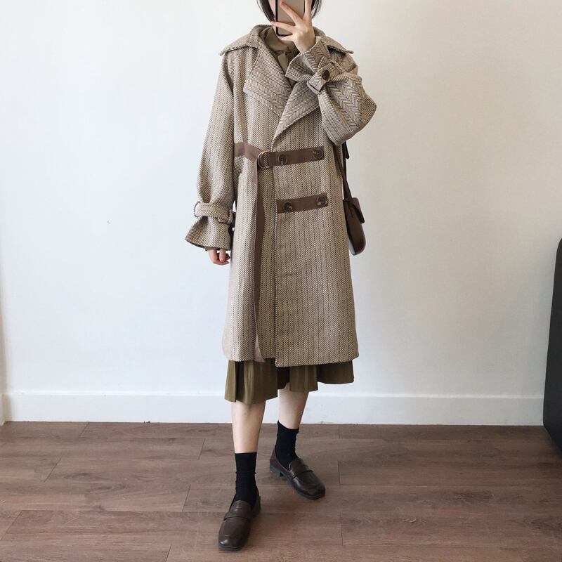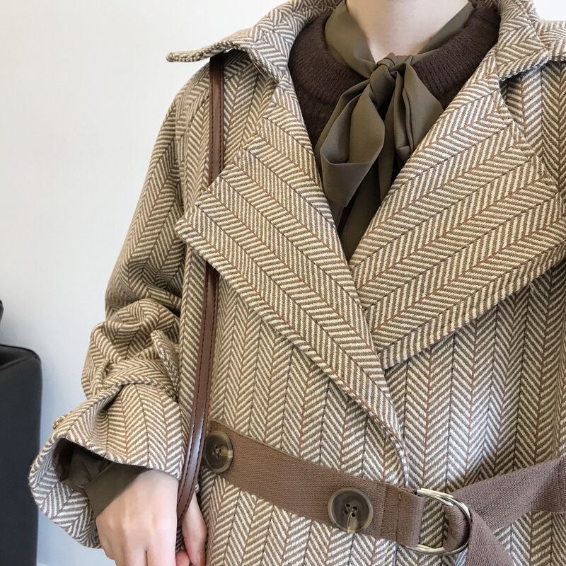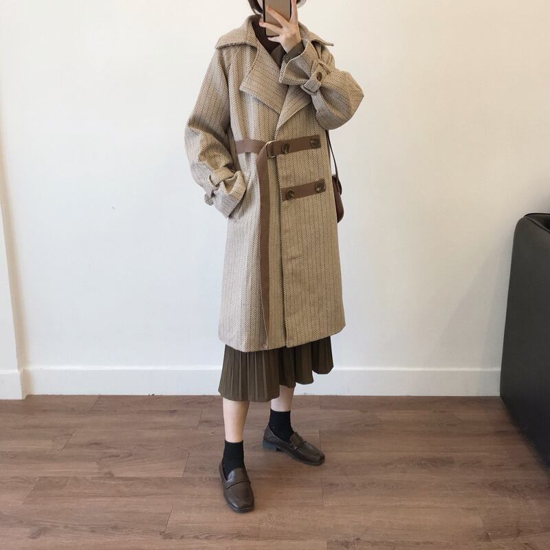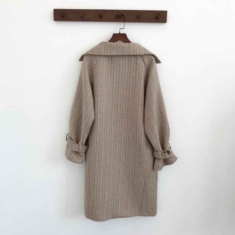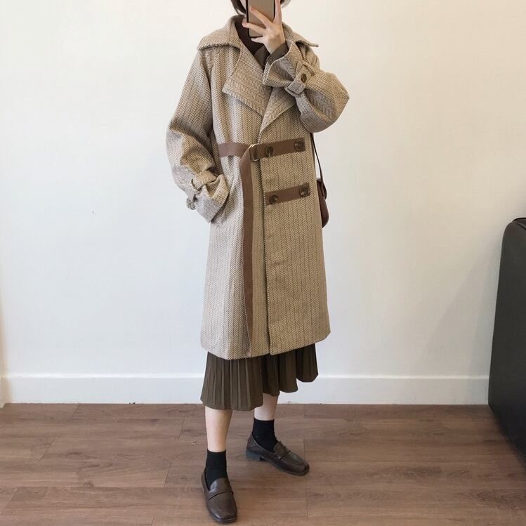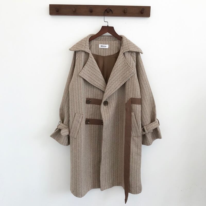 テーラードコート ベルト ベイクドカラー ヘリンボーン キャンディースリーブ 体型カバー ロング丈 秋冬 お出かけ 女子会 デート カジュアル きれいめ エレガント 上品 大人可愛い クール モード