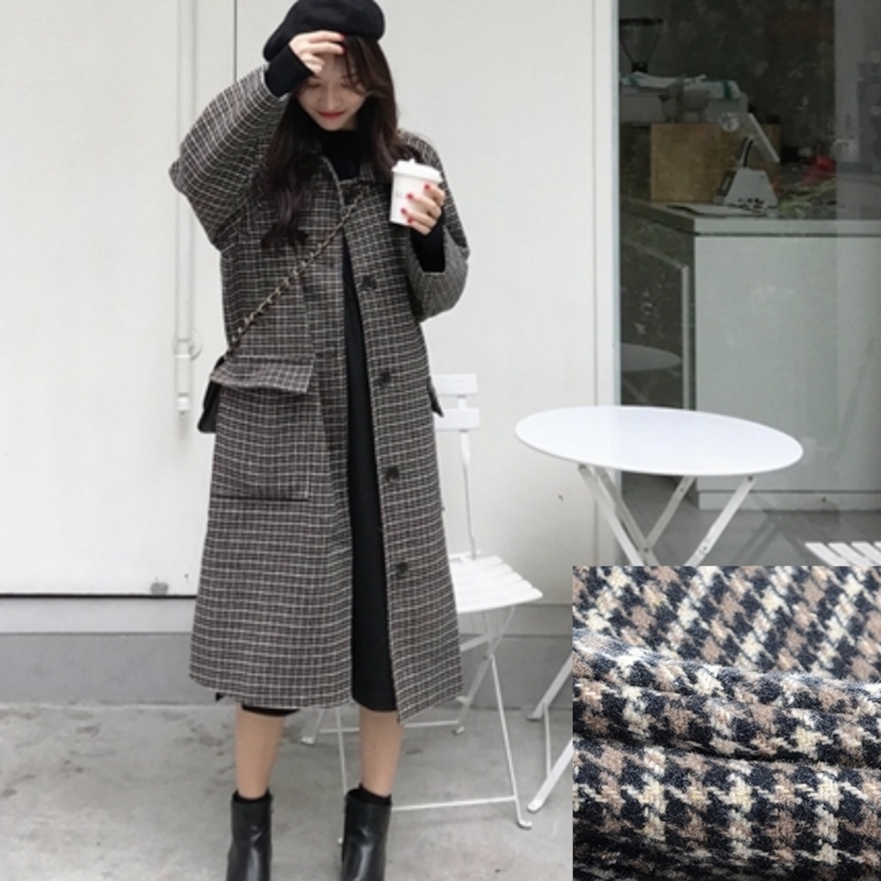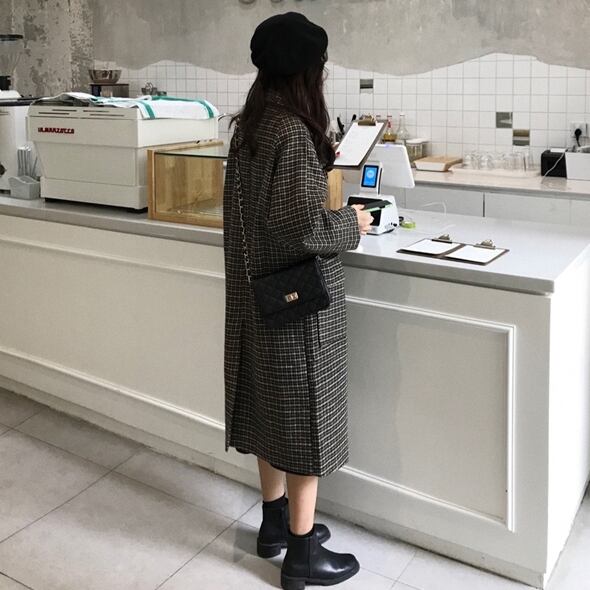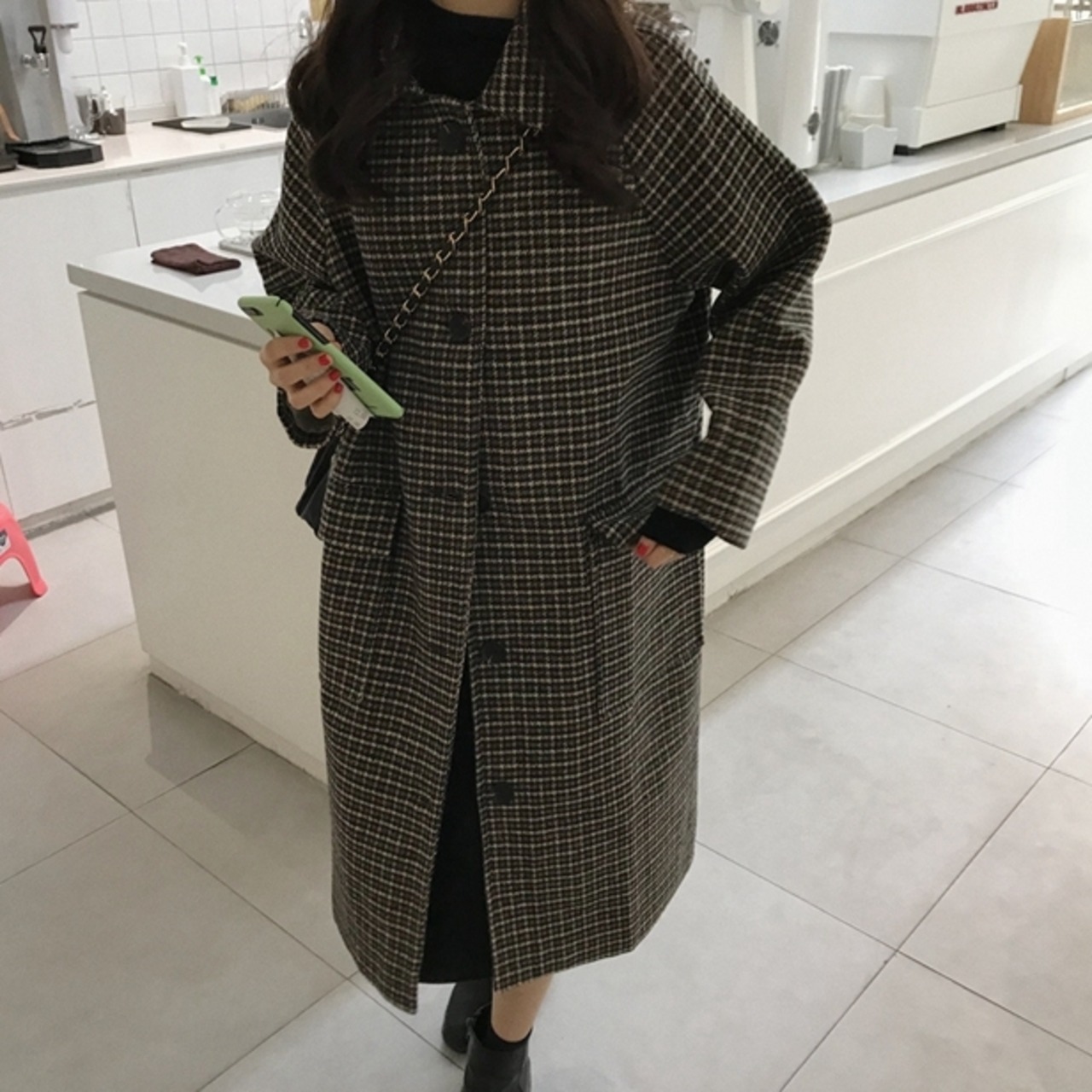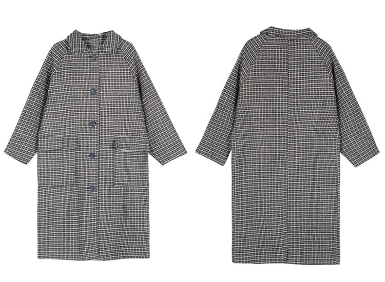 千鳥格子柄のステンカラーコートです。