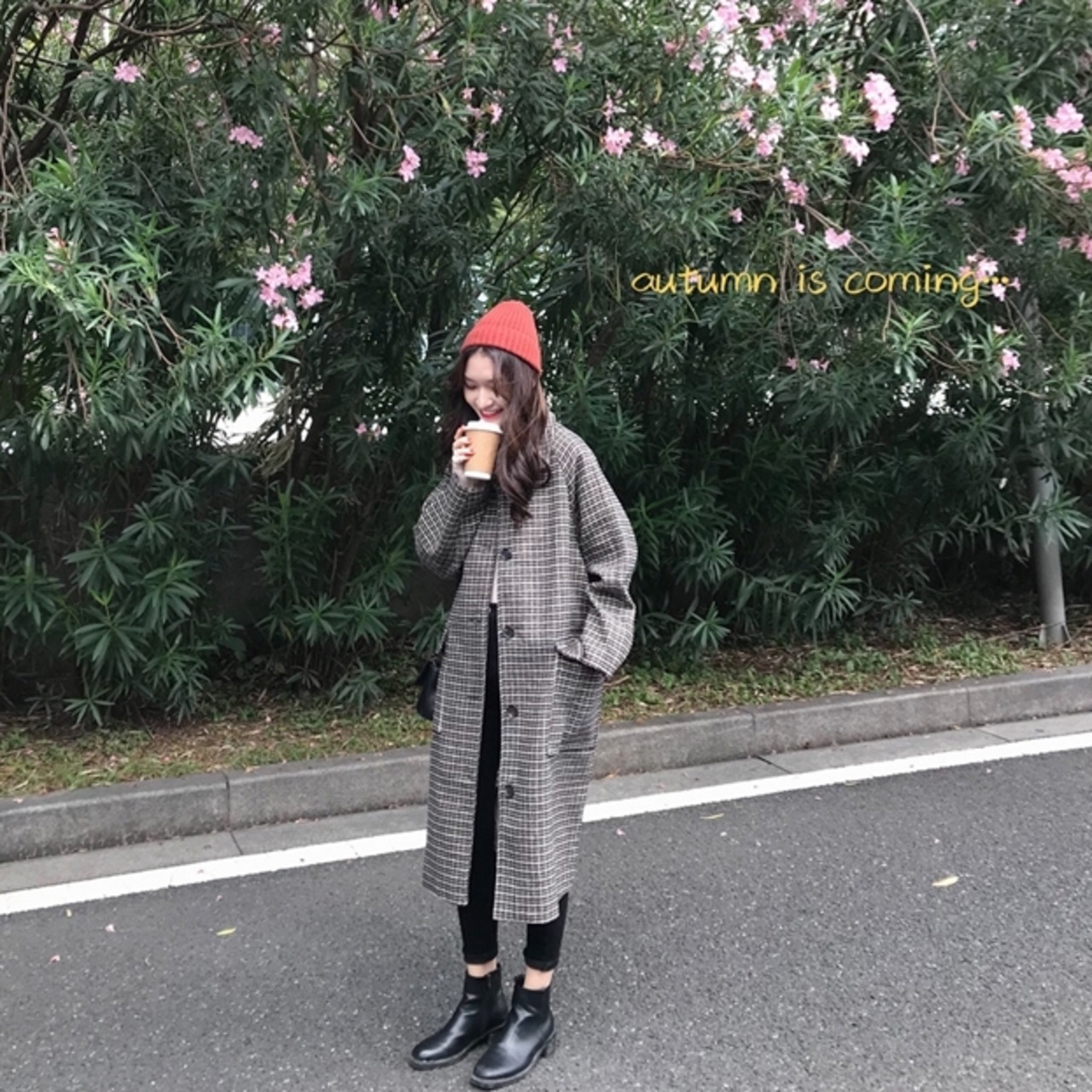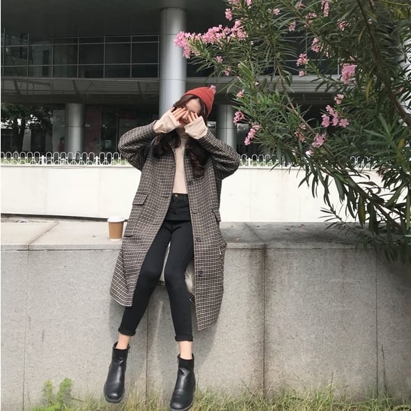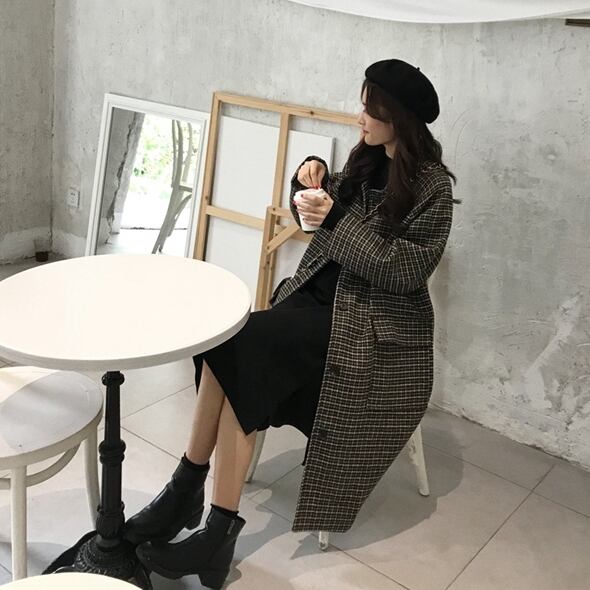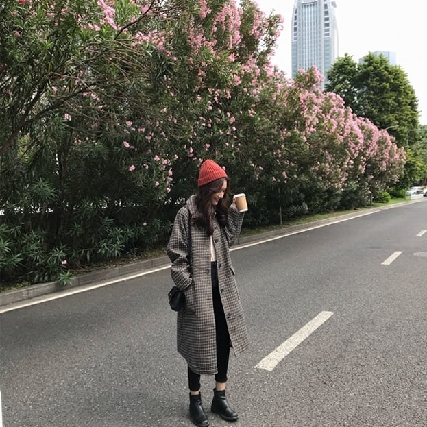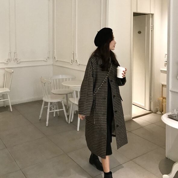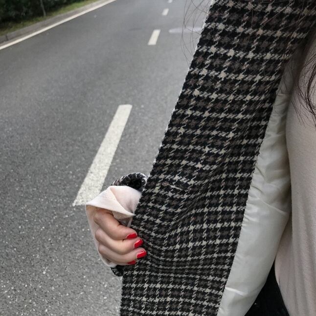 千鳥格子柄のステンカラーコートです。