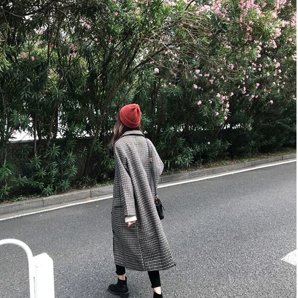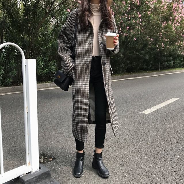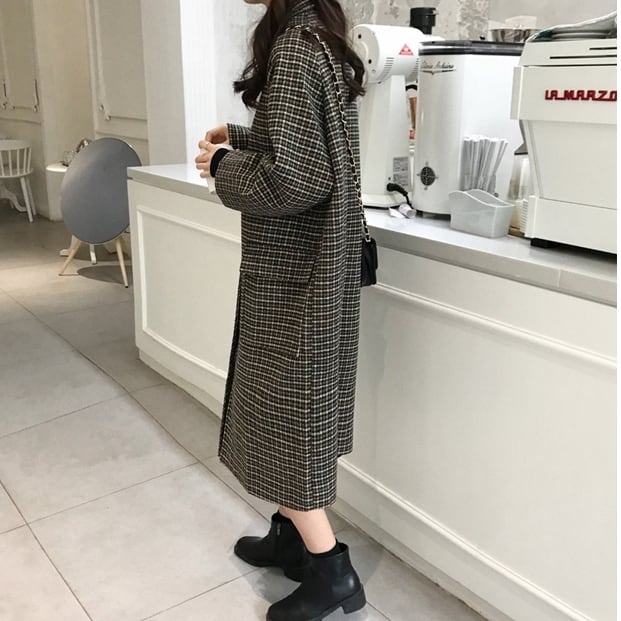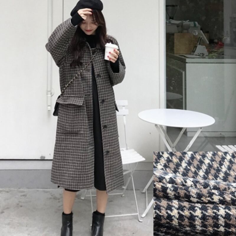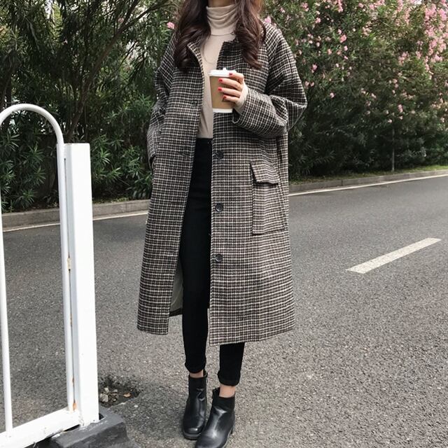 ステンカラーコート 千鳥格子柄 ロング丈 ハウンドトゥース チェック柄 メルトンコート 秋冬 お出かけ デート 女子会 カジュアル きれいめ ベーシック 定番 体型カバー ゆったり Iライン