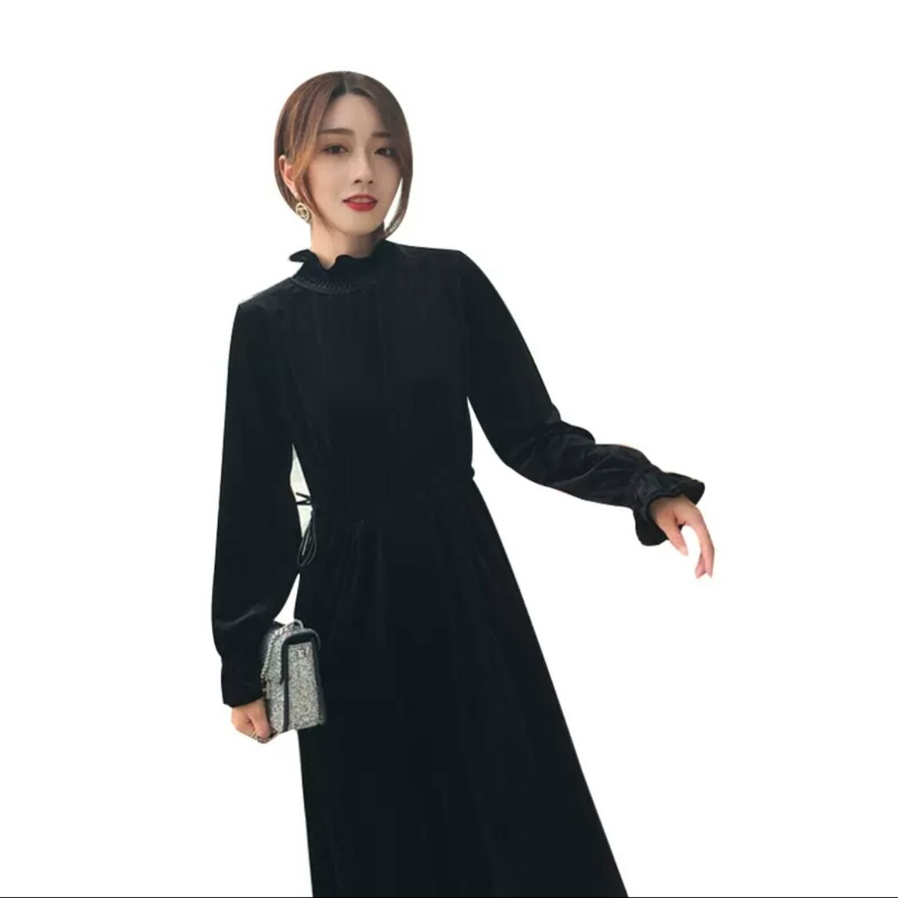 ロング丈 ワンピース シック 黒 長袖 大人 エレガント ダーク キレイめ レトロ お出かけ お買い物 デート 女子会 秋冬 春 通学 学生