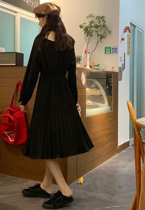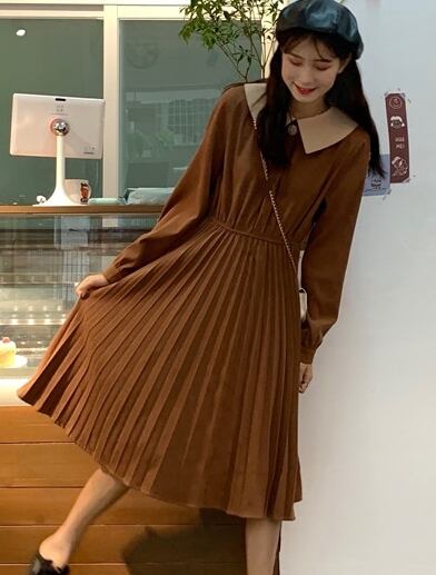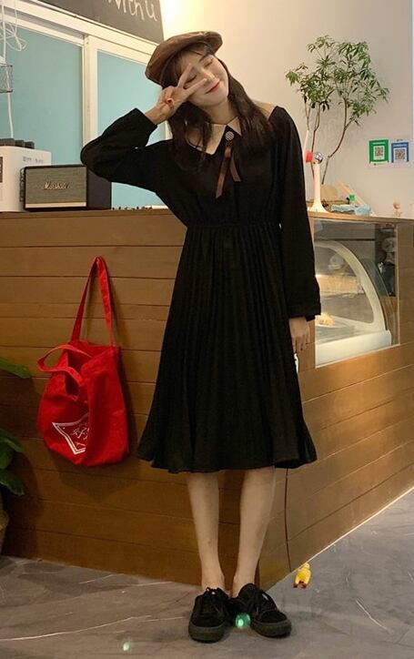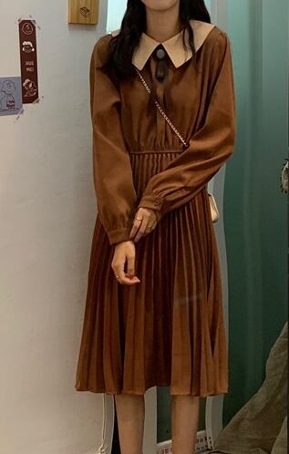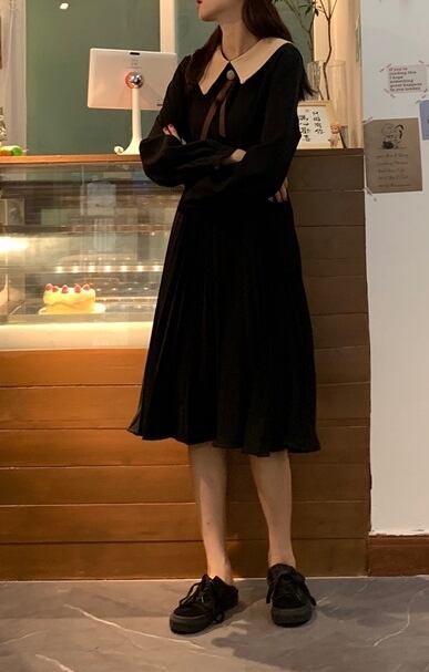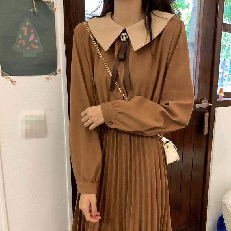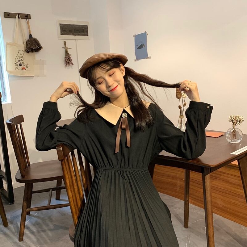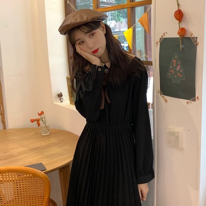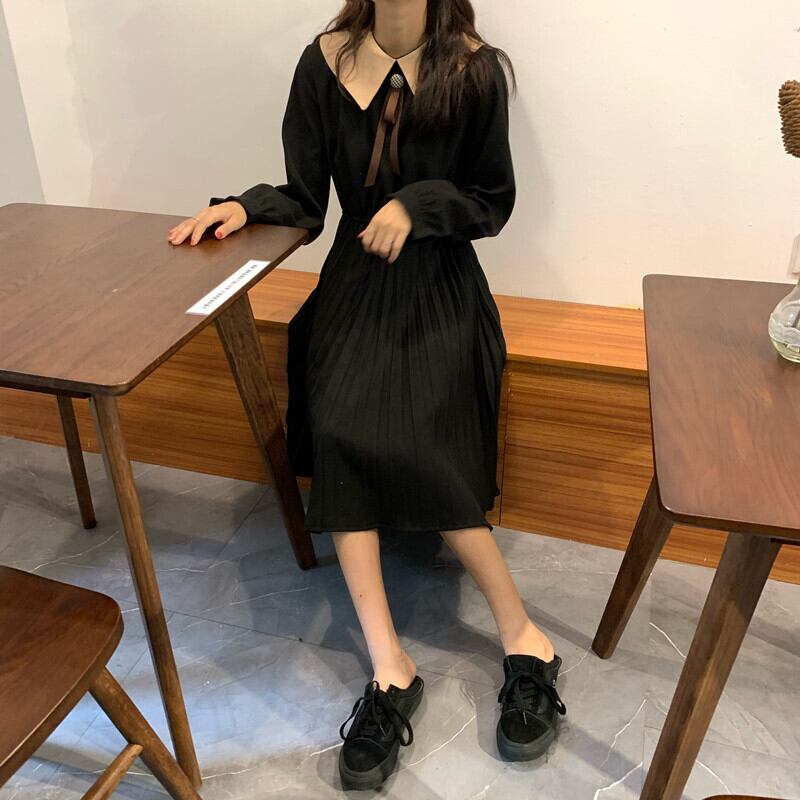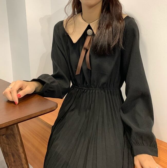 全2色 ワンピース ひざ丈 レトロ ボウタイネック 大人可愛い プリーツ フレンチ 上品 無地 ウエストマーク ゆったりめ 秋 春 冬 カジュアル デート ポロネック ボタン