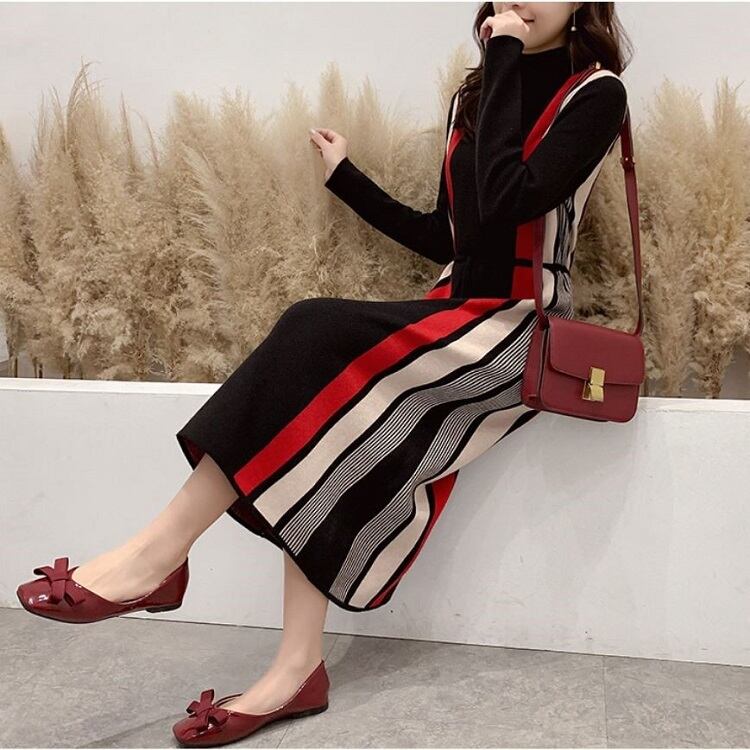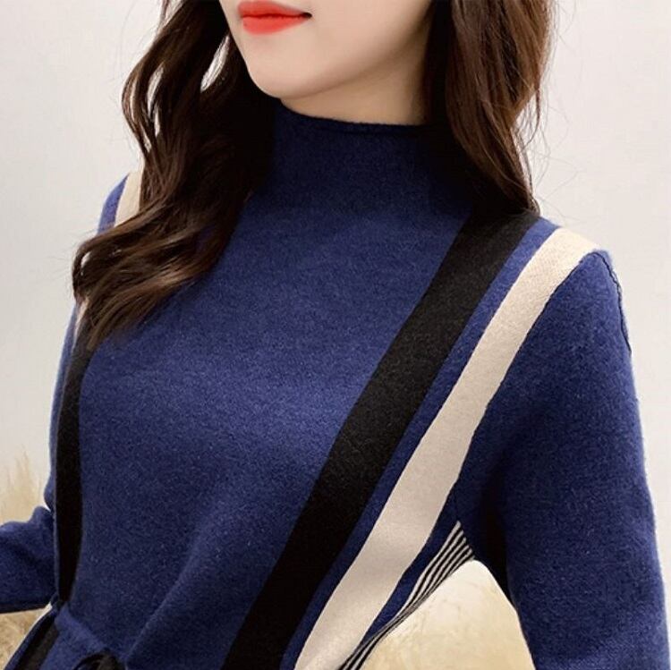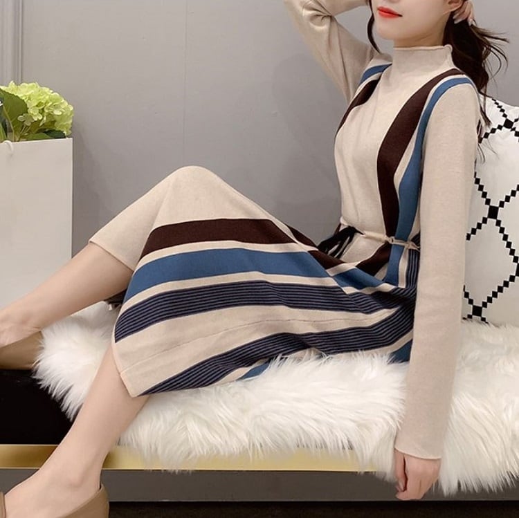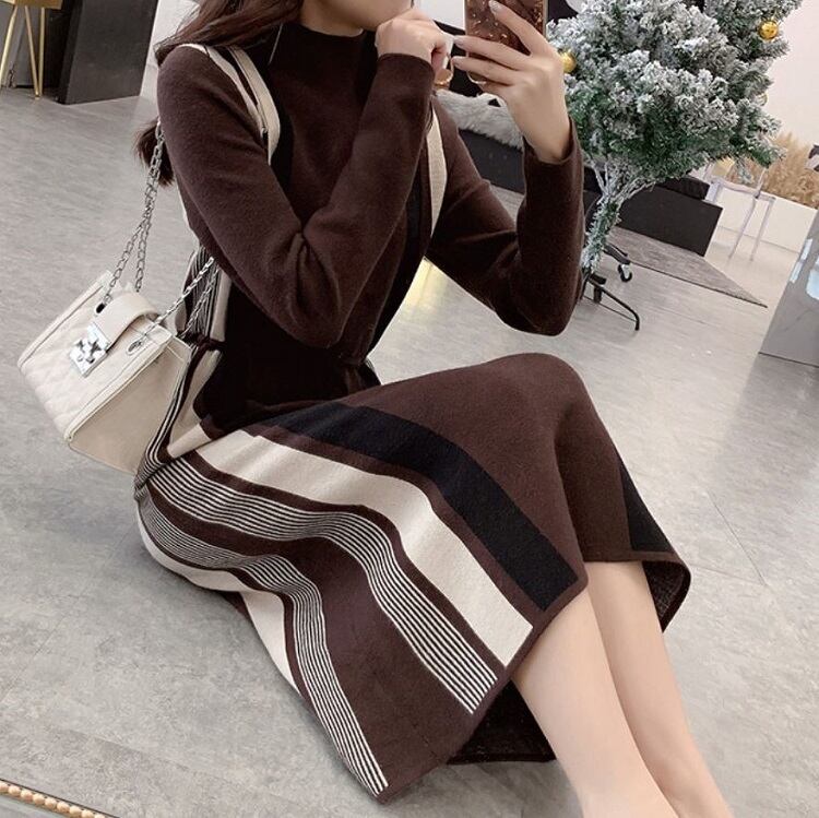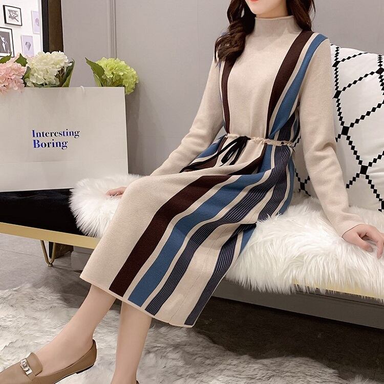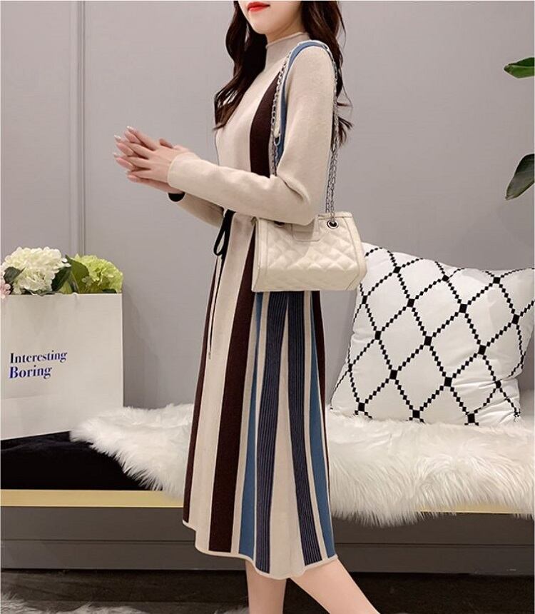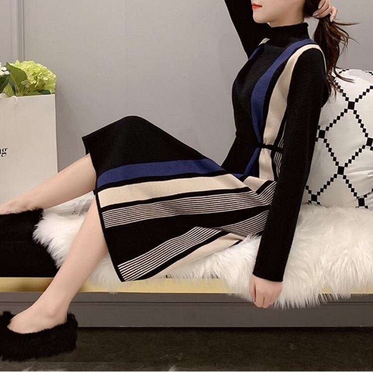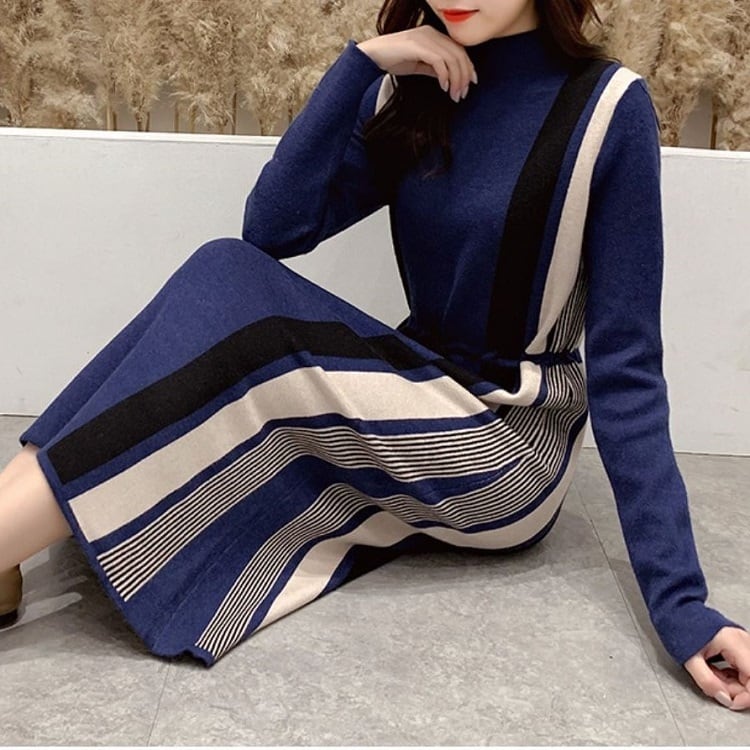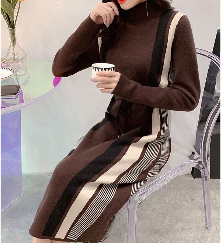 全5色 ニットワンピース ハイネック 長袖 ミモレ丈 ロング シンプル ゆったり きれいめ お出かけ デート オフィス ベージュ ブルー レッド ブラウン ブラック 秋冬