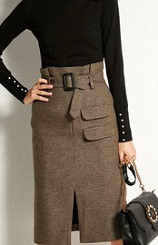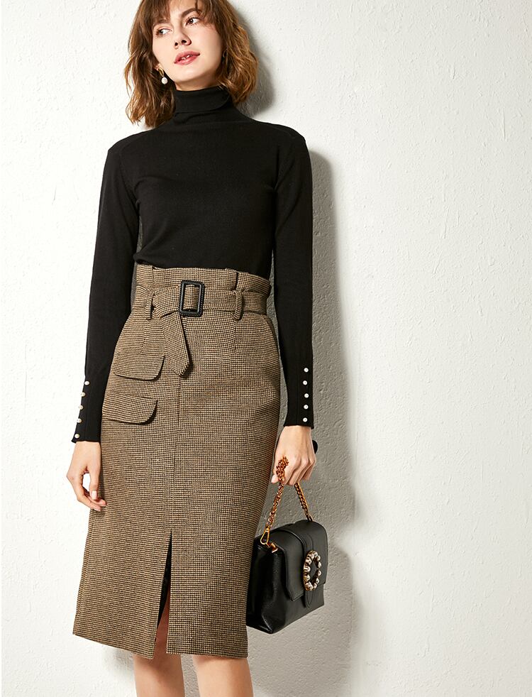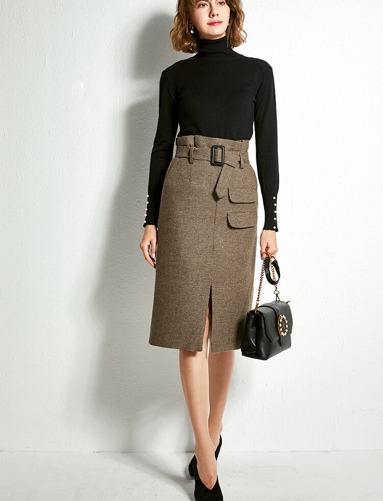 全2色 タイトスカート ミモレ丈 フロントスリット ウエストベルト ハイウエスト チェック柄 ブラウン カーキ 秋 冬 大人カジュアル オフィスカジュアル 学生 通学 通勤 韓国 オルチャン