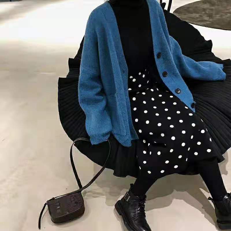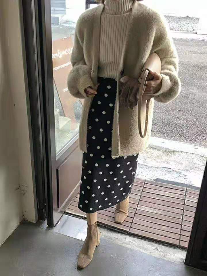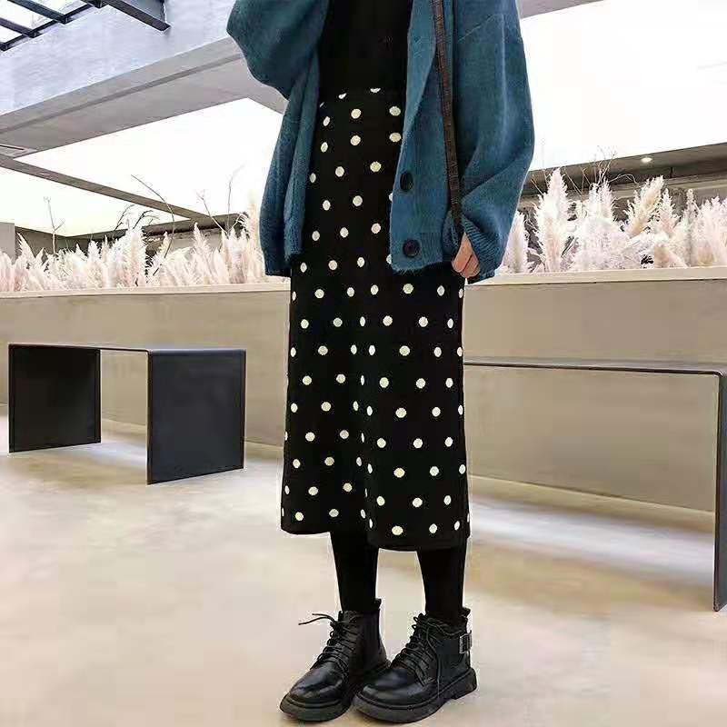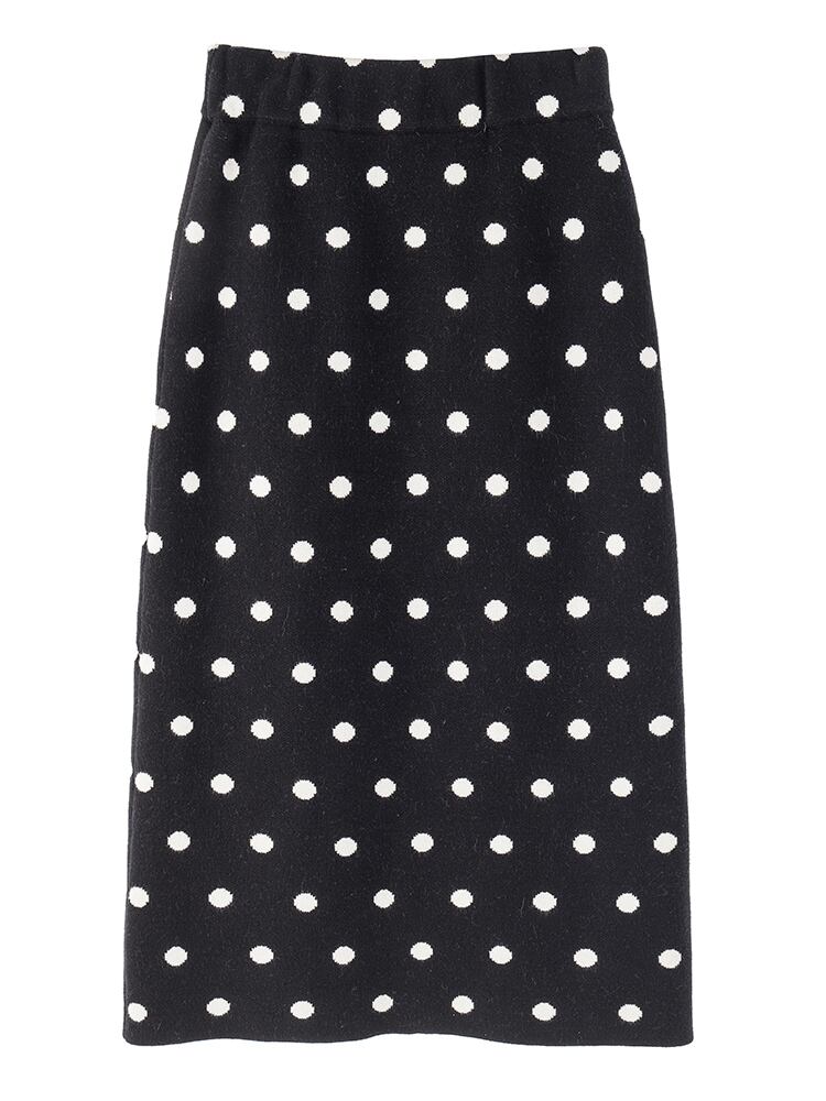 水玉スカート ミモレ丈 タイトスカート ストレッチ バックスリット ウエストゴム ブラック ドット 大人かわいい 休日コーデ 学生 通学 韓国 オルチャン 秋 冬