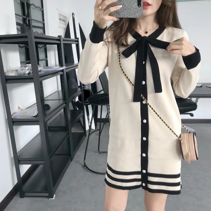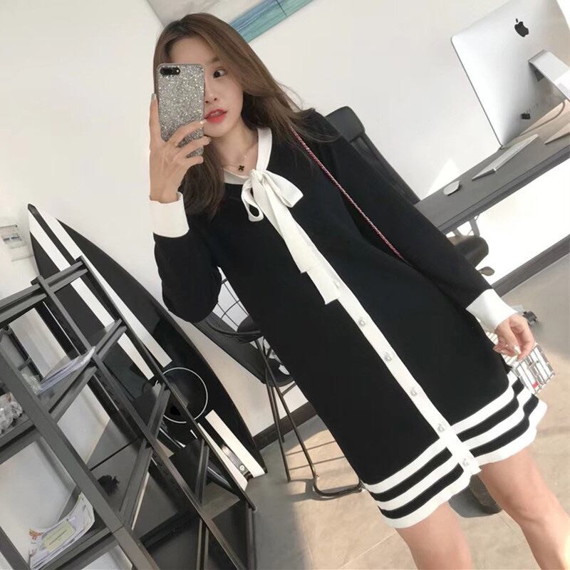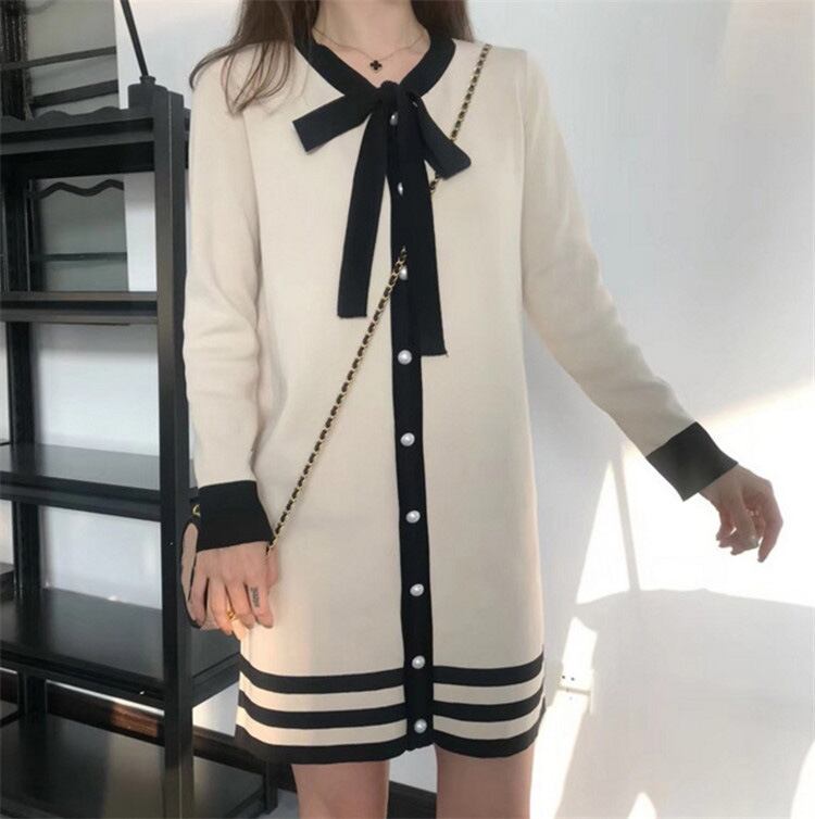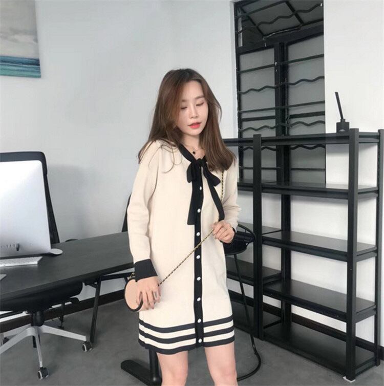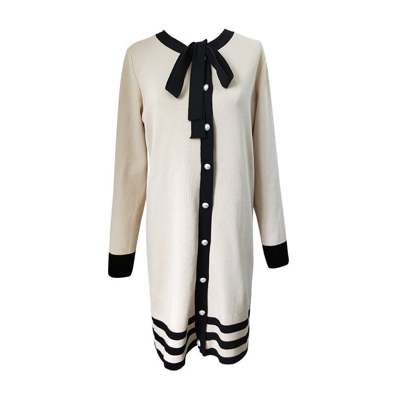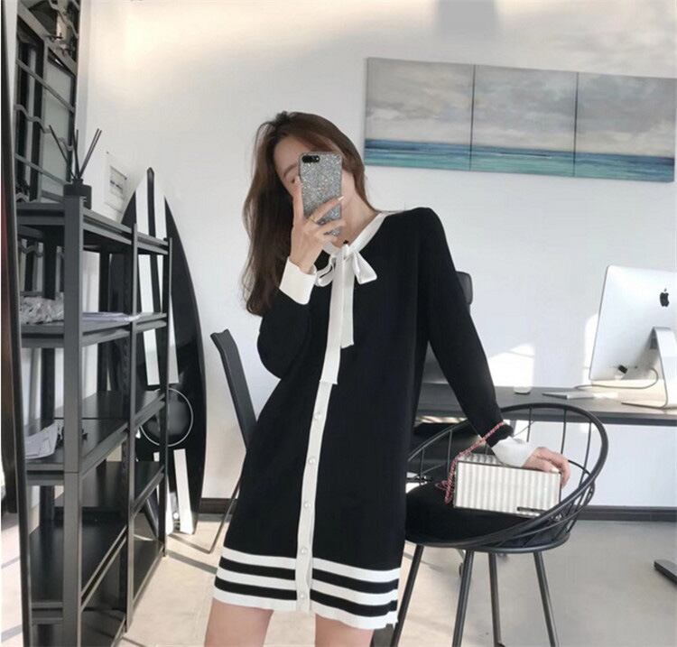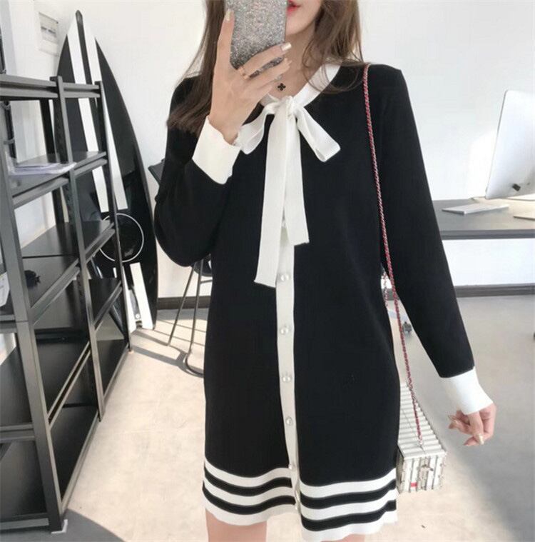 全2色 ニットワンピース ネックリボン フロントボタン ブラック アプリコット 長袖 秋 冬 大人カジュアル オフカジュアル 上品 お呼ばれ デート 韓国 オルチャン