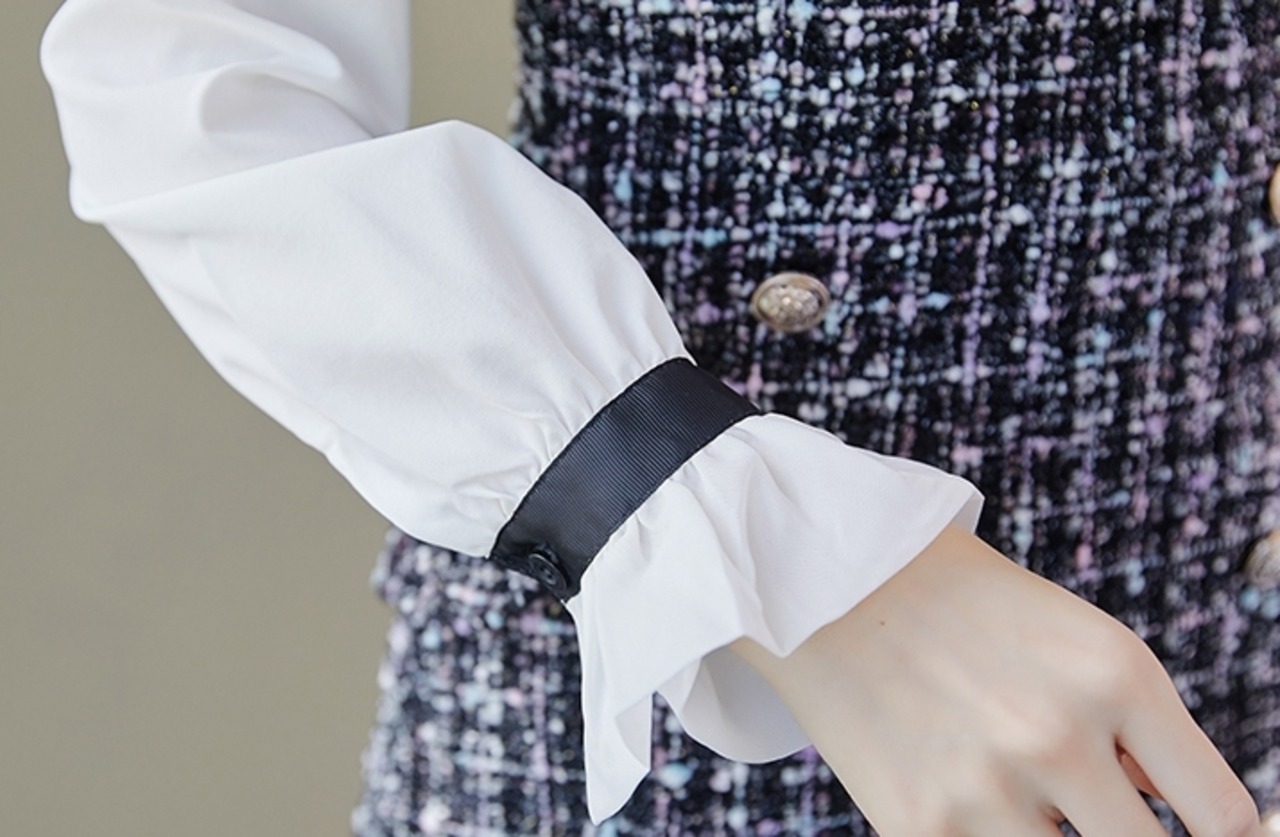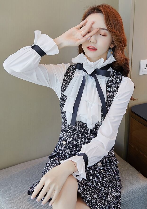 全2種 セットアップ ツーピース 2点セット スカート ジャンパースカート サロペットスカート ツイード ワンピース ミニ丈 サイドボタン ブラウス 長袖 きれいめ フリル ボウタイネック エレガント デート スリム 裏起毛 あったか 秋 春 冬