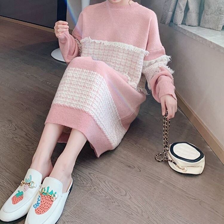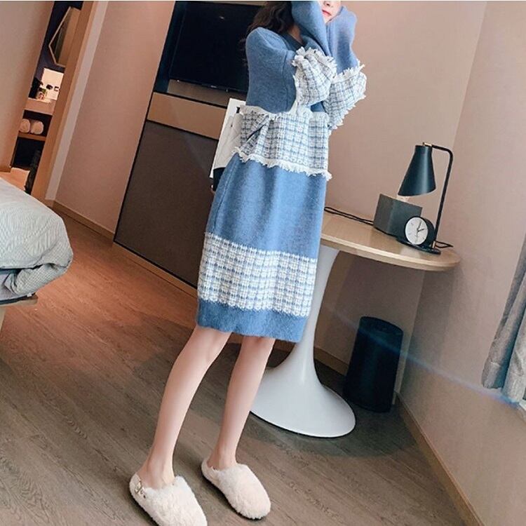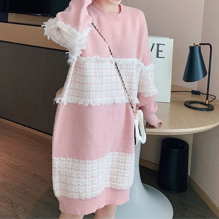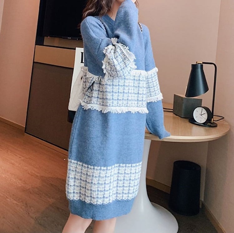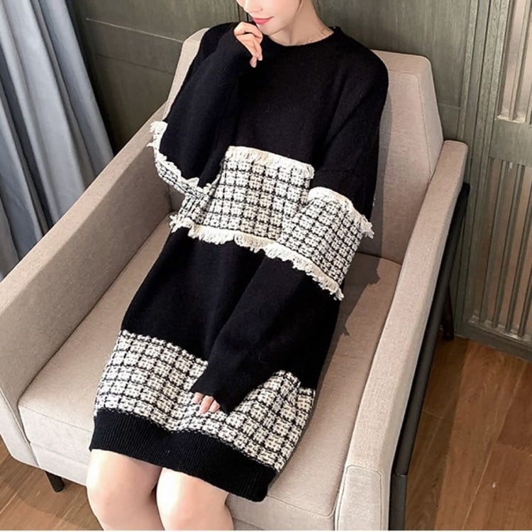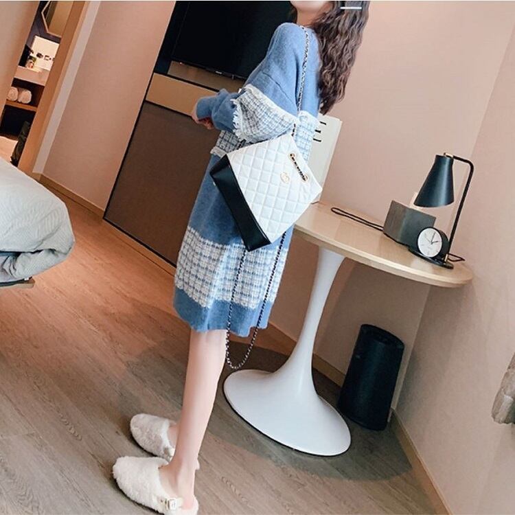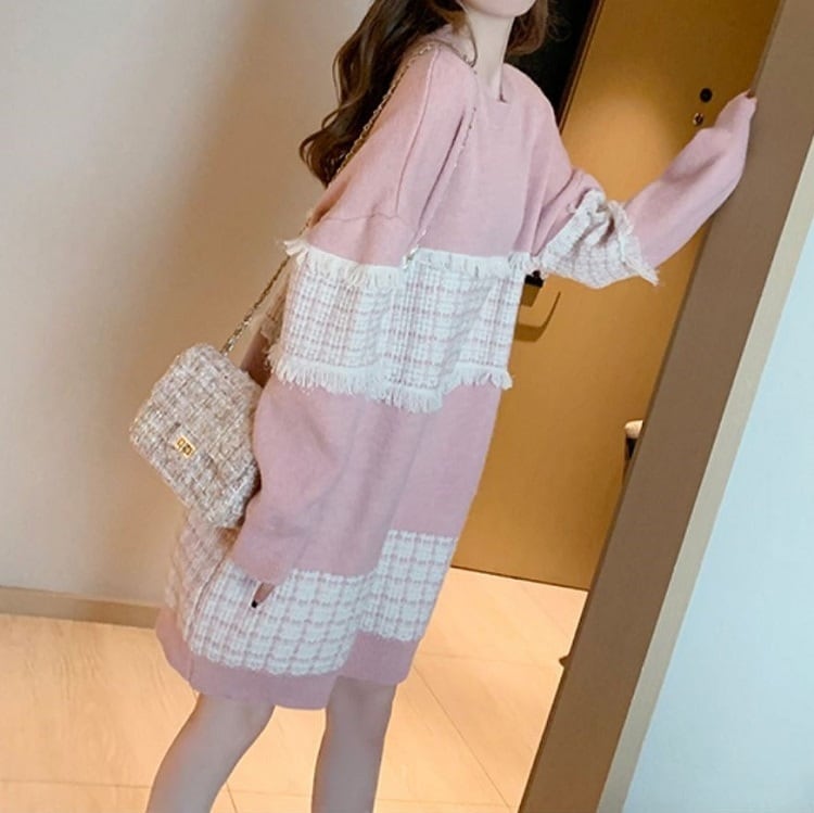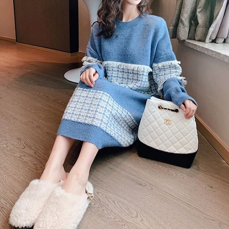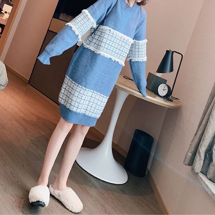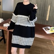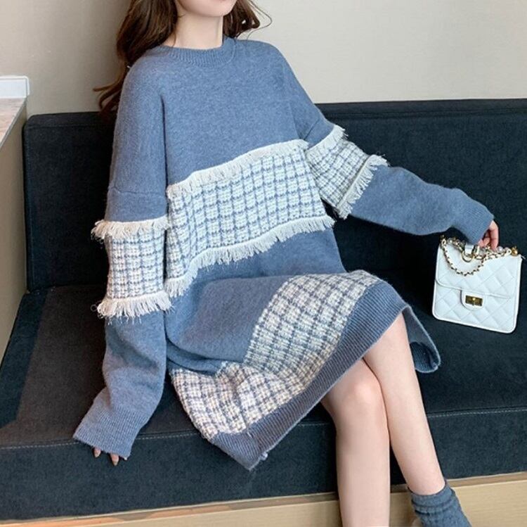 全3色 ニットワンピース ひざ丈 ラウンドネック プルオーバー チェック 長袖 ゆったり レトロ カジュアル お出かけ デート デイリー 普段着 ブラック ピンク ブルー 秋冬