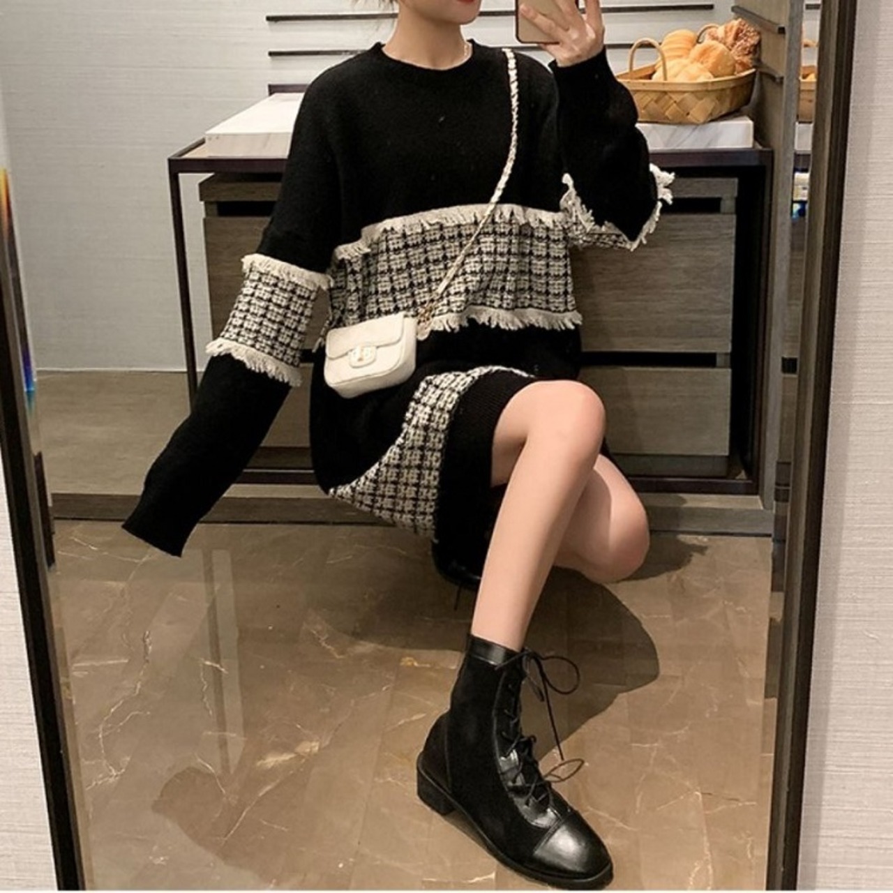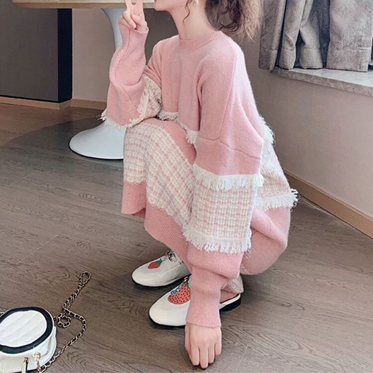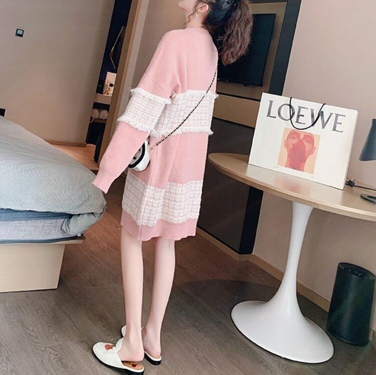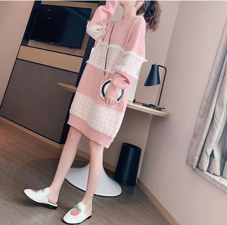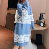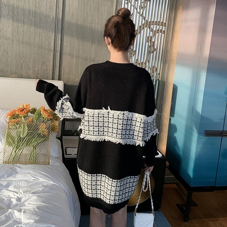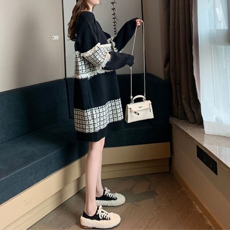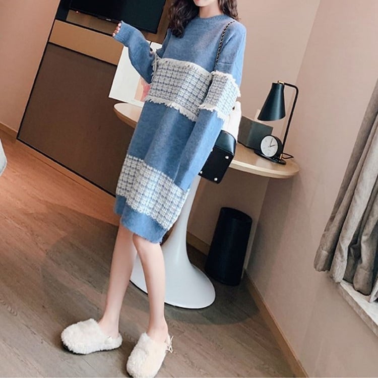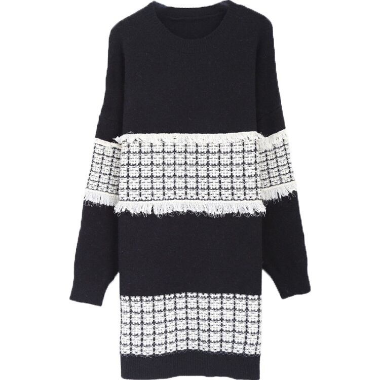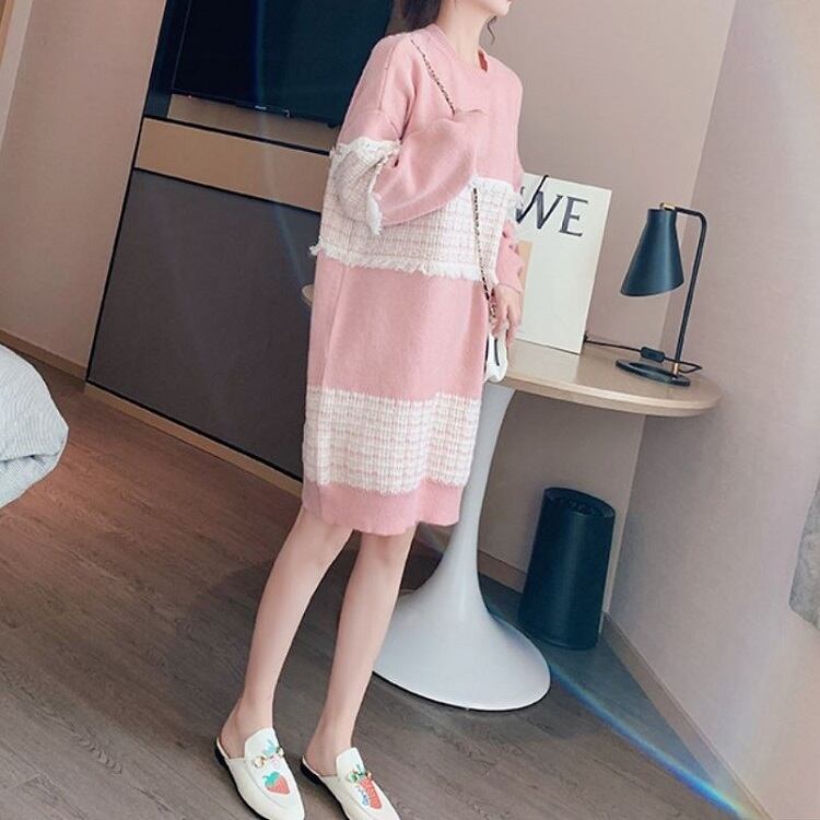 全3色 ニットワンピース ひざ丈 ラウンドネック プルオーバー チェック 長袖 ゆったり レトロ カジュアル お出かけ デート デイリー 普段着 ブラック ピンク ブルー 秋冬