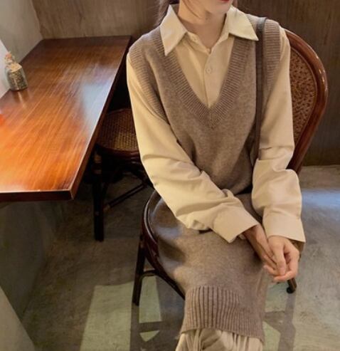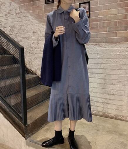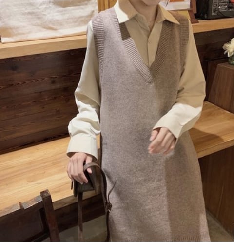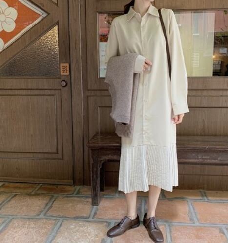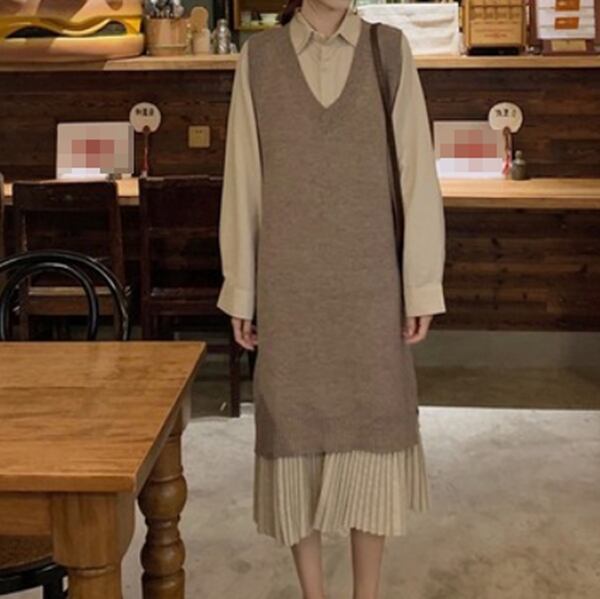 全2色 セットアップ ツーピース 2点セット シャツワンピース ベスト ミモレ丈 大人 ゆったり レトロ テントシルエット Vネック 長袖 プリーツ レイヤード カジュアル デイリー 秋 春 冬