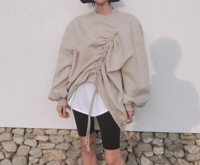フロントシャリングデザインがおしゃれなトレーナーです。