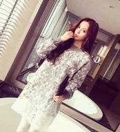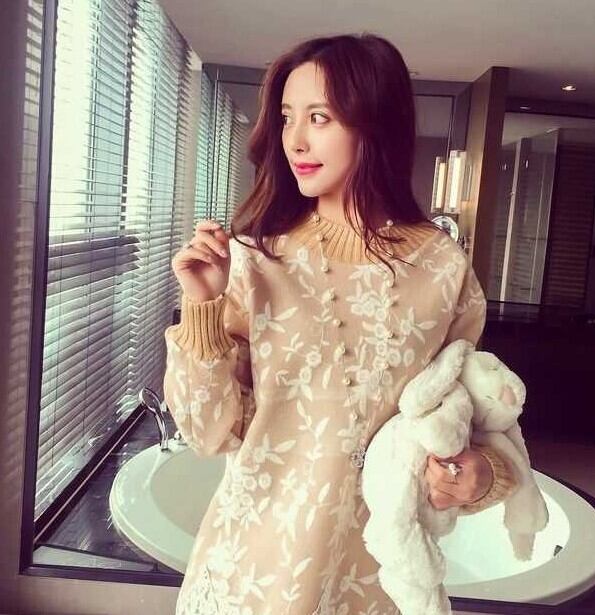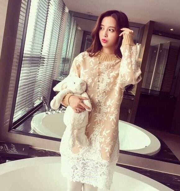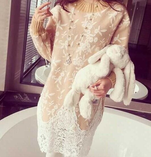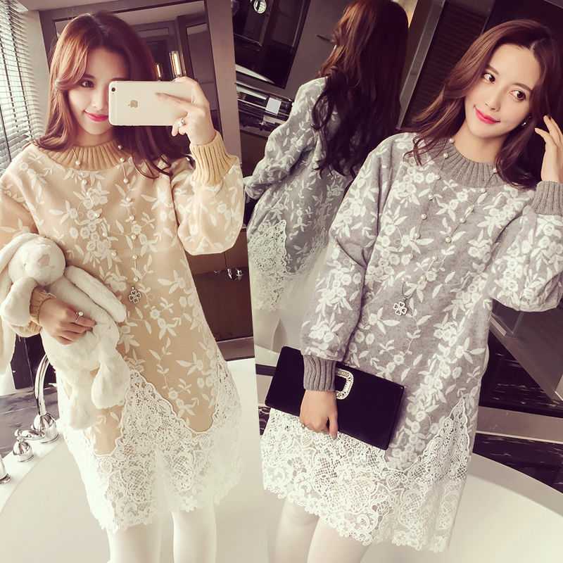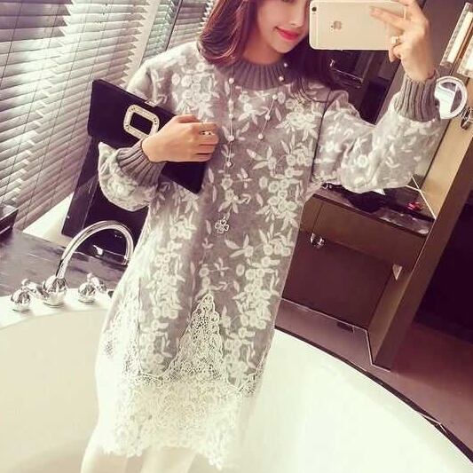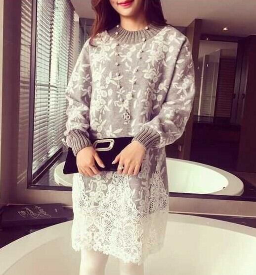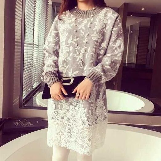 全3色 ニットドレス ニットワンピース ハイネック レース 長袖 ドロップショルダー ベージュ グレー 秋 冬 大人かわいい デート 通学 学生 韓国 オルチャン