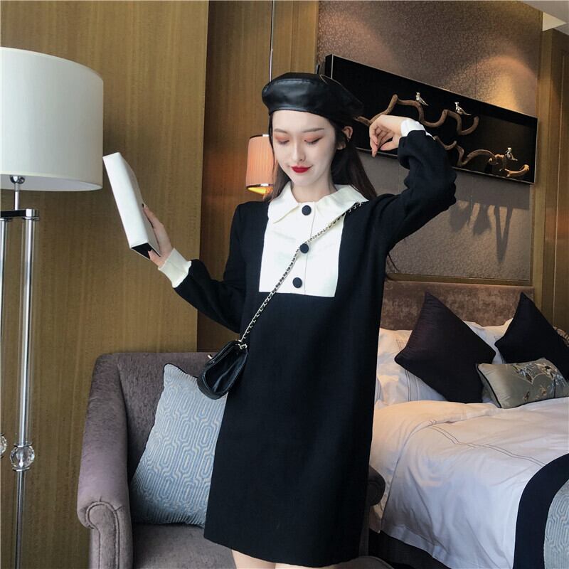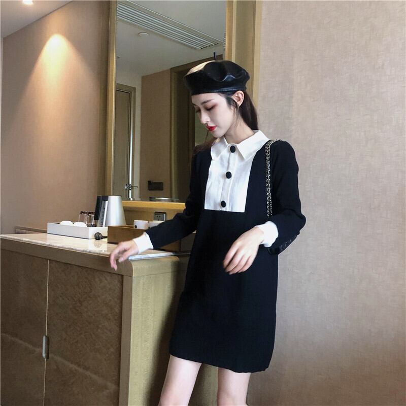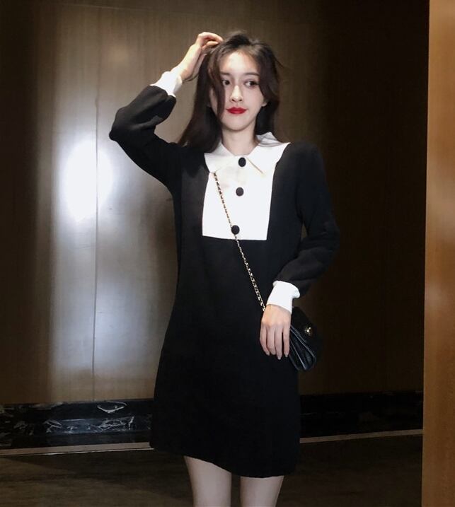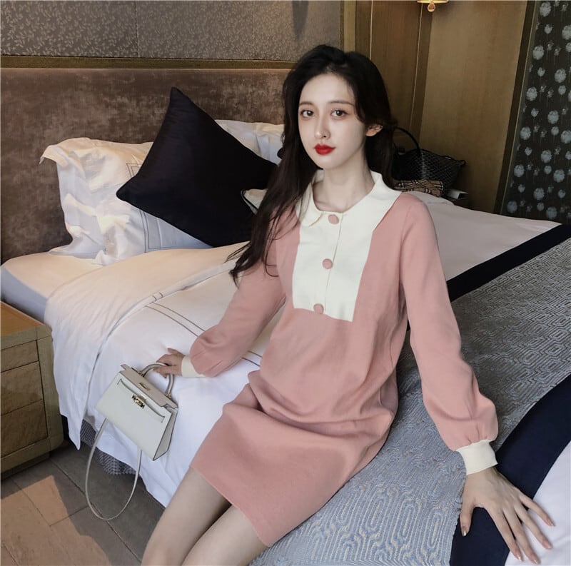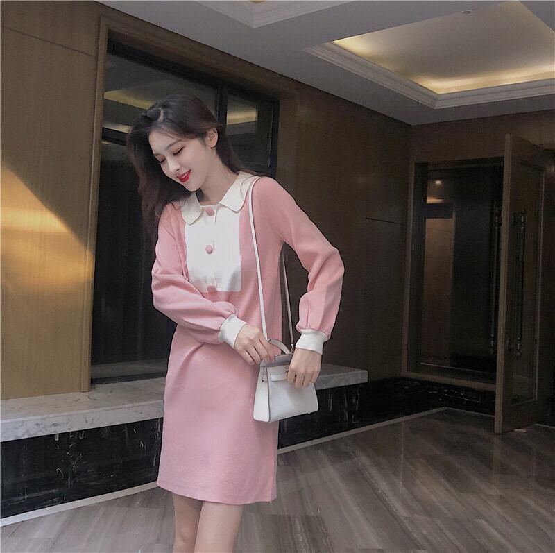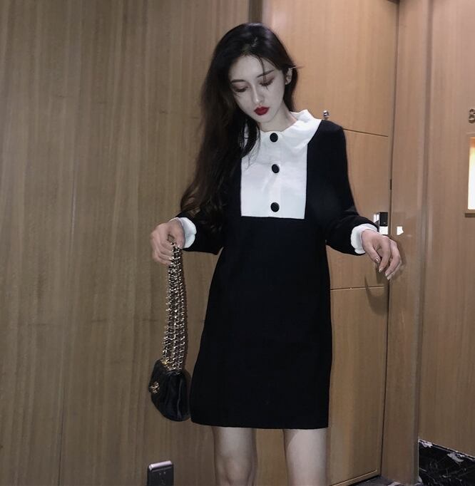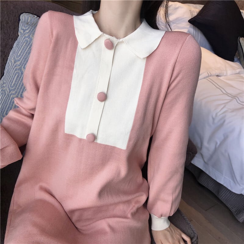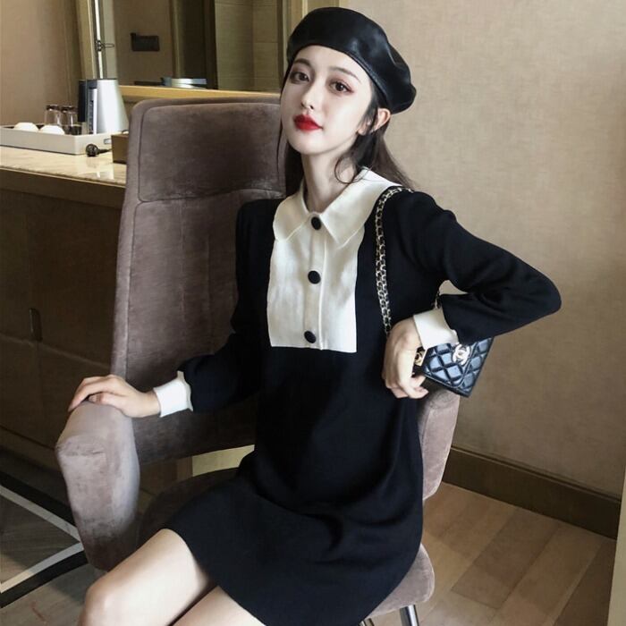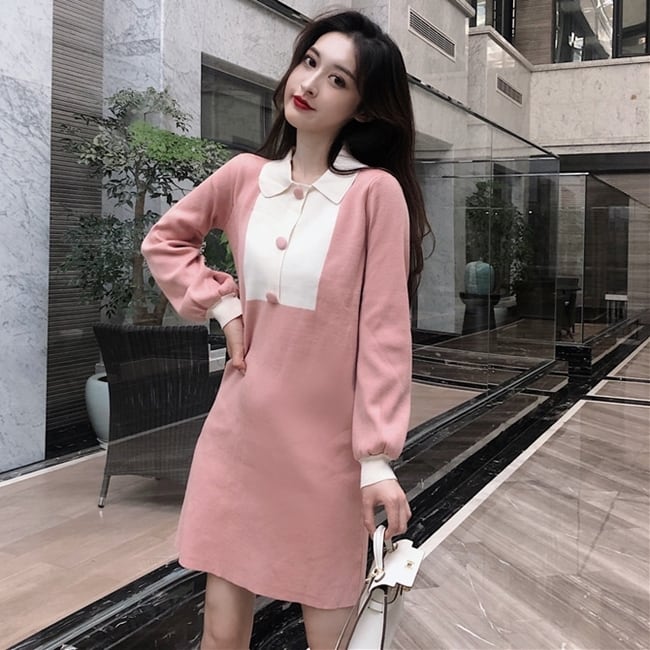 ワンピース ショート丈 ミニ丈 バイカラー ボタン 長袖 ポロネック スリム ガーリー 大人可愛い 女子会 デート パフスリーブ カジュアル きれいめ 秋 春 冬