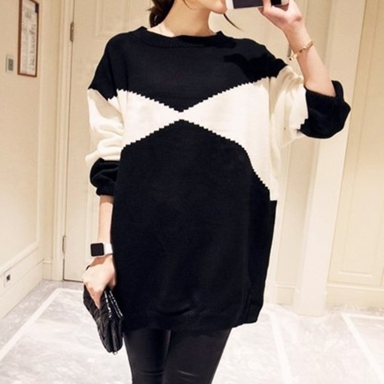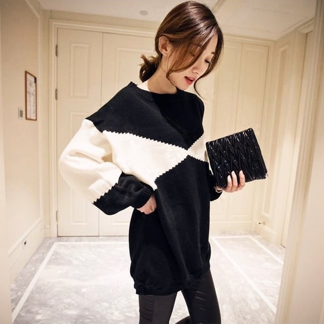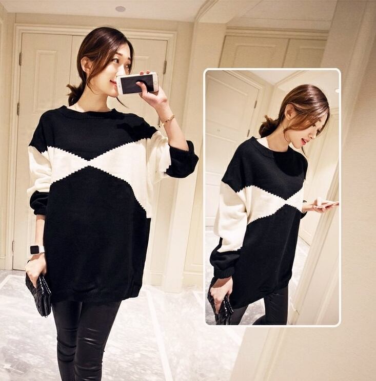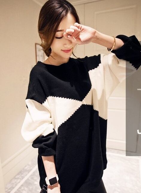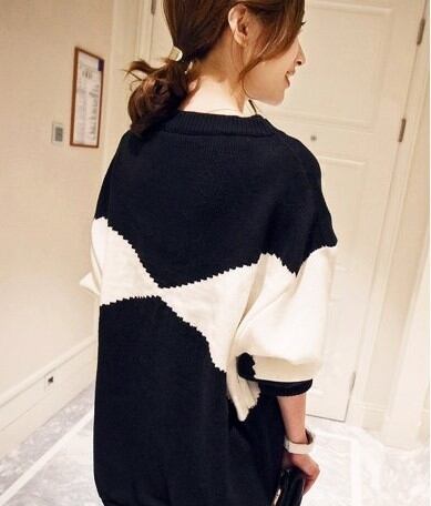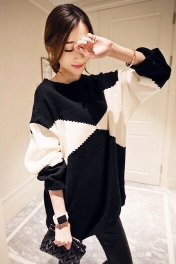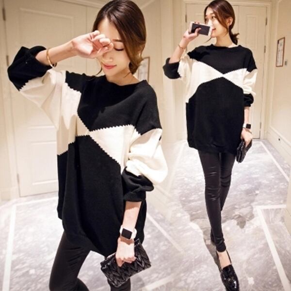 トップス プルオーバー バイカラーセーター ロング オーバーサイズ ゆったり ニット モノトーン 体型カバー ラウンドネック カジュアル デイリー 大人 秋 冬 春