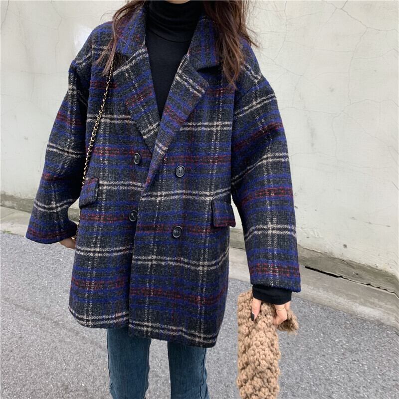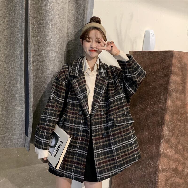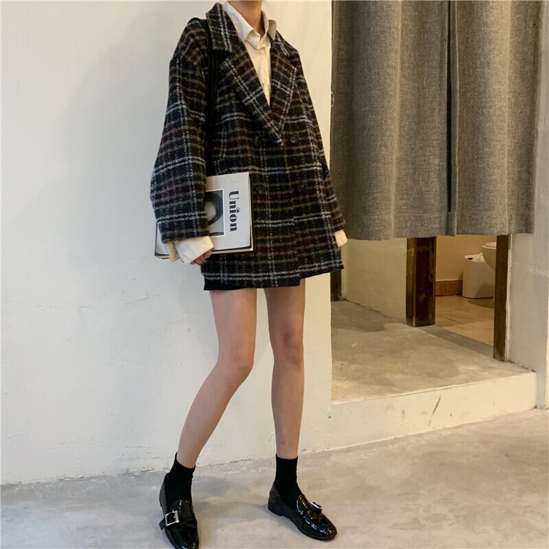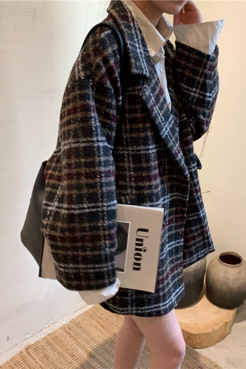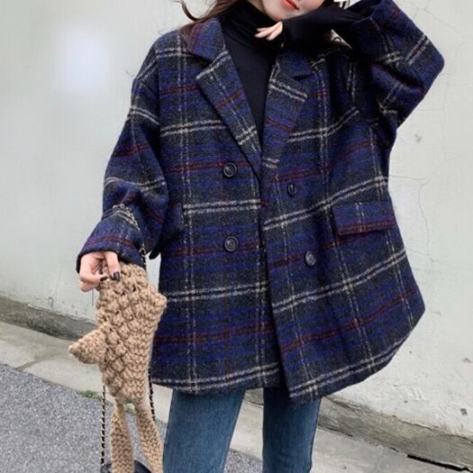 全2色 アウターチェック Pコート ジャケット オーバーサイズ ポケット カジュアル オフィス 通勤 通学