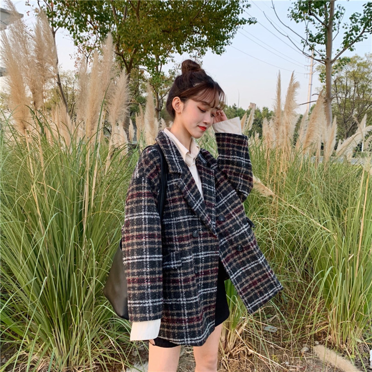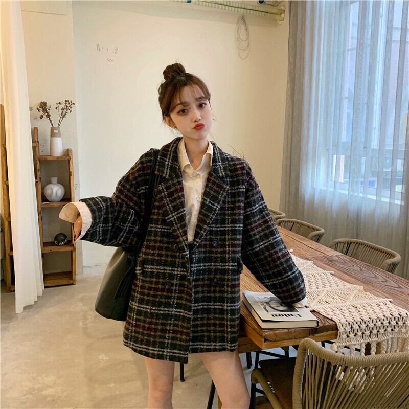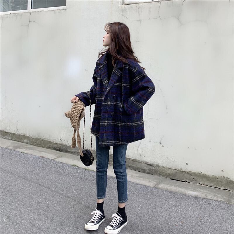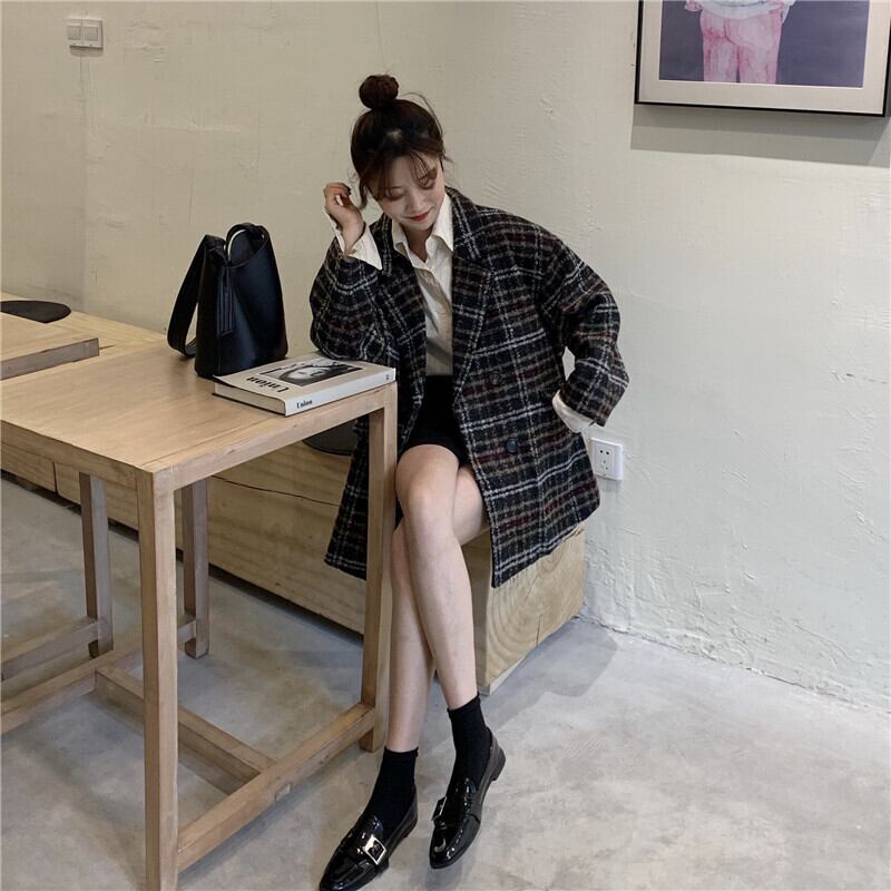 全2色 アウターチェック Pコート ジャケット オーバーサイズ ポケット カジュアル オフィス 通勤 通学