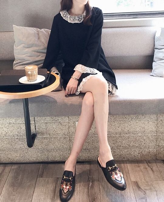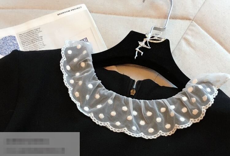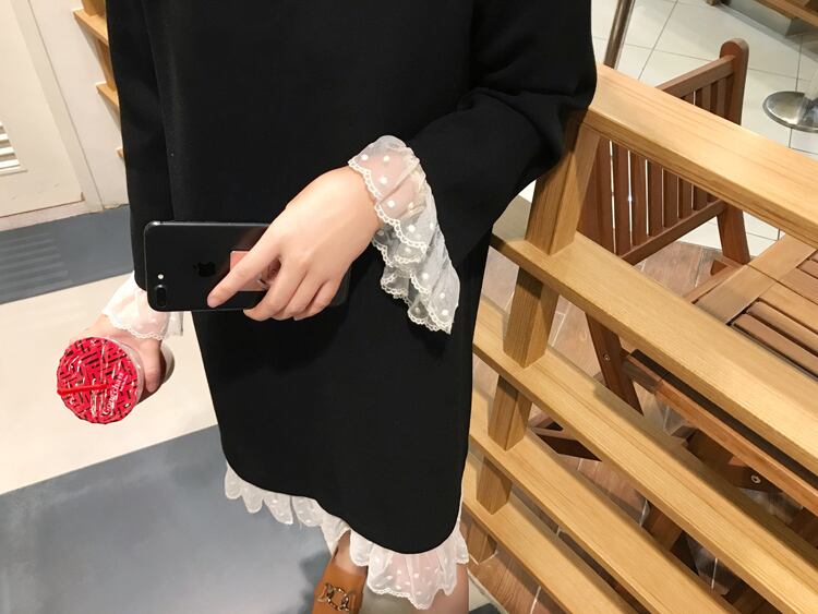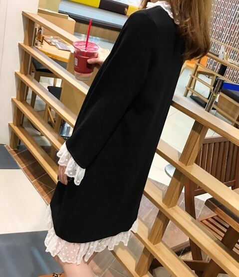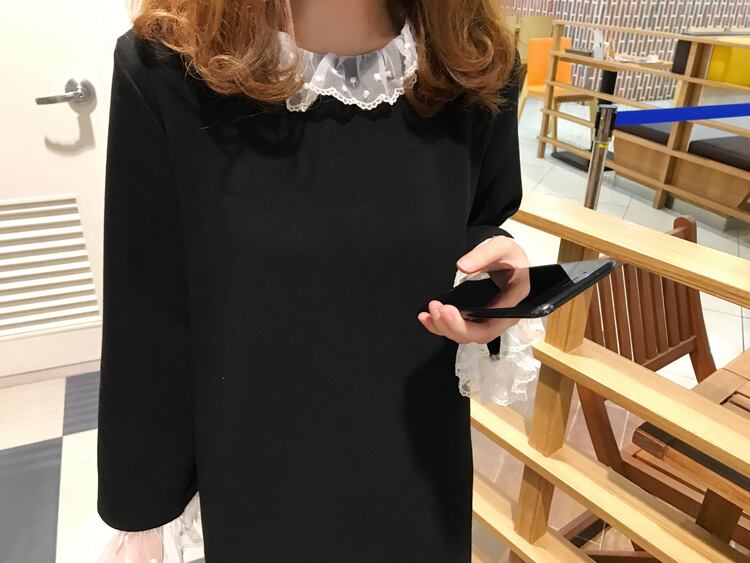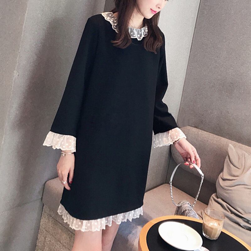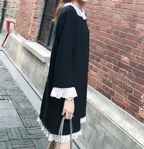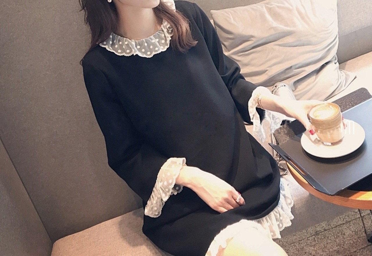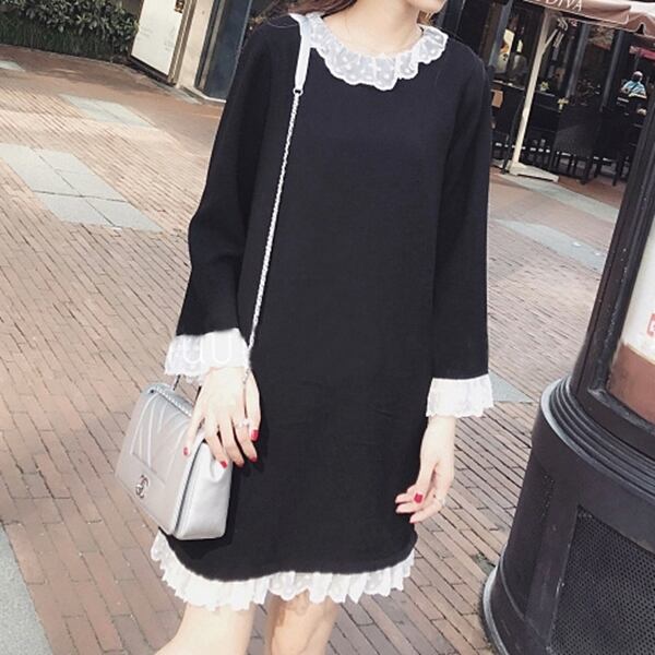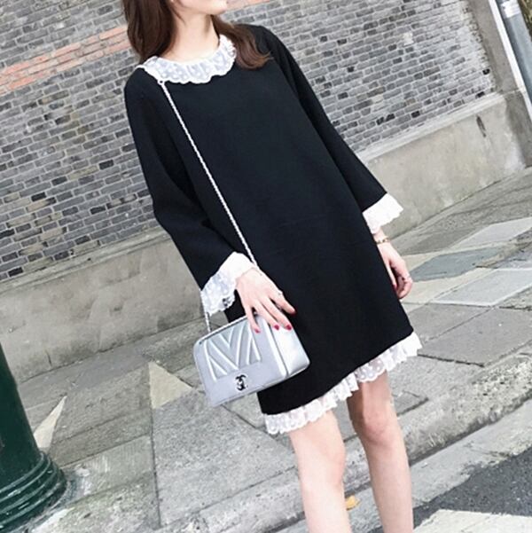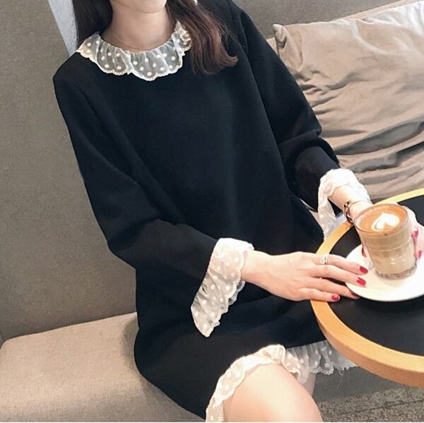 ワンピース ショート丈 ひざ丈 レース フリル ラウンドネック 長袖 ゆったり モノトーン 体型カバー 大きいサイズ 無地 大人可愛い 女子会 カジュアル ガーリー きれいめ 秋 春 冬