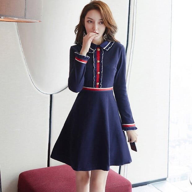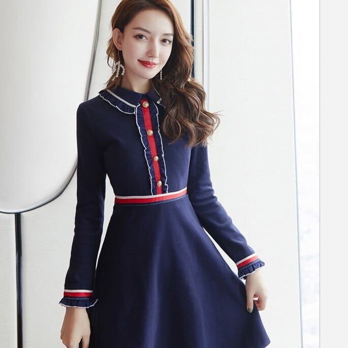 ミニワンピース ドレス フリル 開襟 フロントボタン 長袖 フィット スリム 秋 冬 大人かわいい レトロ デート お呼ばれ 韓国 オルチャン