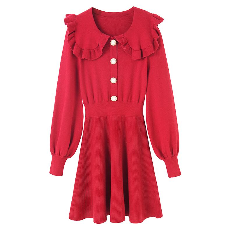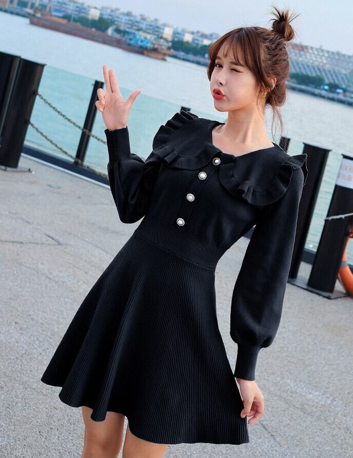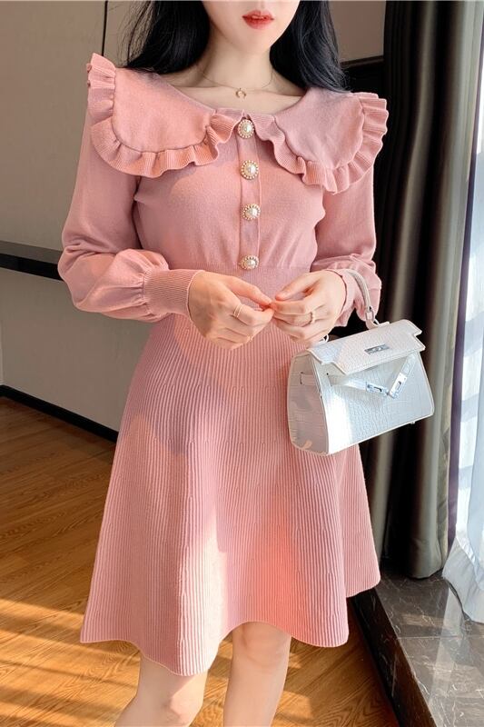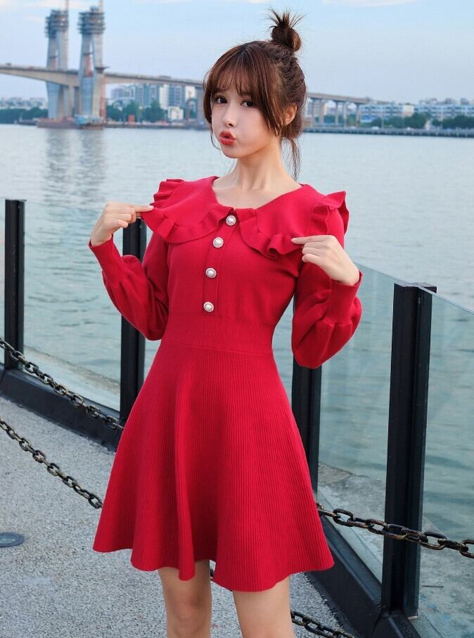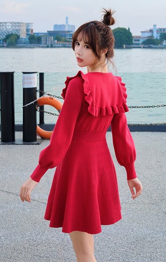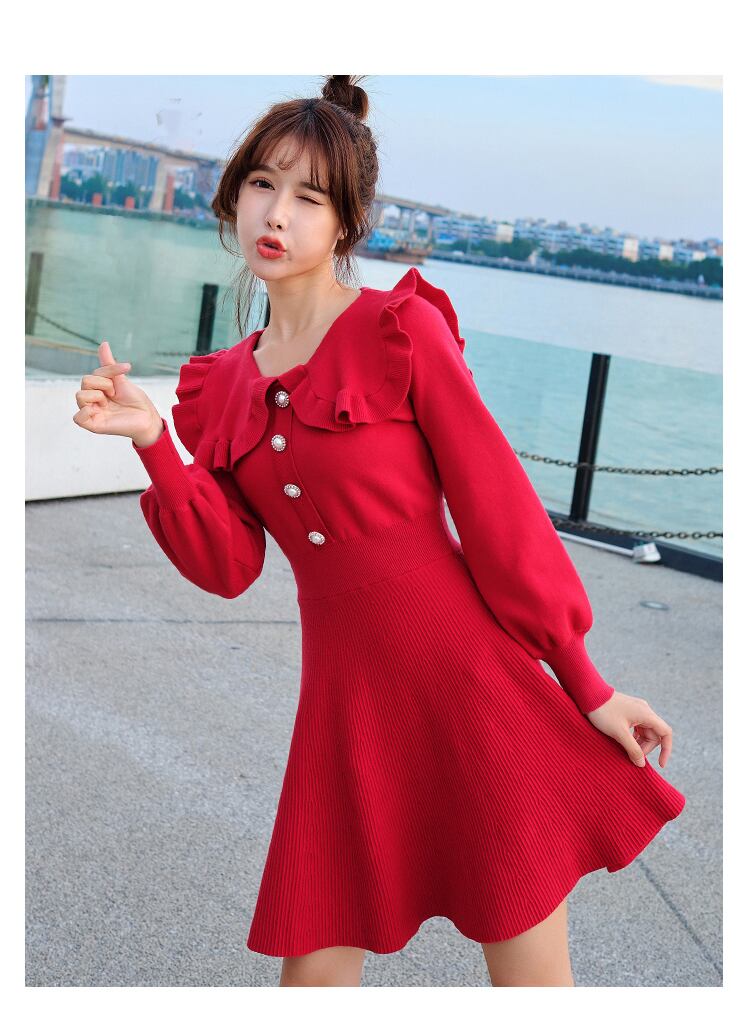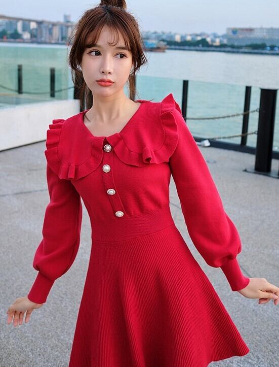 全4色 ニットドレス ミニワンピース セーラーカラー ビックカラー フリル フロントボタン ボリューム袖 秋 冬 ピンク レッド ブラック ワインレッド 秋 冬 大人かわいい デート 韓国 オルチャン