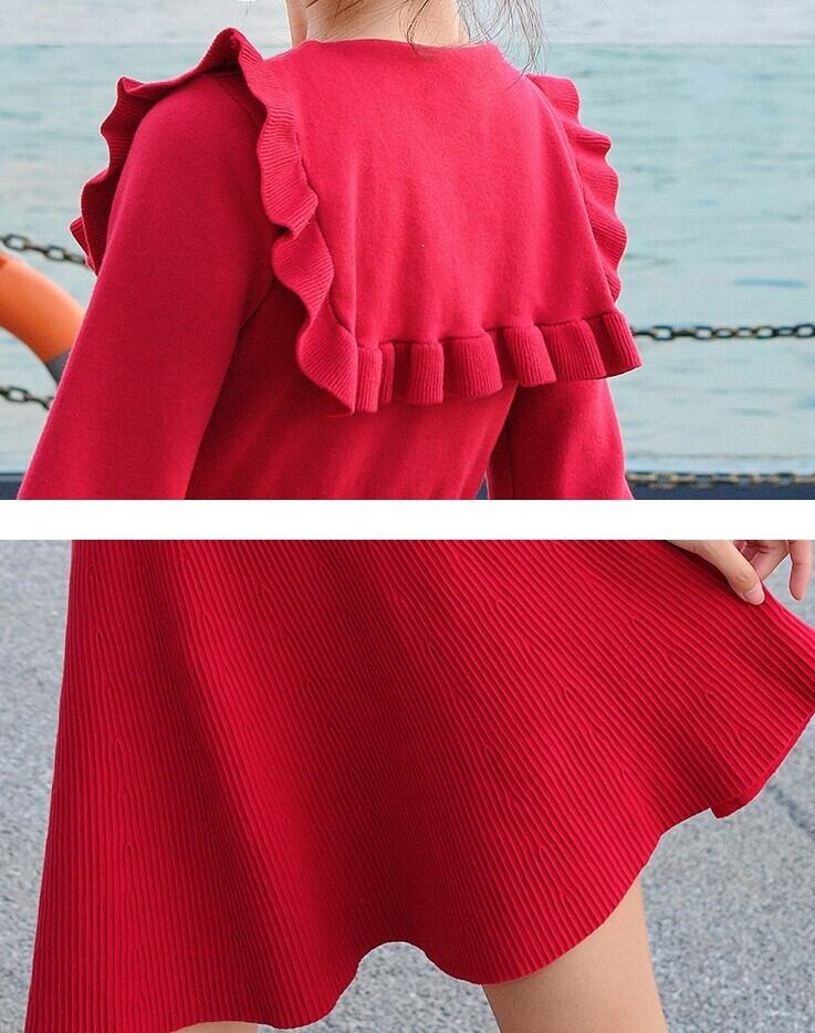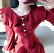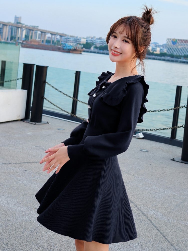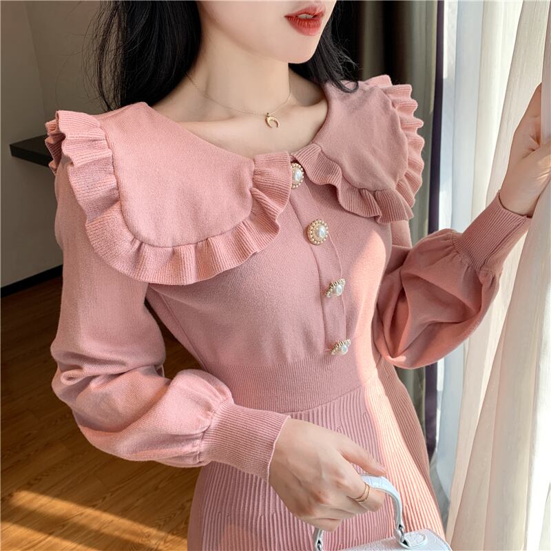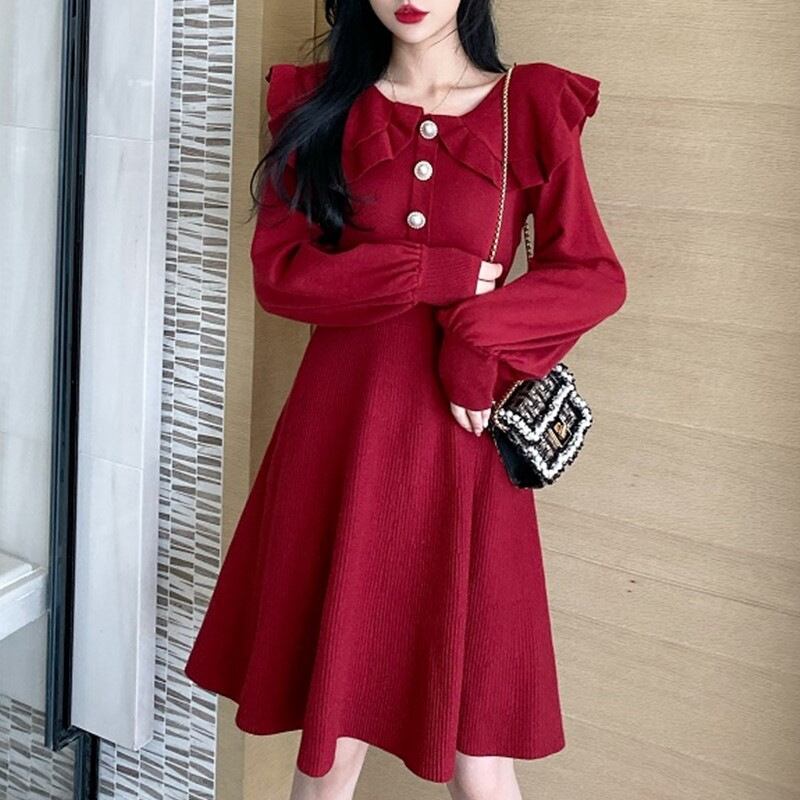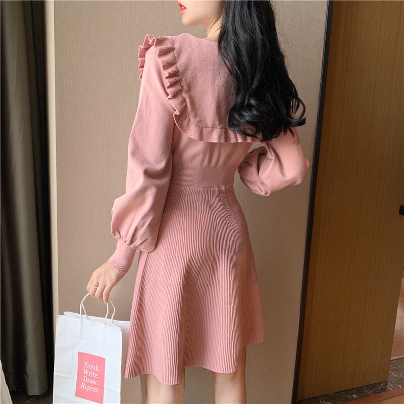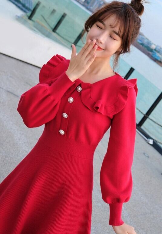 全4色 ニットドレス ミニワンピース セーラーカラー ビックカラー フリル フロントボタン ボリューム袖 秋 冬 ピンク レッド ブラック ワインレッド 秋 冬 大人かわいい デート 韓国 オルチャン