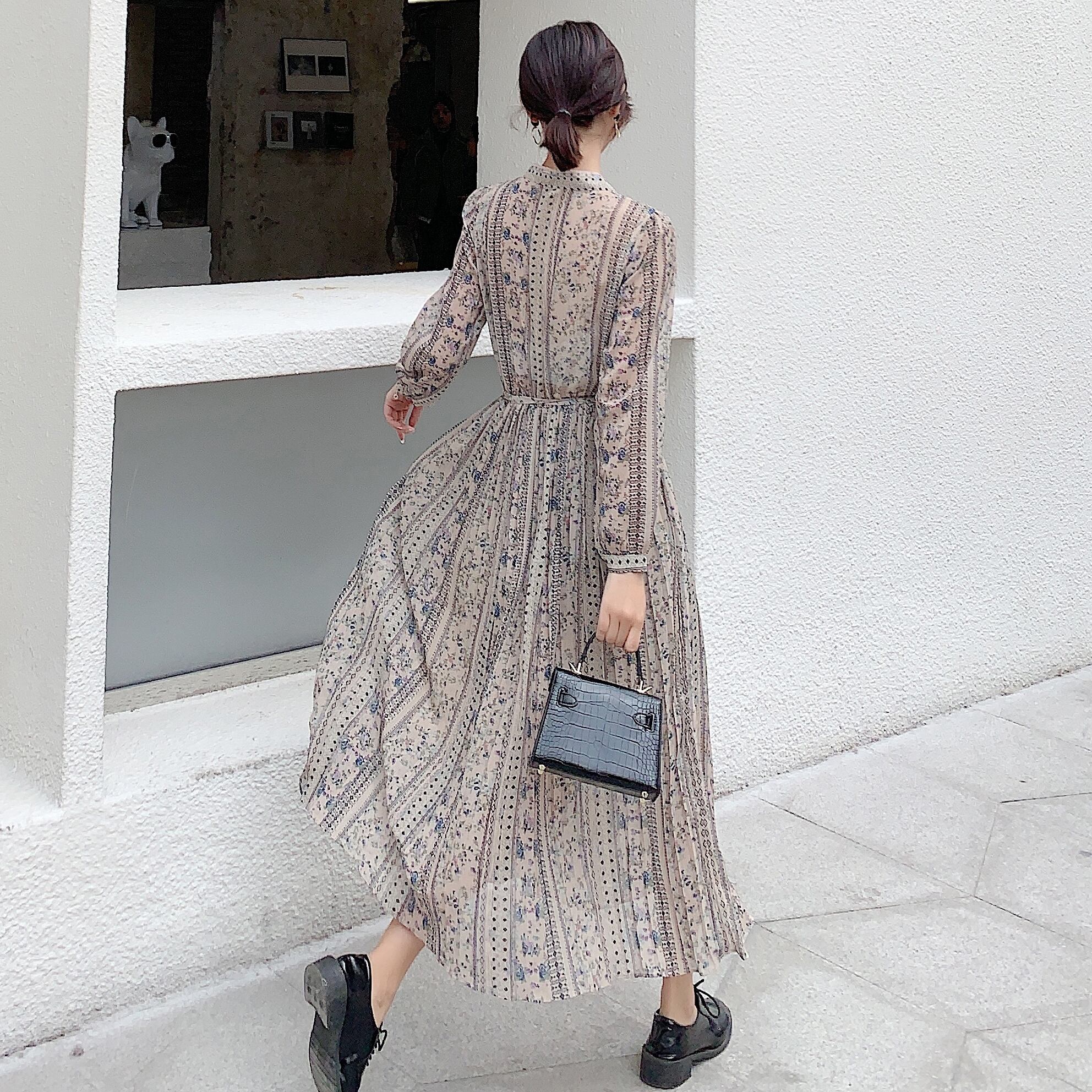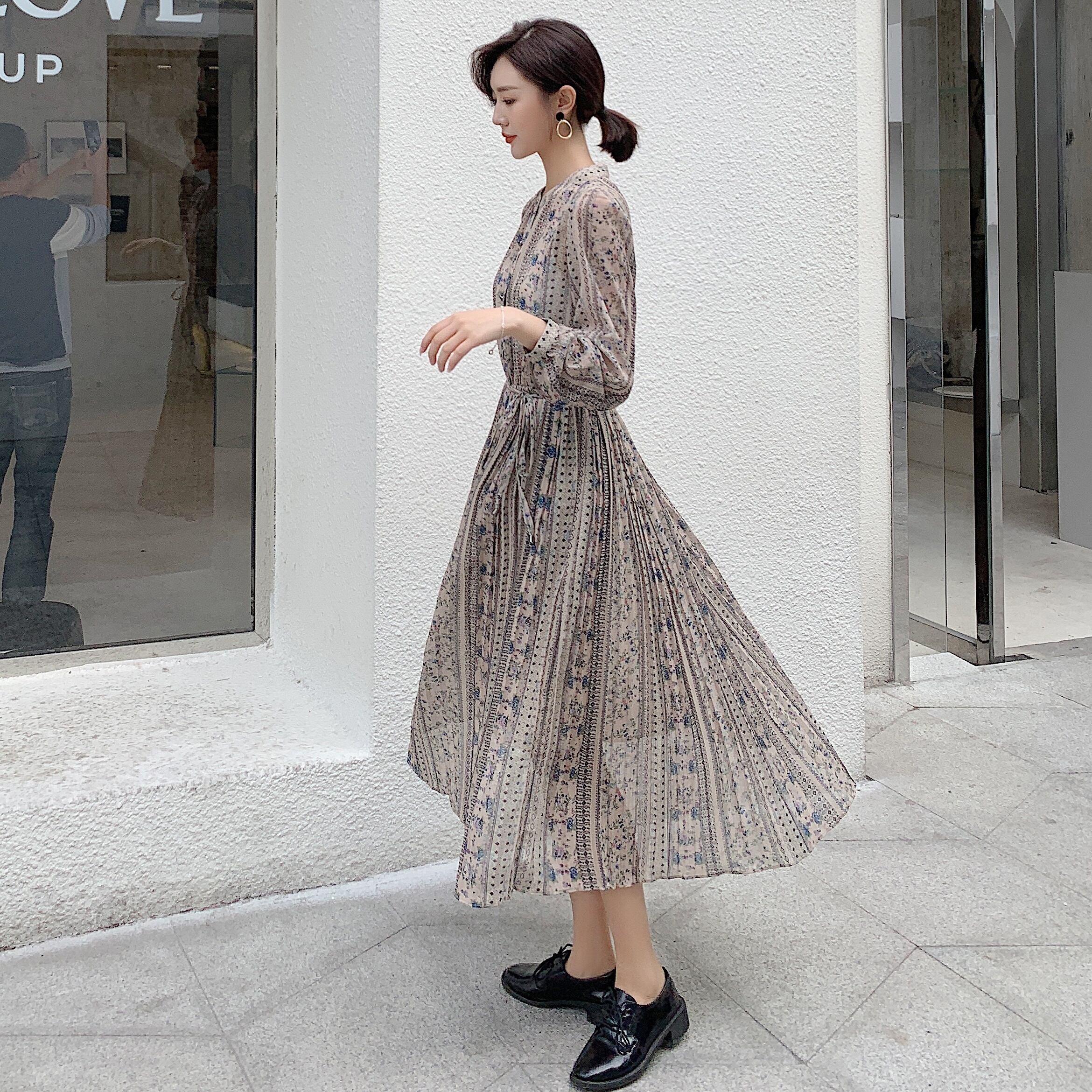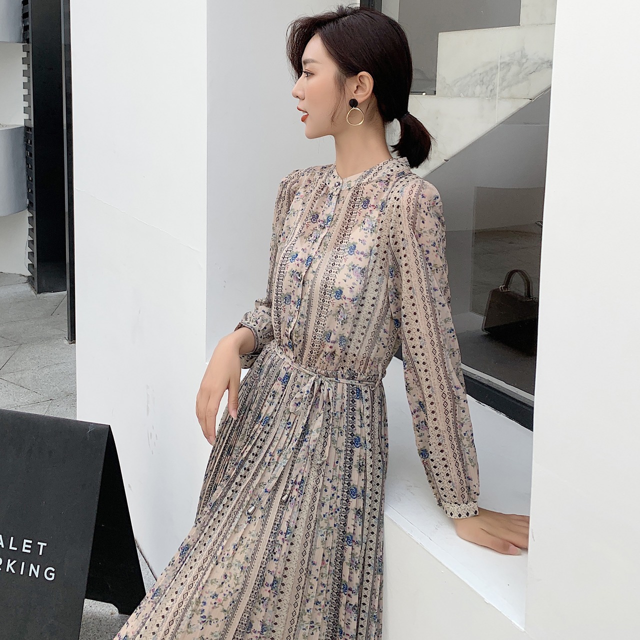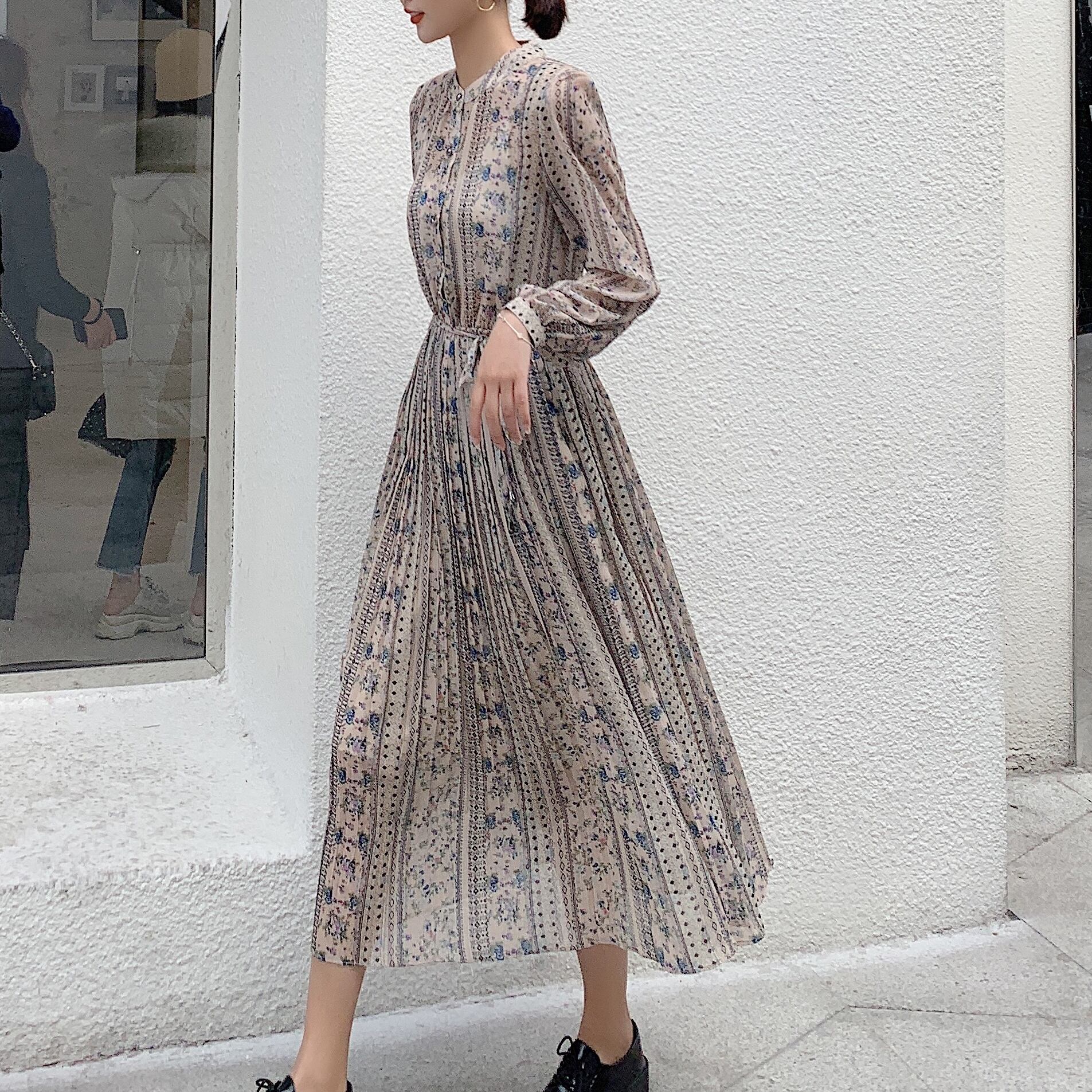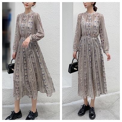 シフォンワンピース ドレス ロング丈 長袖 花柄 上品 エレガント 韓国 オルチャン デート クラシカル フェミニン 春夏 秋冬