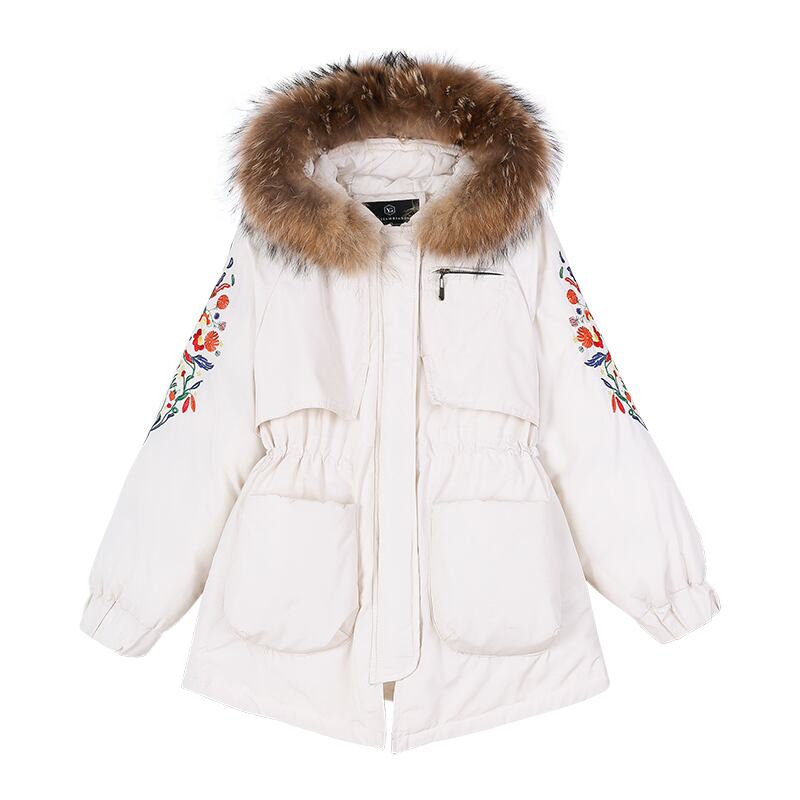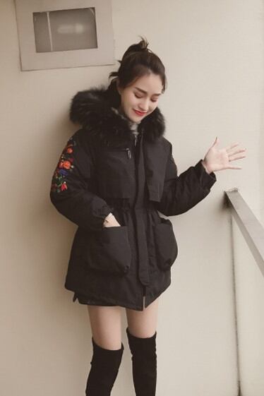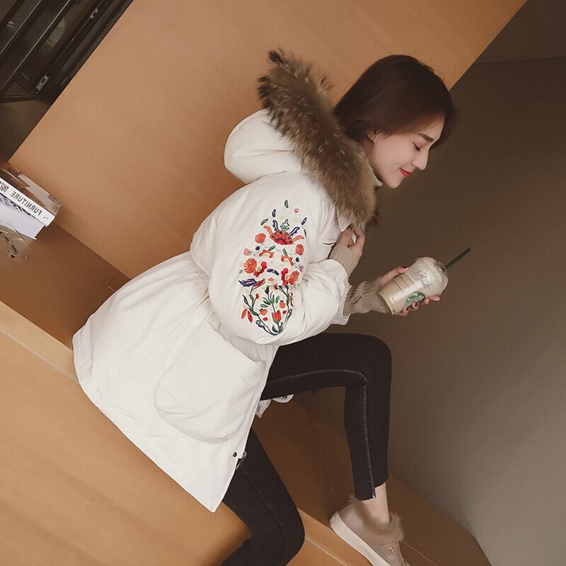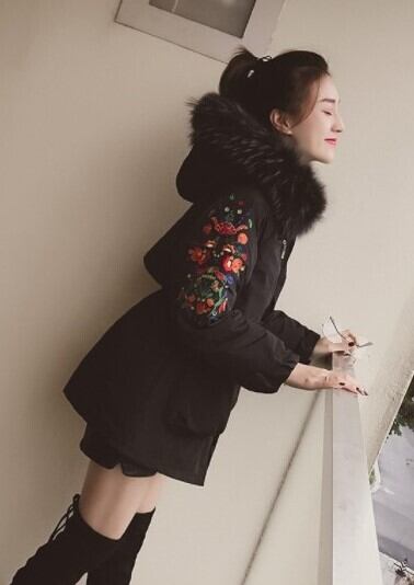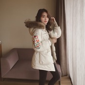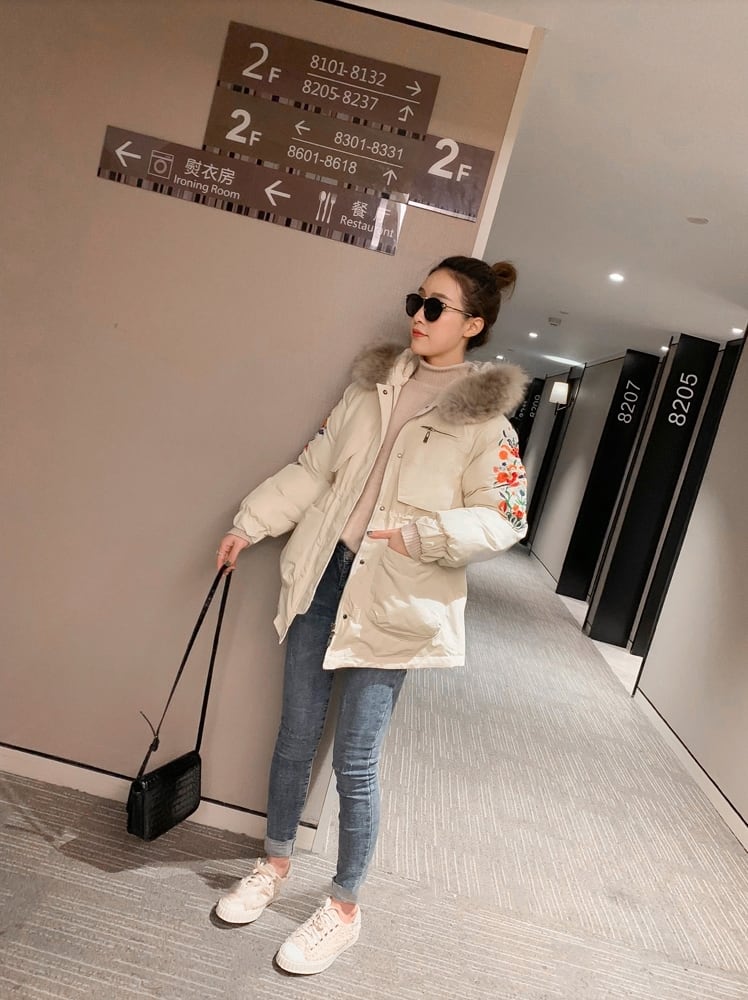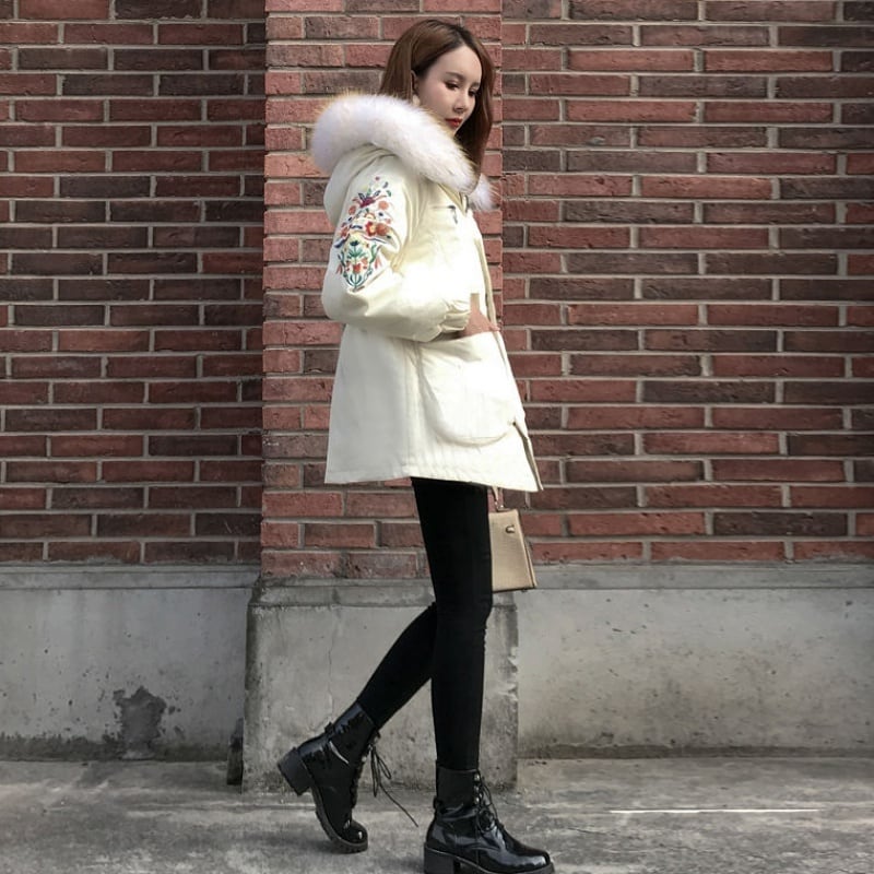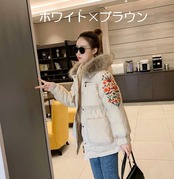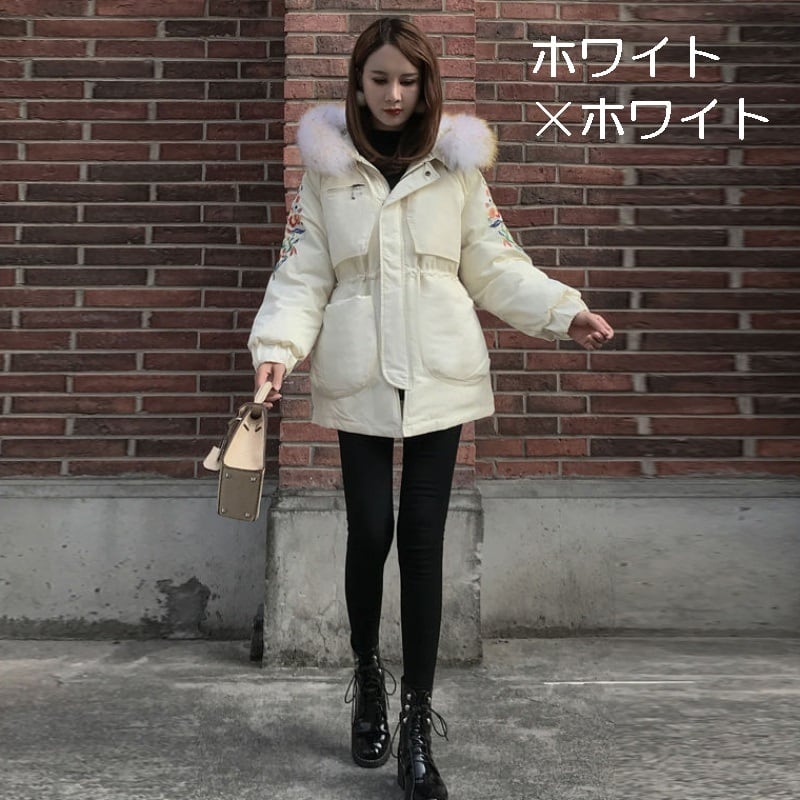 全3色 中綿コート アウター 羽織 防寒 刺繍 ミドル丈 ファー付き 大人カジュアル オフホワイト ブラック 休日コーデ 秋 冬 韓国 オルチャン