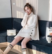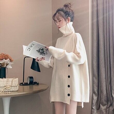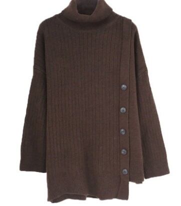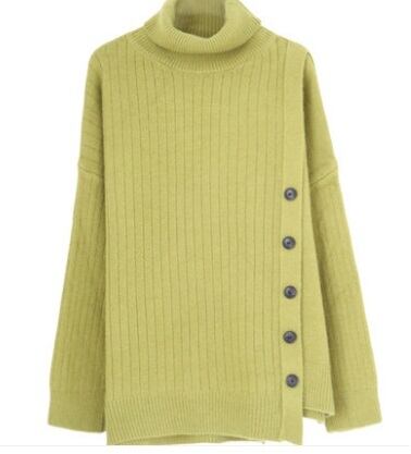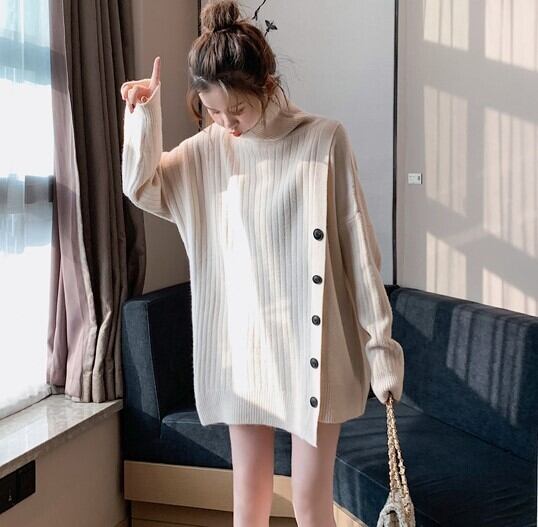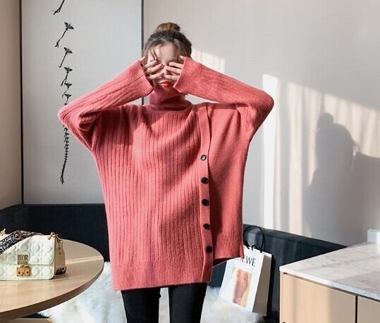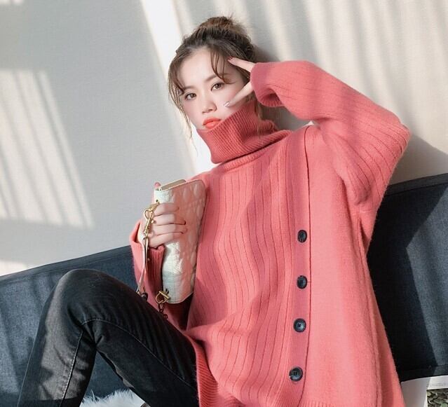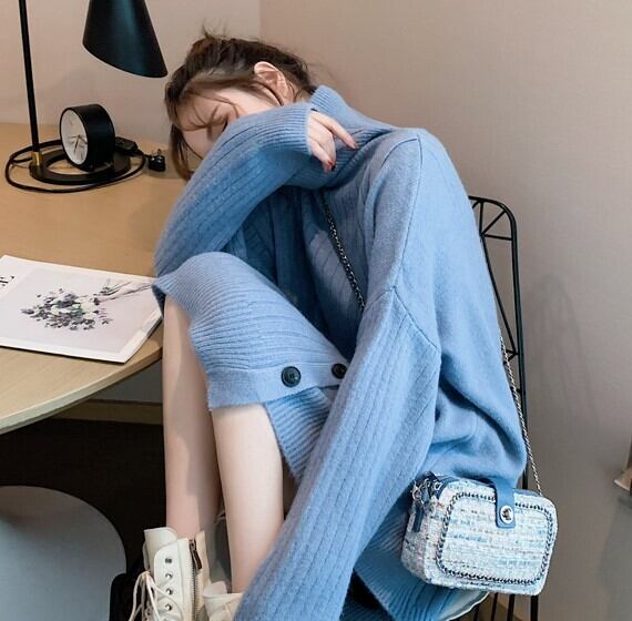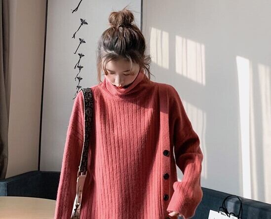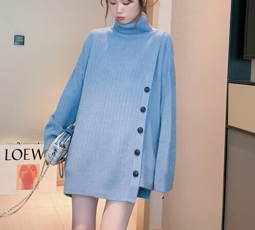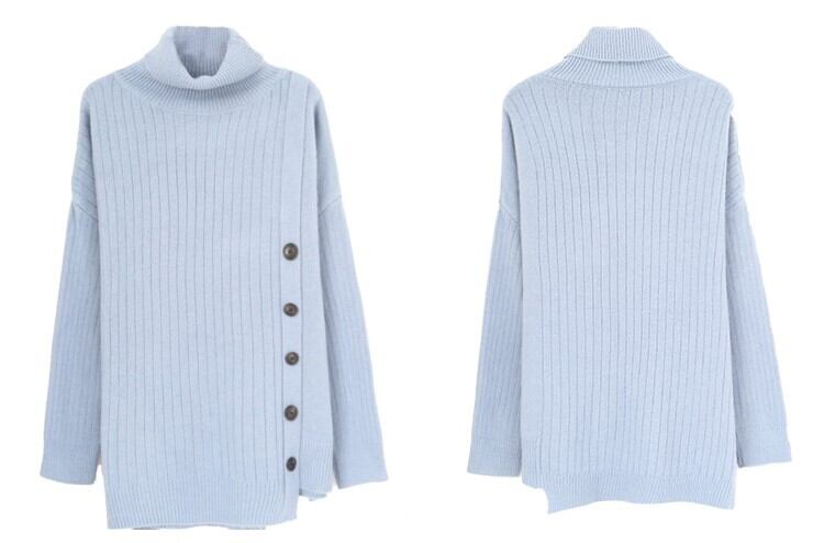 全6色 ニット セーター サイドボタン タートルネック リブニット ロング丈 長袖 ドロップショルダー 大人カジュアル ホワイト ブルー ピンク イエロー ベージュ ブラウン 韓国 オルチャン 学生 通学 休日コーデ