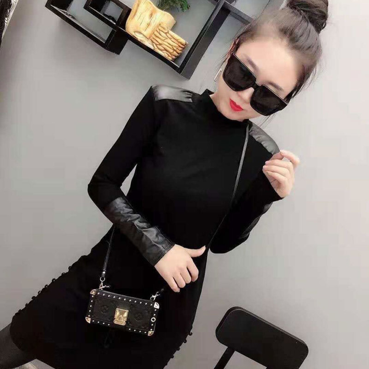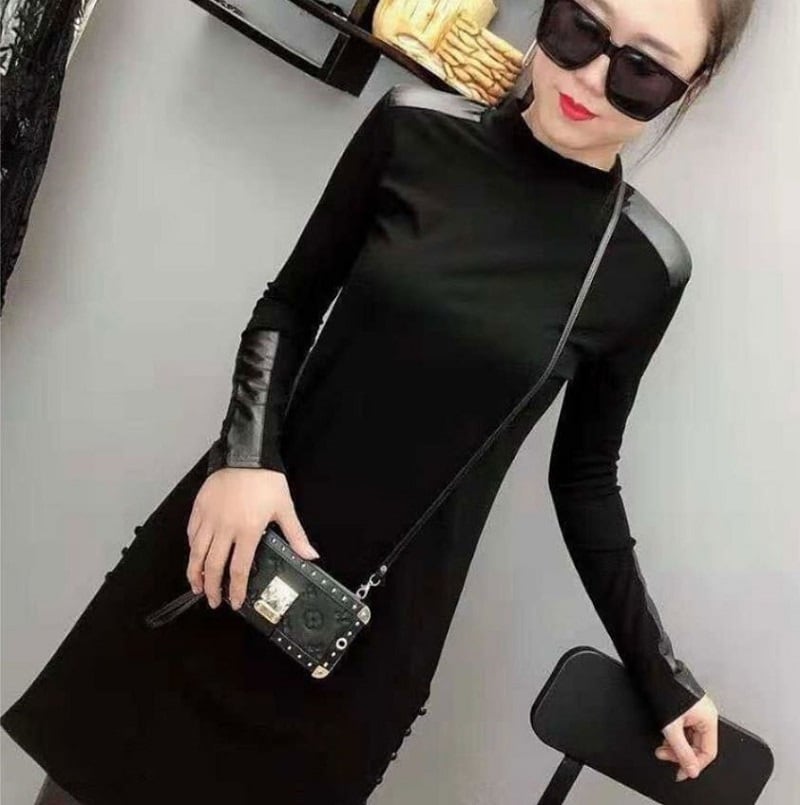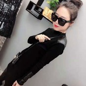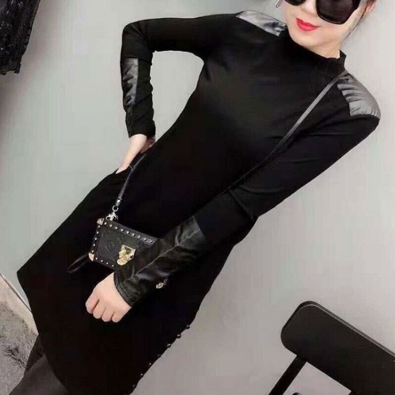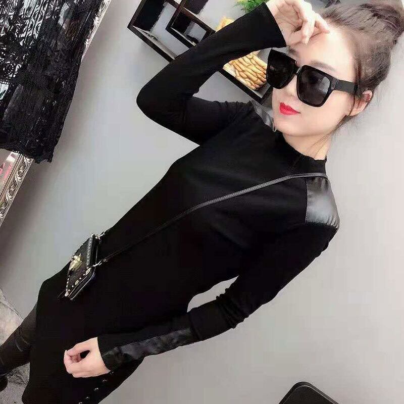 トップス Tシャツ ハイネック プルオーバー 長袖 無地 スリム PU カジュアル お出かけ デート デイリー ブラック 秋冬