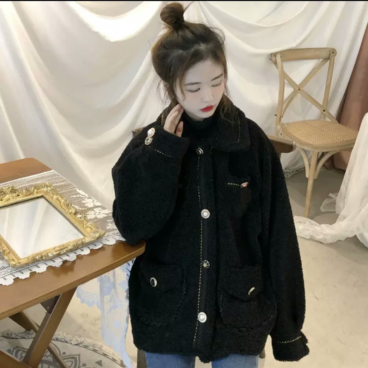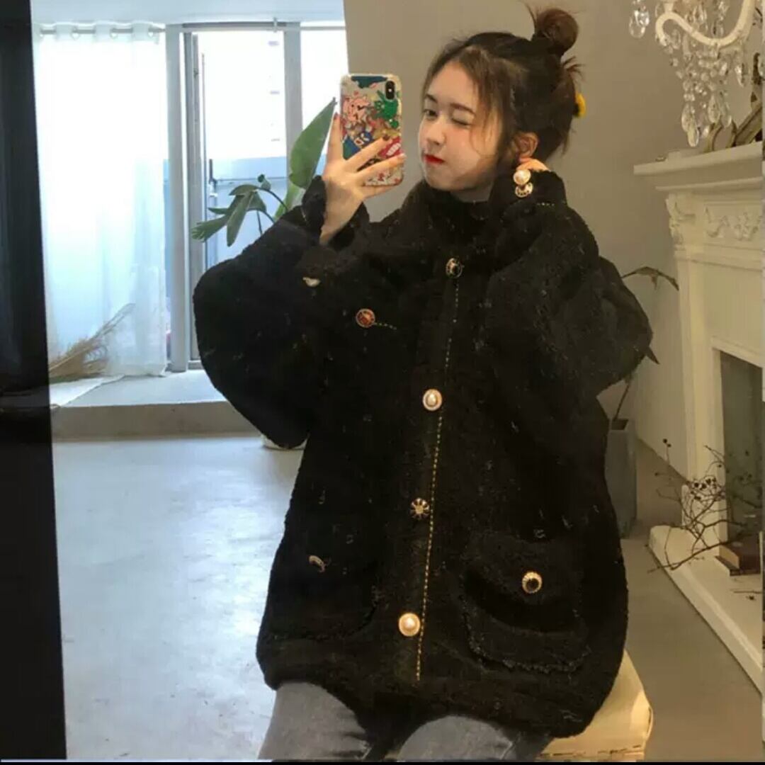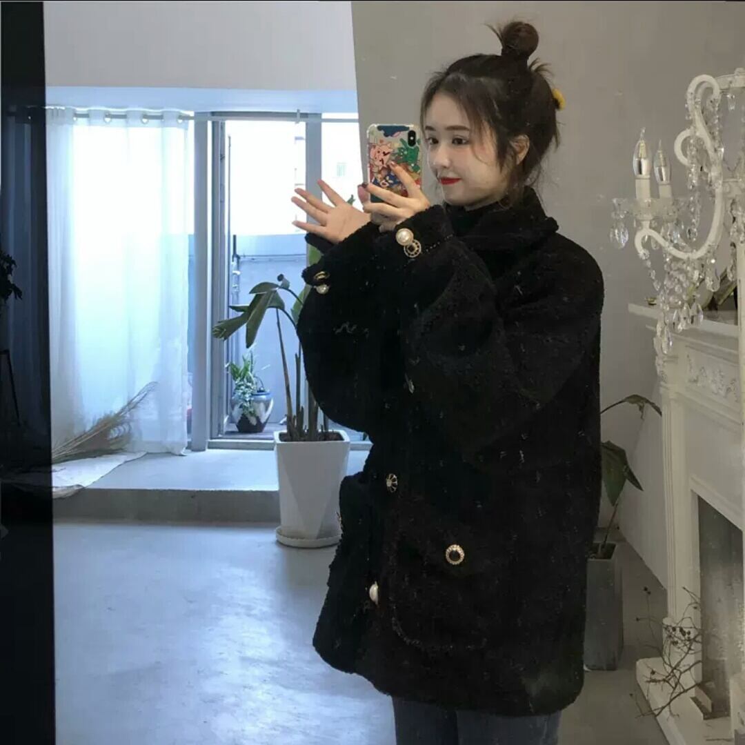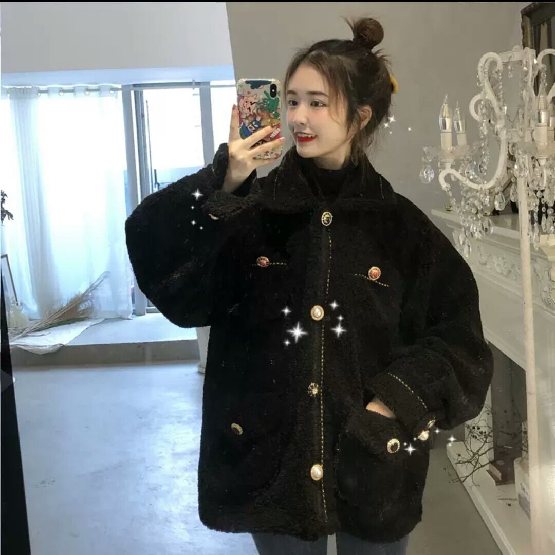 ボアジャケット アウター ボタン 黒 モコモコ 防寒 暖かい お出かけ お買い物 デート 女子会 秋冬 春 通学 学生 通勤