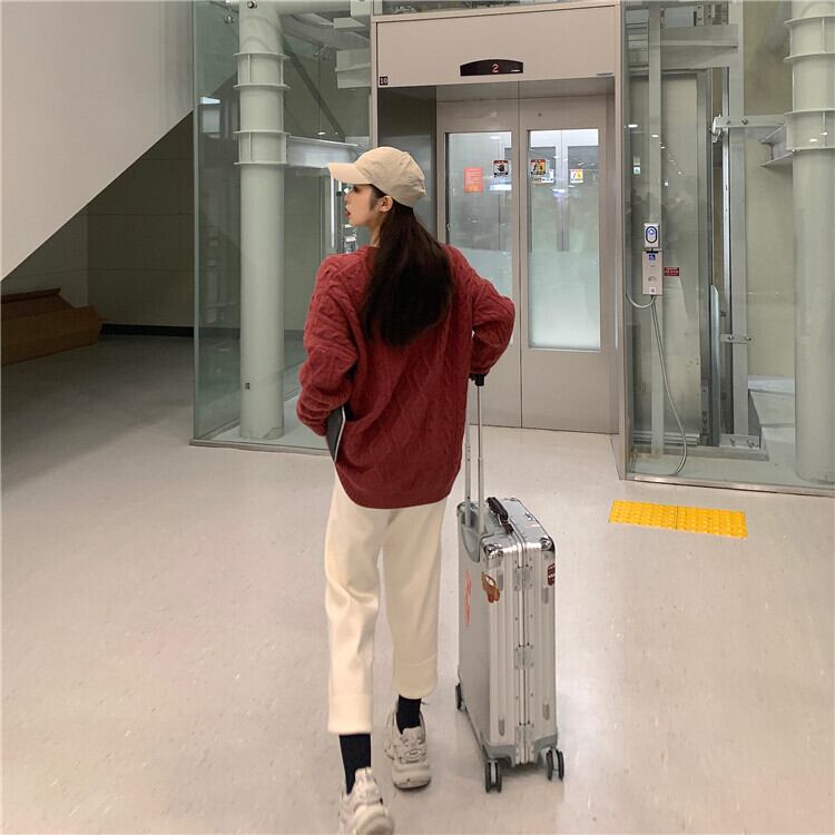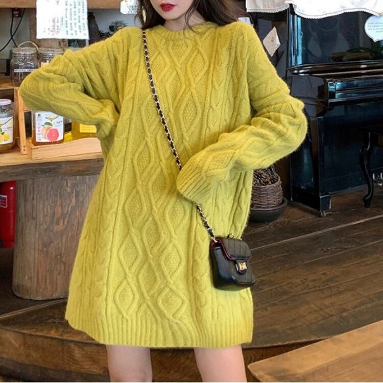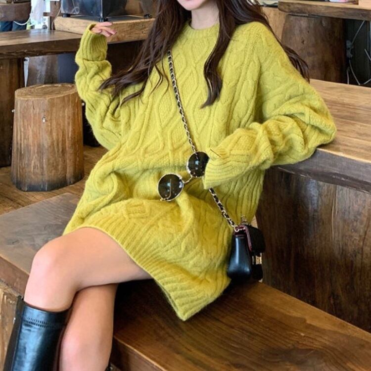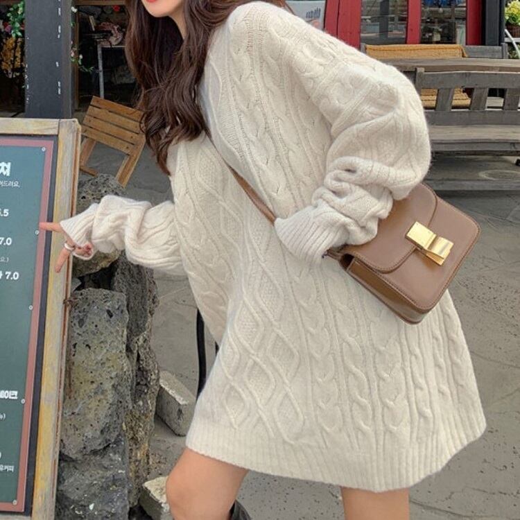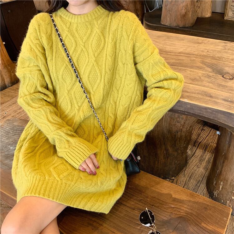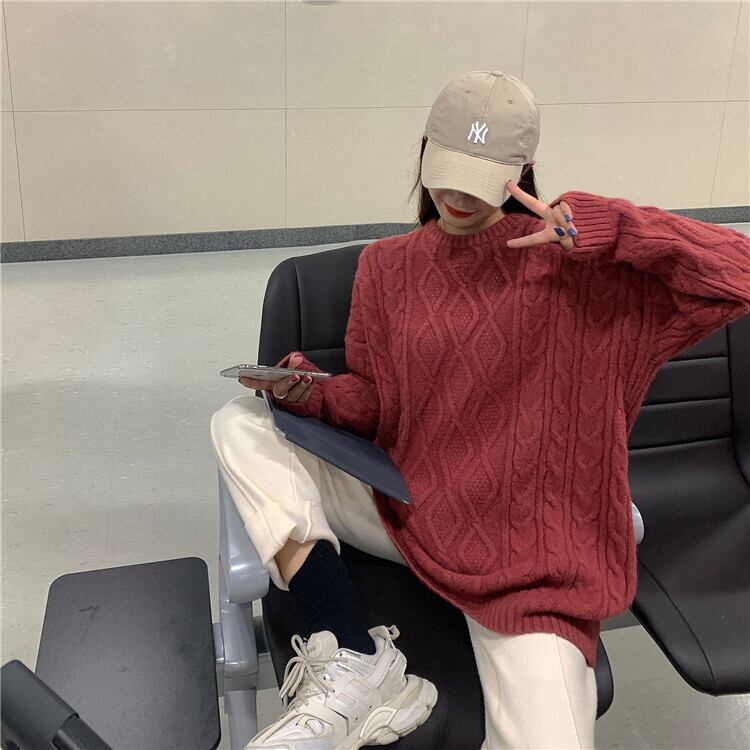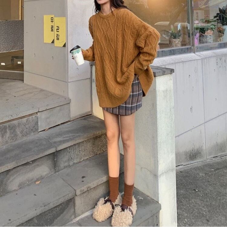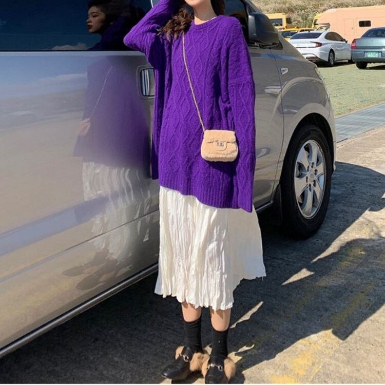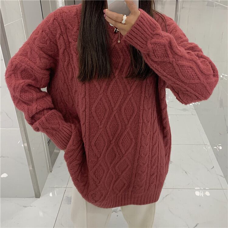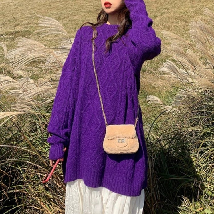 全6色 ケーブルニット セーター ラウンドネック オーバーサイズ ビックシルエット カジュアル お出かけ デート デイリー 普段着 アプリコット パープル ブラウン ピンク イエロー グレー 秋冬