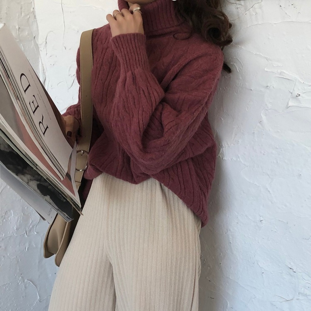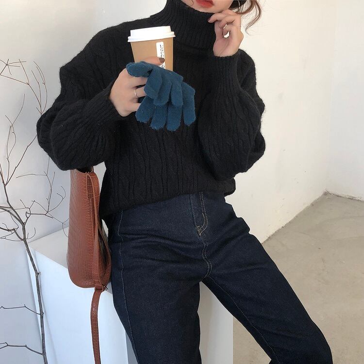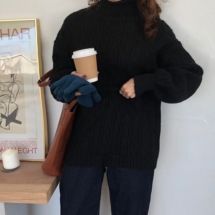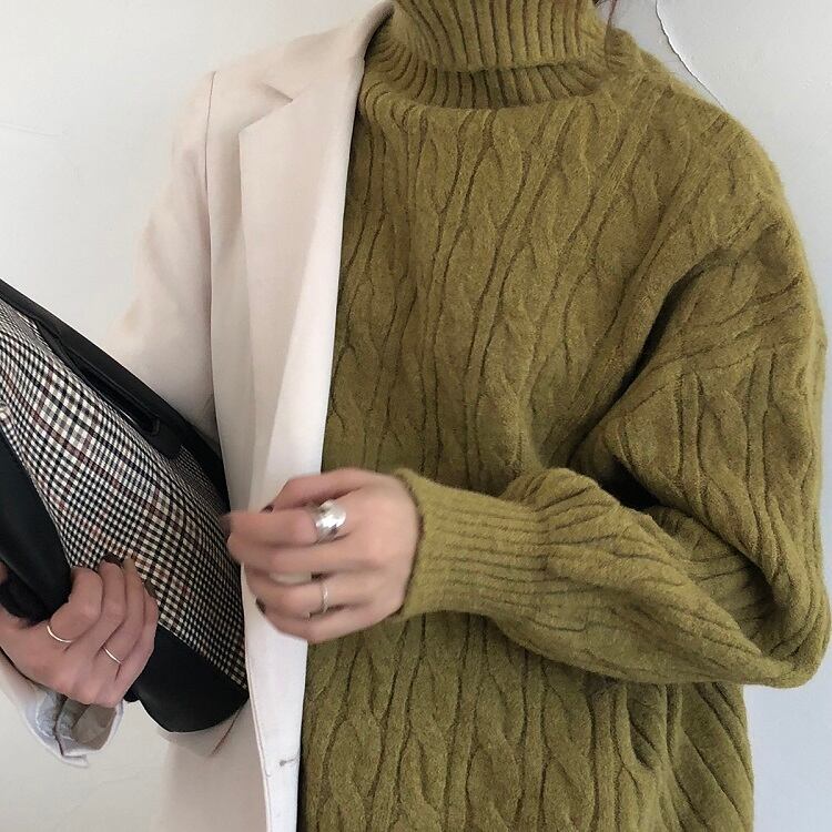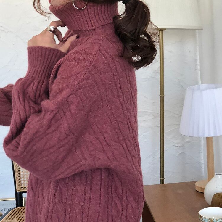 全4色 タートルネック ケーブルニット セーター ゆったり カジュアル お出かけ デート デイリー 普段着 ホワイト ブラック グリーン ピンク 秋冬