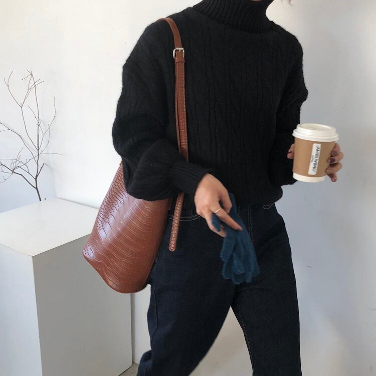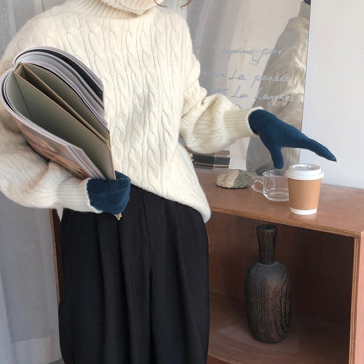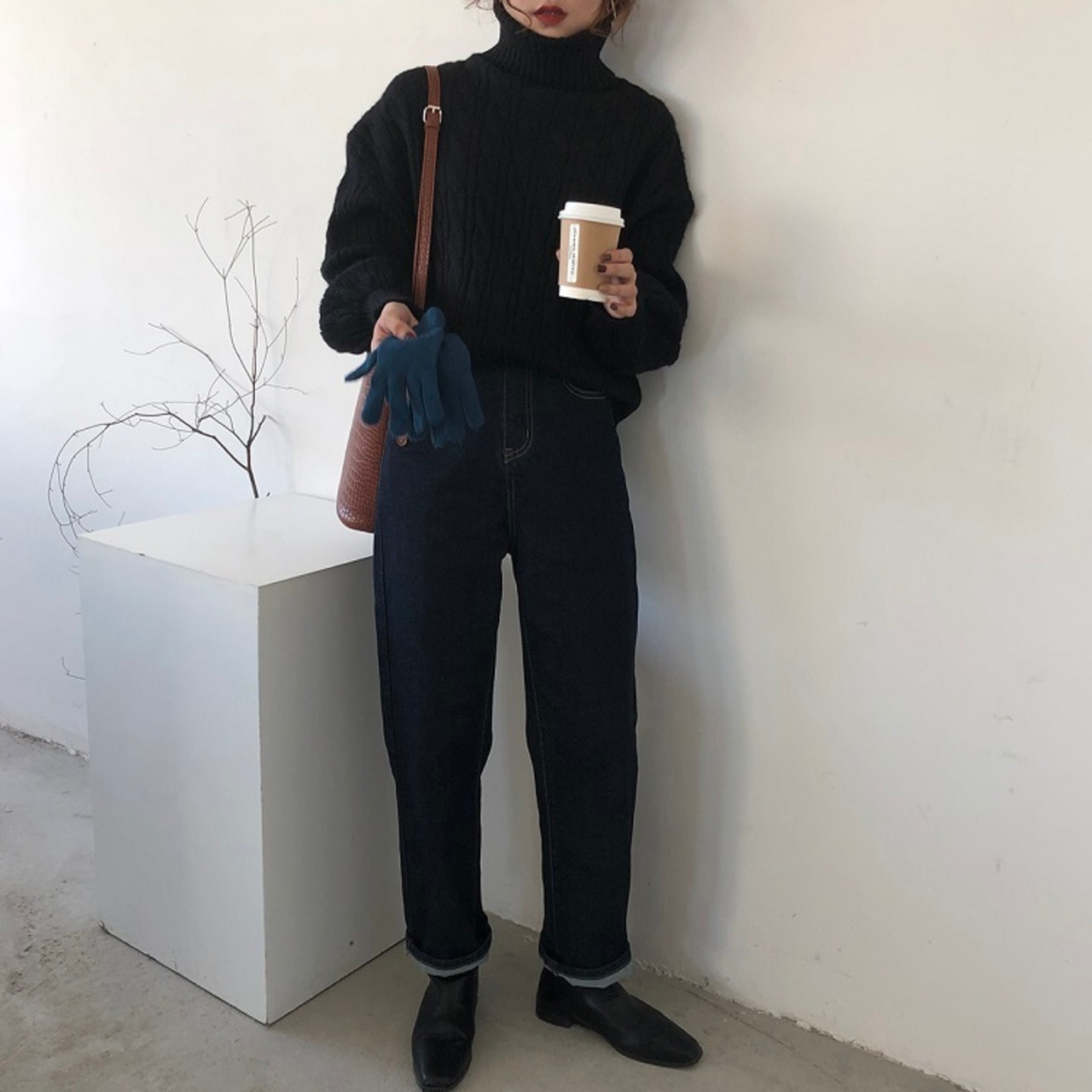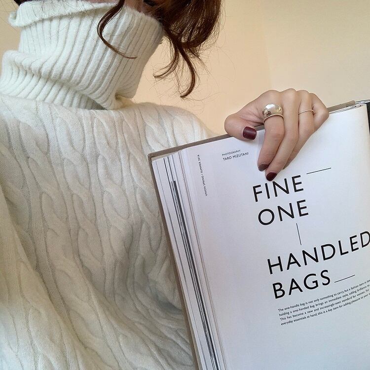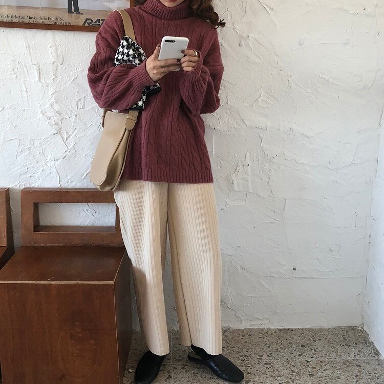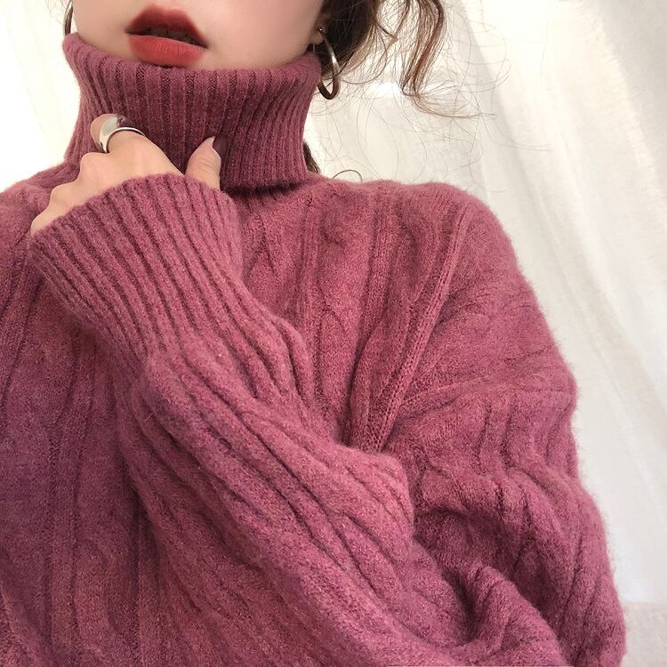 全4色 タートルネック ケーブルニット セーター ゆったり カジュアル お出かけ デート デイリー 普段着 ホワイト ブラック グリーン ピンク 秋冬
