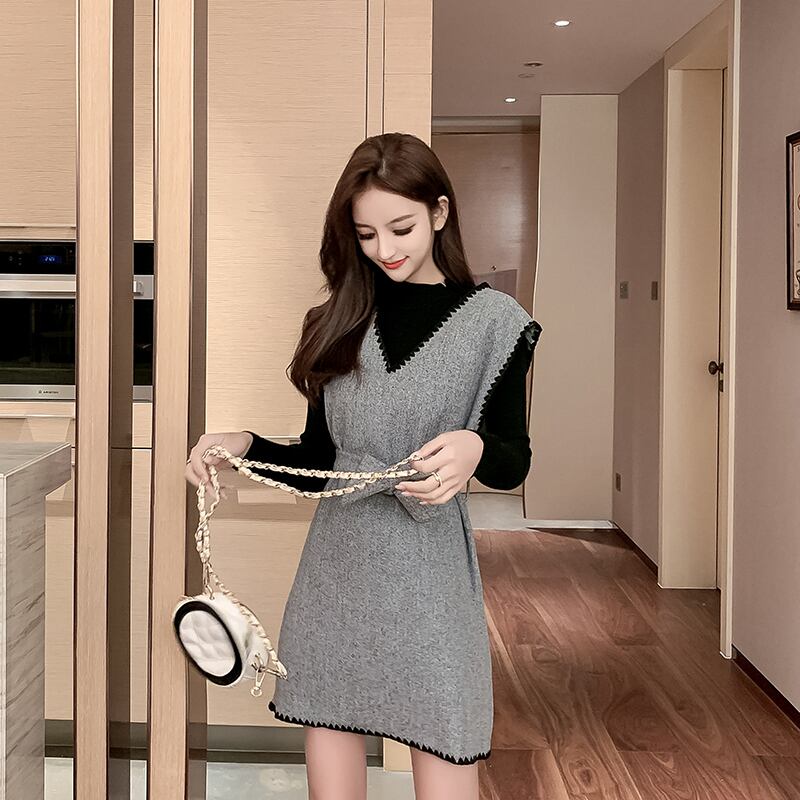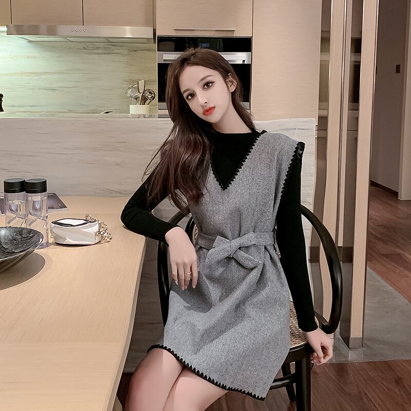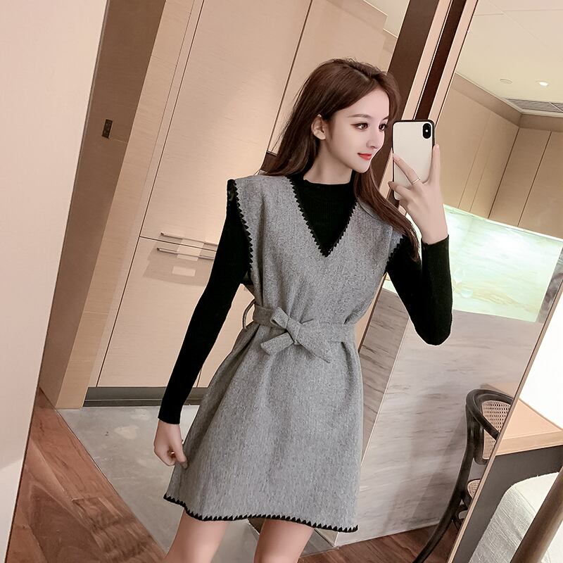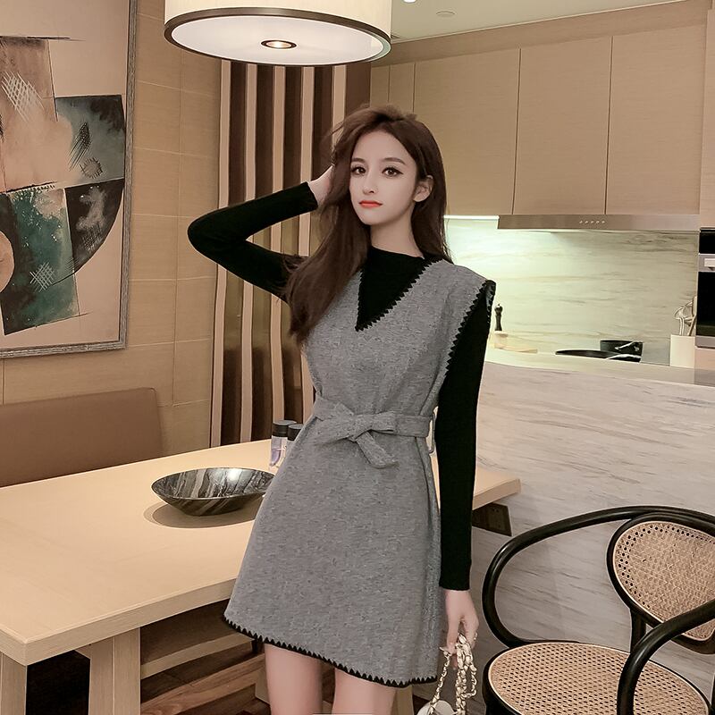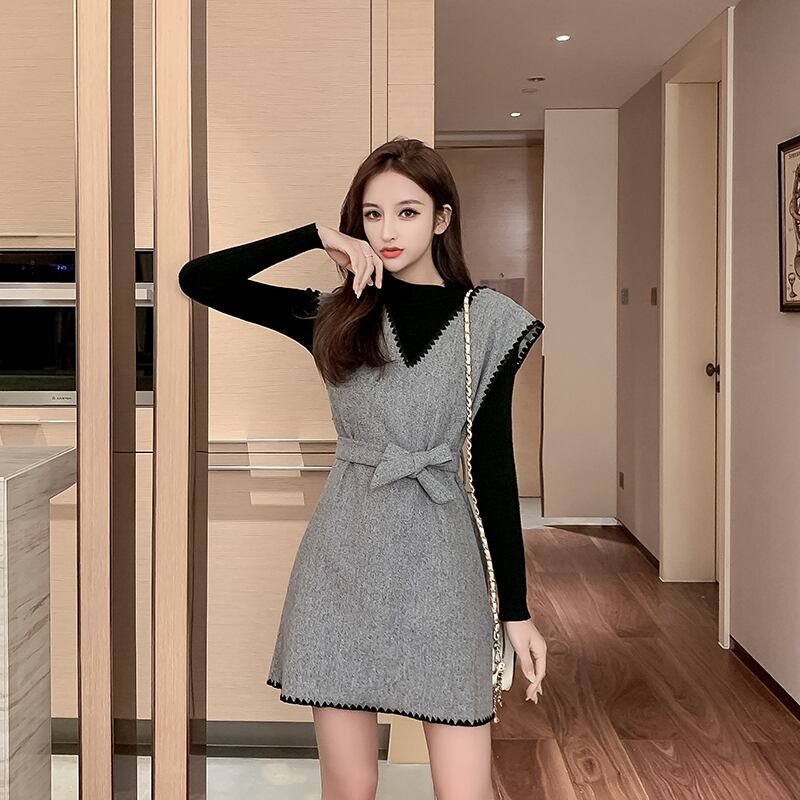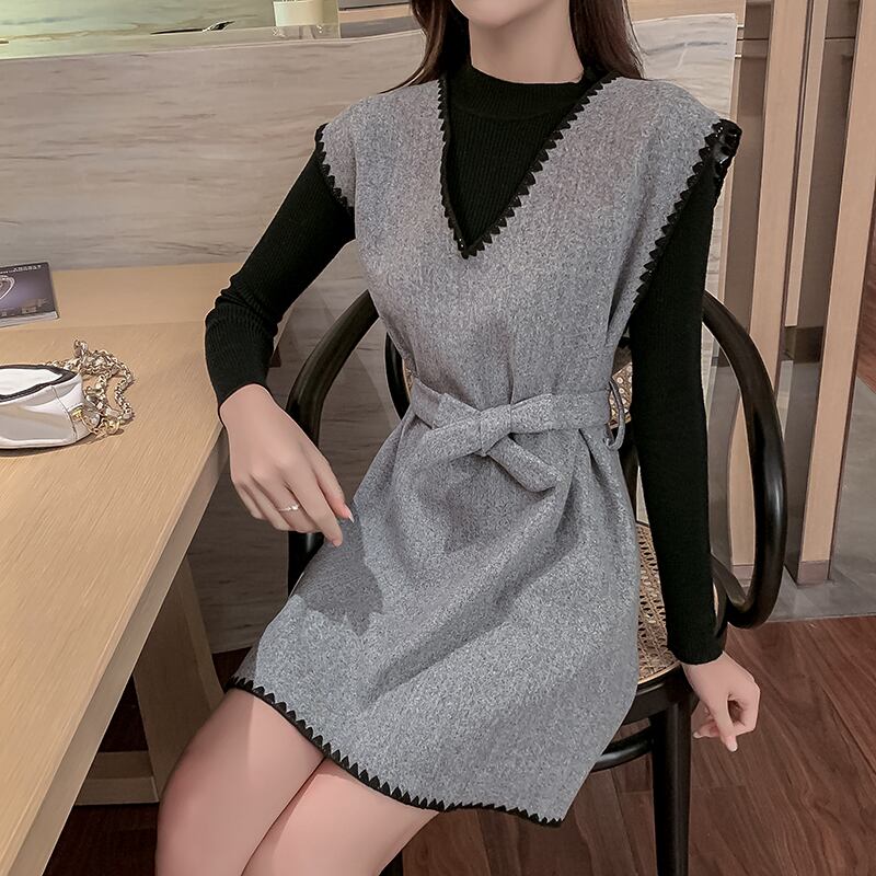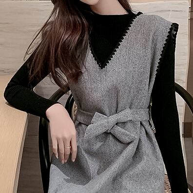 セットアップ ワンピース ミニ丈 ウエストマーク Vネック 長袖 トップス クルーネック ステッチ リボン コーデセット 秋冬 お出かけ デート 女子会 きれいめ カジュアル 大人可愛い フェミニン ガーリー スタイルアップ 脚長効果