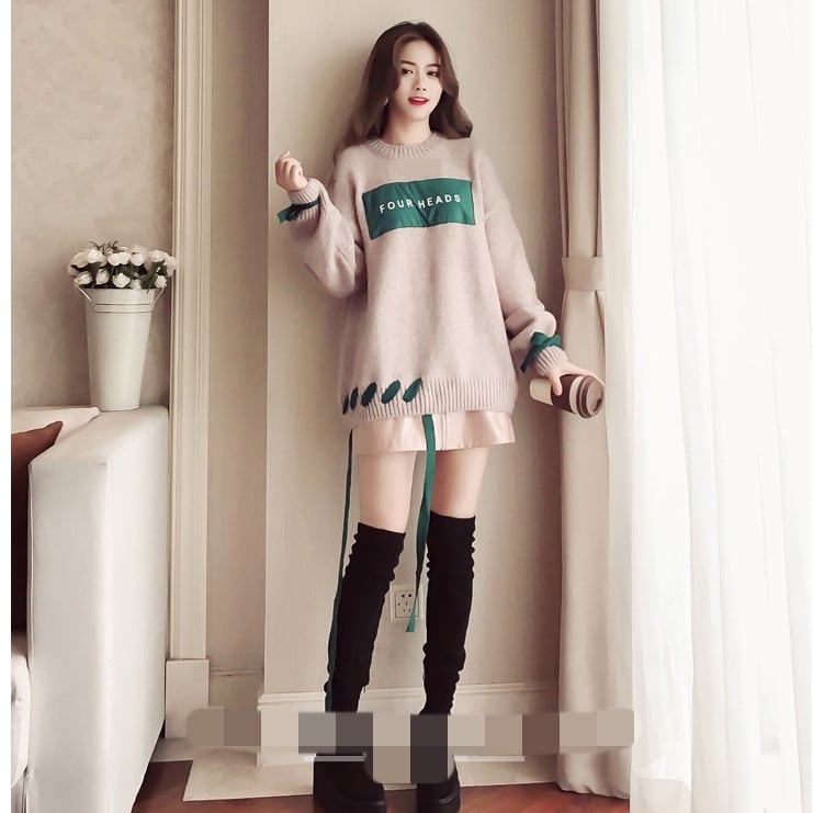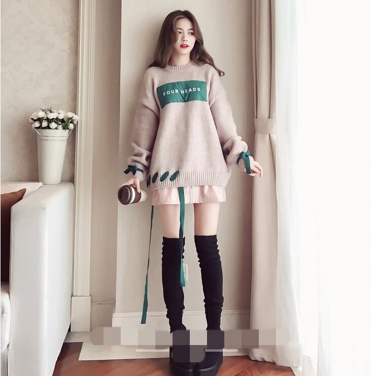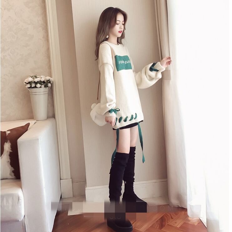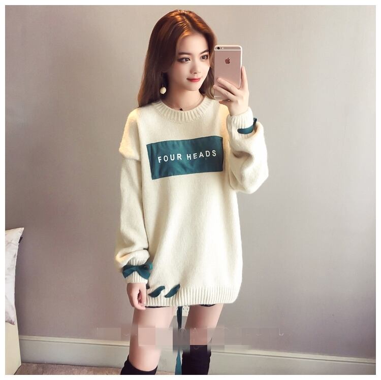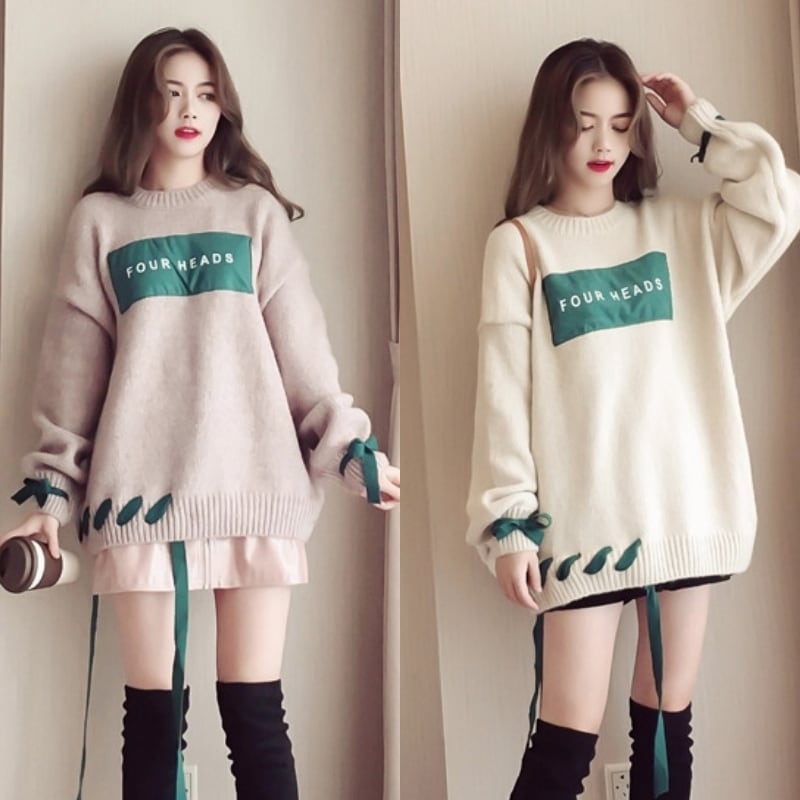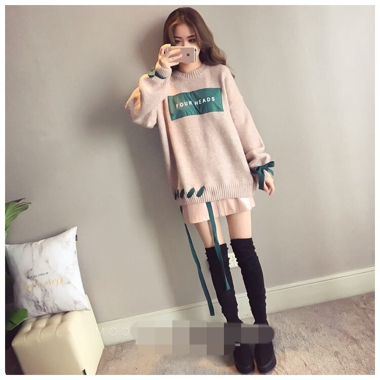 全2色 セーター クルーネック 長袖 プルオーバー ニット ゆったり ミディアム丈 チュニック丈 ロゴ リボン 秋冬 お出かけ デート 女子会 カジュアル 大人可愛い ガーリー フェミニン くすみカラー パステルカラー