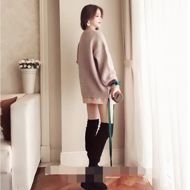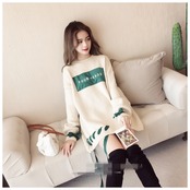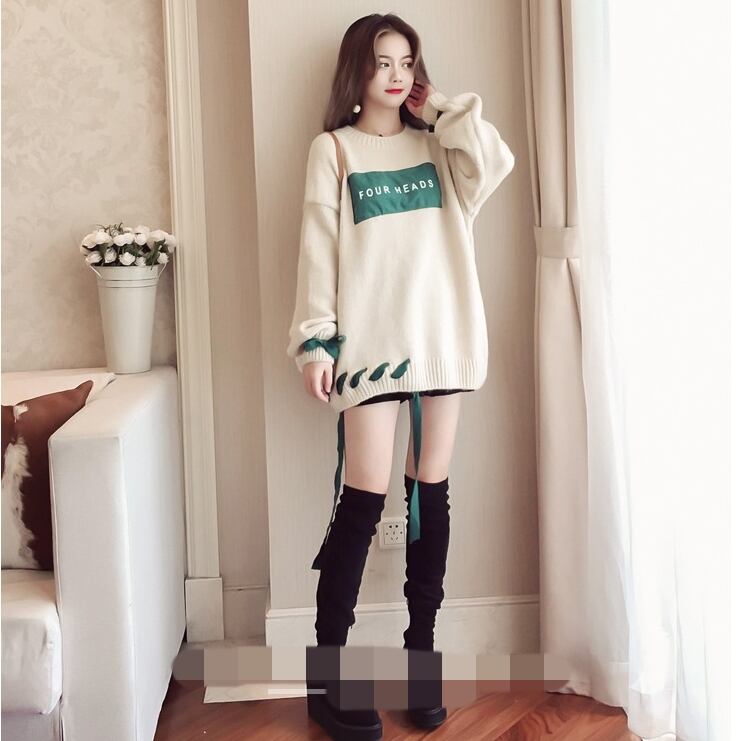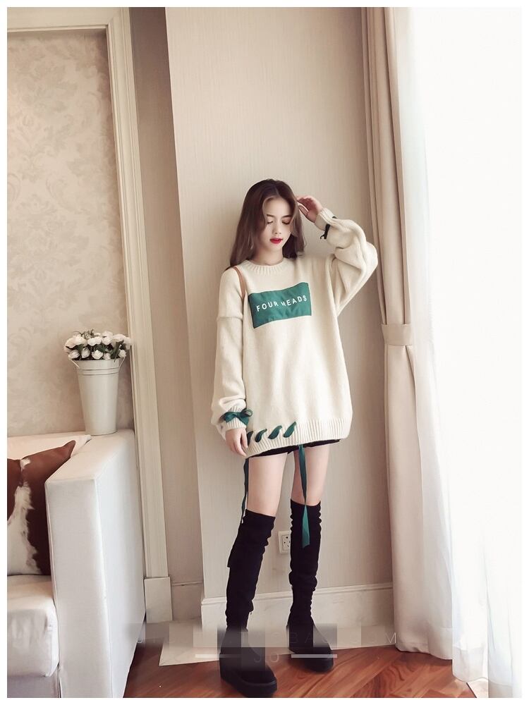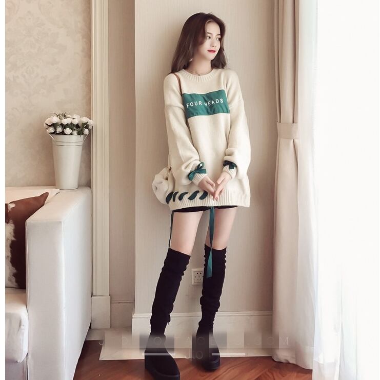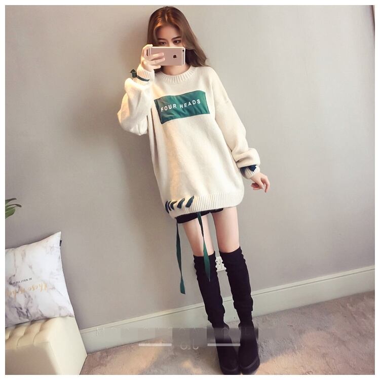 全2色 セーター クルーネック 長袖 プルオーバー ニット ゆったり ミディアム丈 チュニック丈 ロゴ リボン 秋冬 お出かけ デート 女子会 カジュアル 大人可愛い ガーリー フェミニン くすみカラー パステルカラー