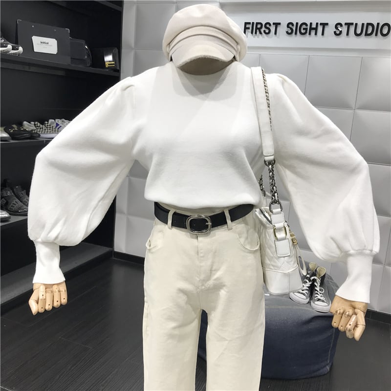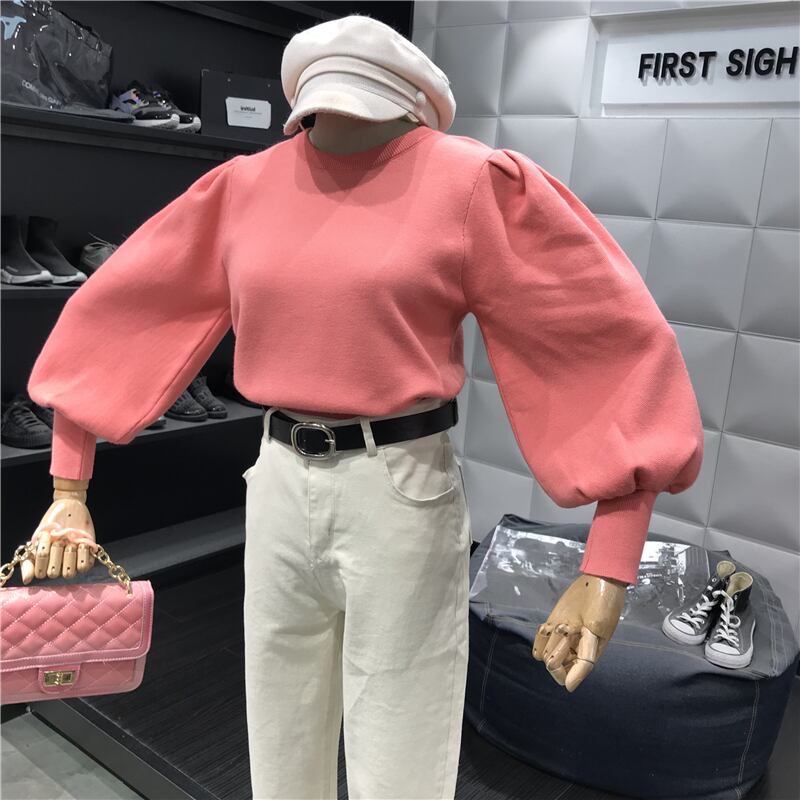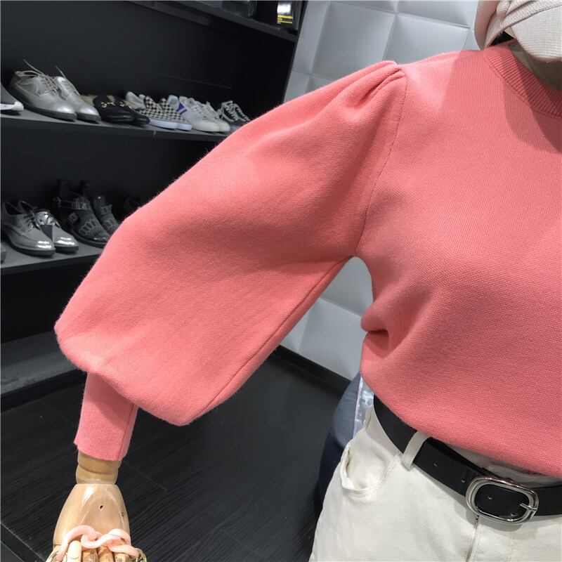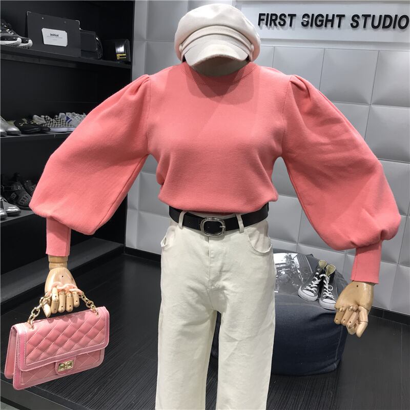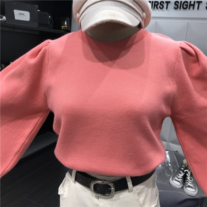 全2色 ニットトップス セーター ラウンドネック ランタンスリーブ 薄手 無地 お出かけ カジュアル 無地 デート ホワイト ピンク 秋冬