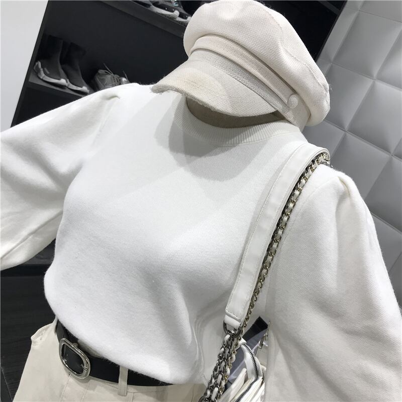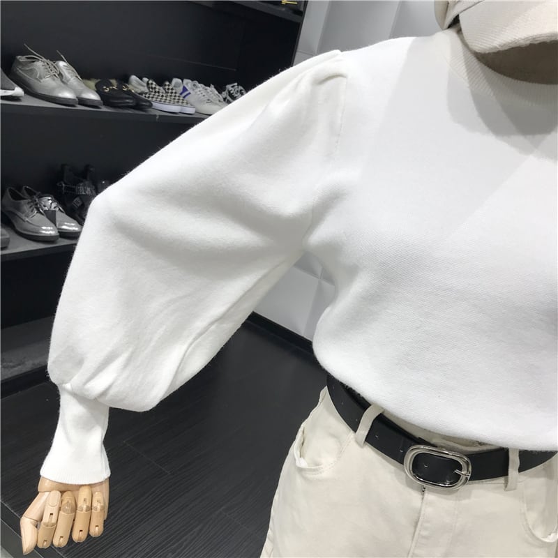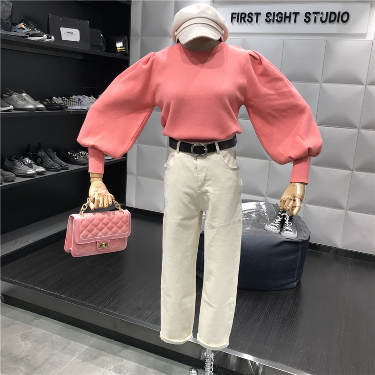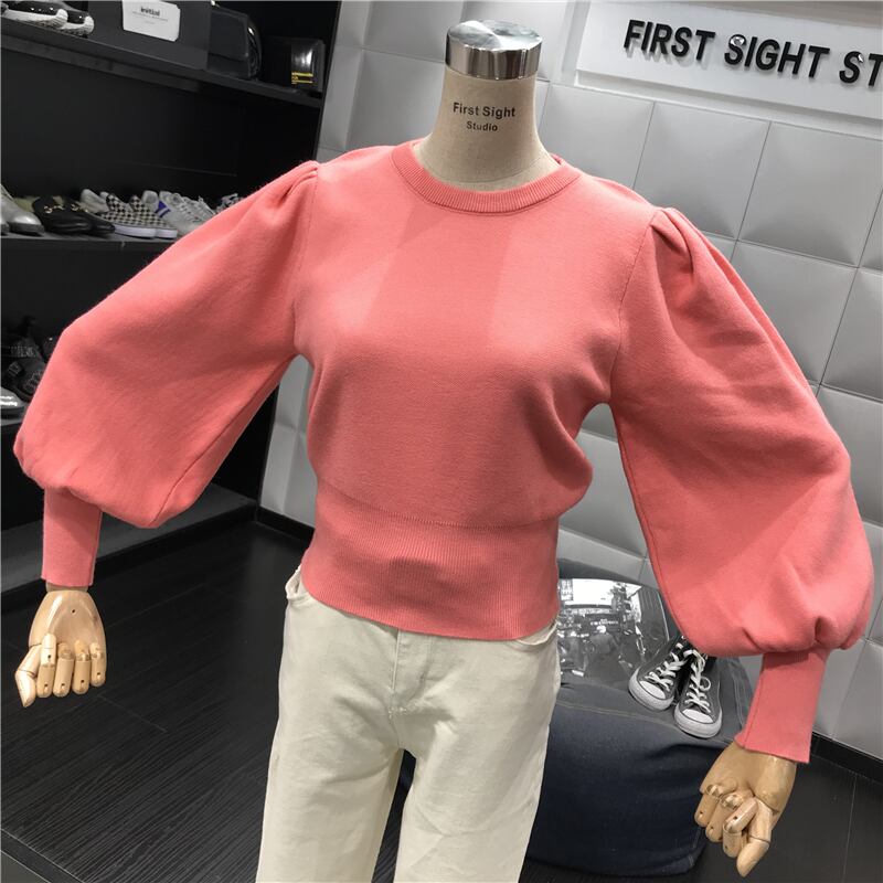 全2色 ニットトップス セーター ラウンドネック ランタンスリーブ 薄手 無地 お出かけ カジュアル 無地 デート ホワイト ピンク 秋冬