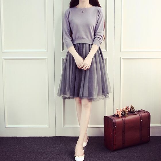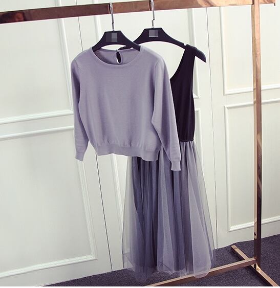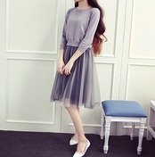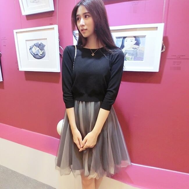 セットアップ 2点セット ツーピース ワンピース プルオーバー チュール モノトーン フレア ひざ丈 ラウンドネック ガーリー 可愛い 秋 春 冬