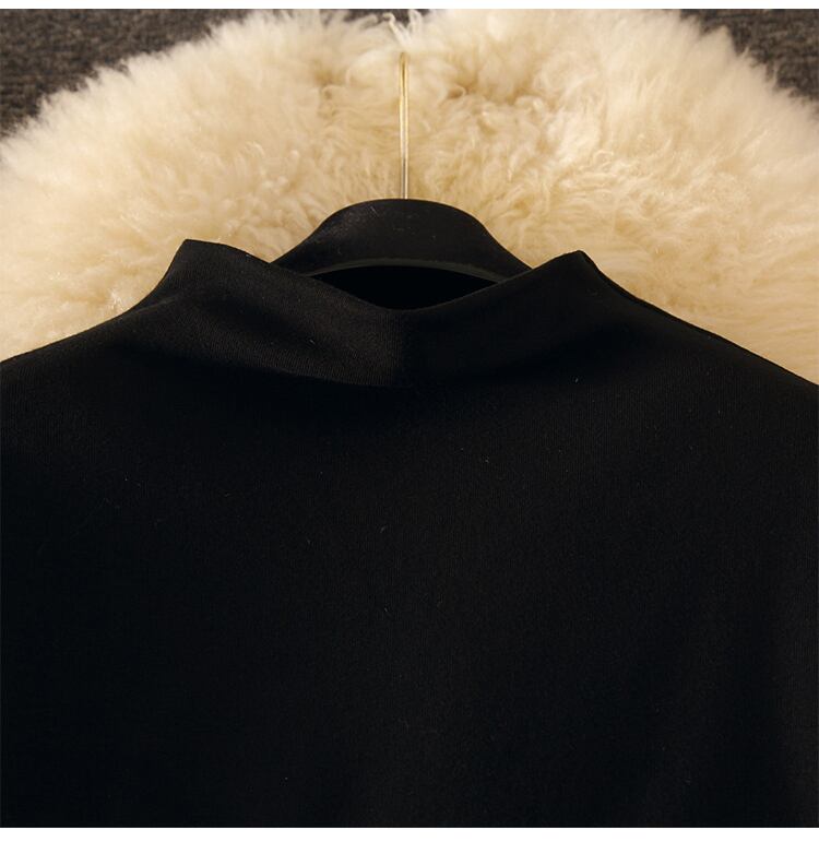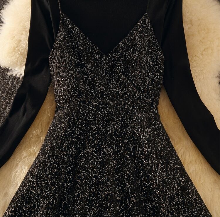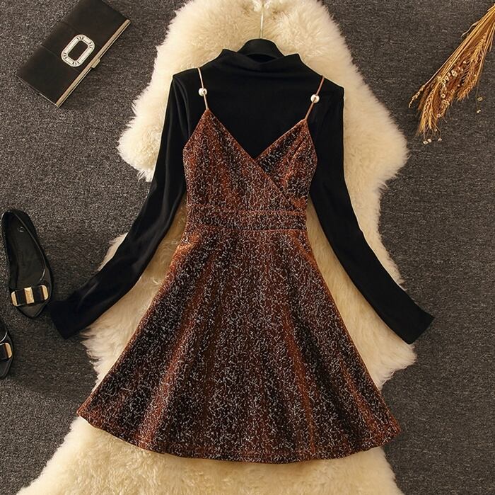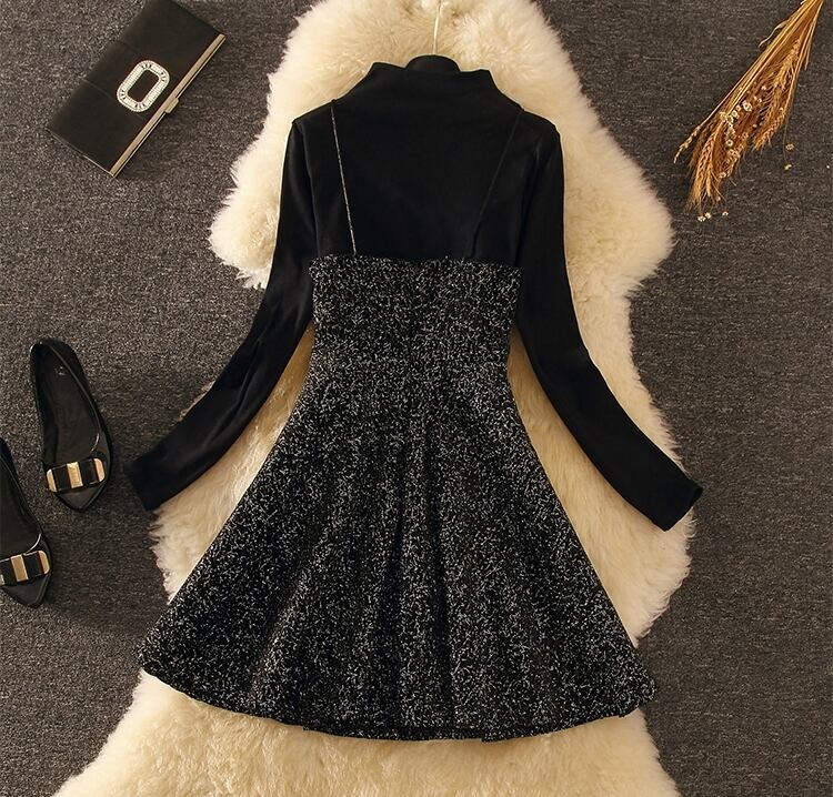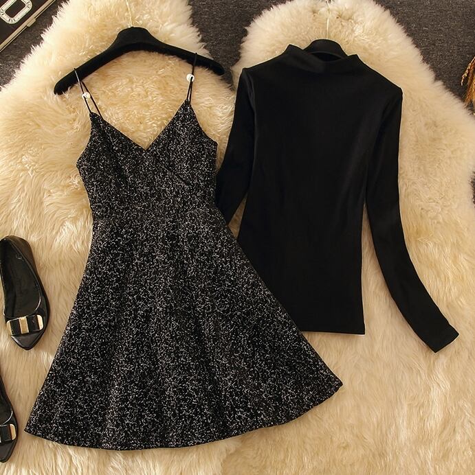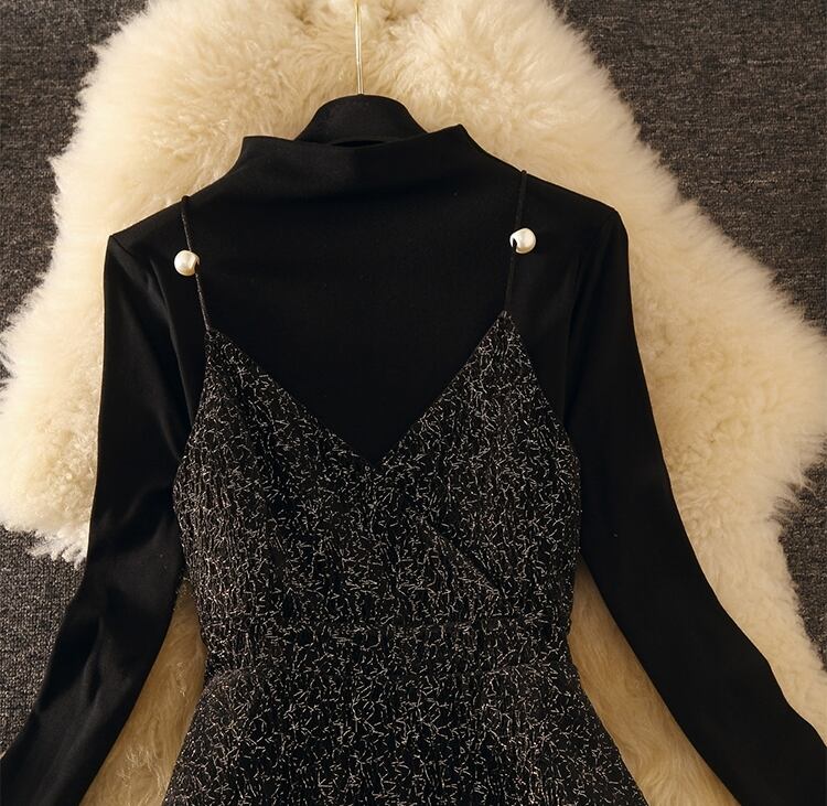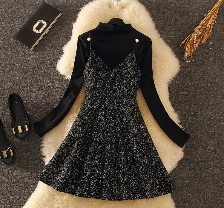 全2色セットアップ ツーピース 2点セット プルオーバー パール カットソー ワンピース キャミワンピース Aライン フレア ハイネック カジュアル きれいめ 大人可愛い デート 女子会 お呼ばれ 秋 春 冬